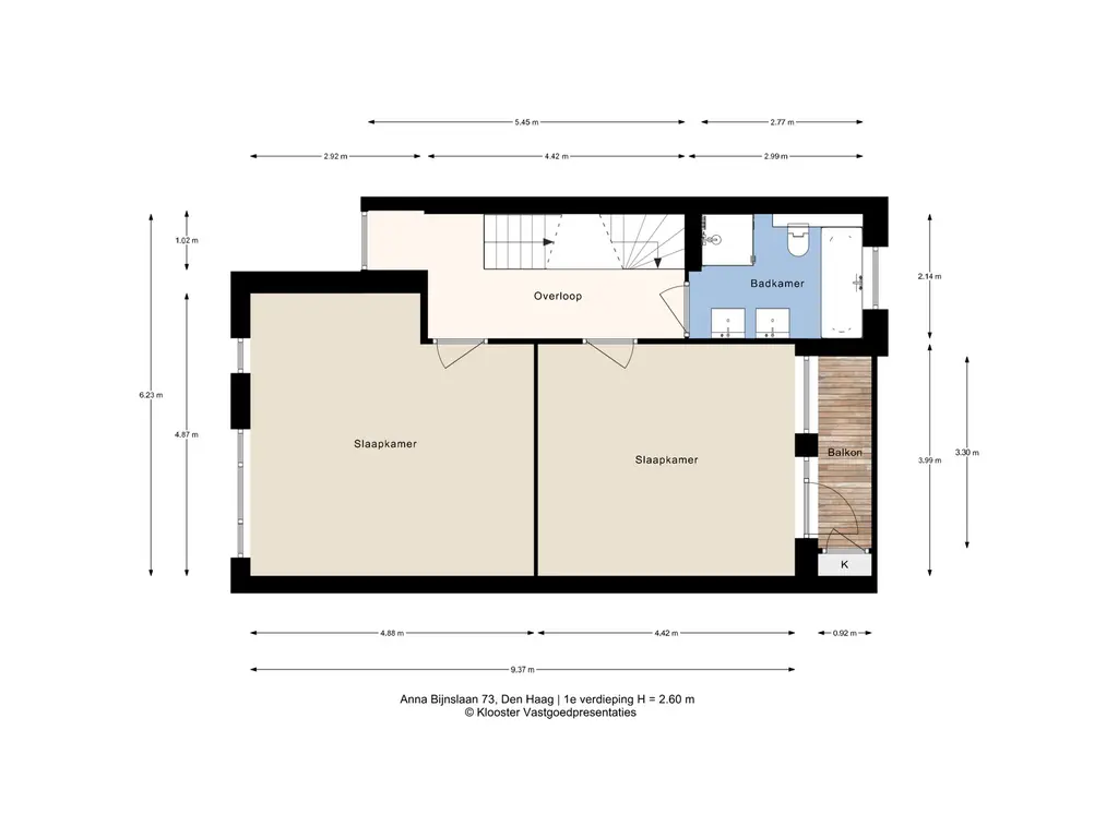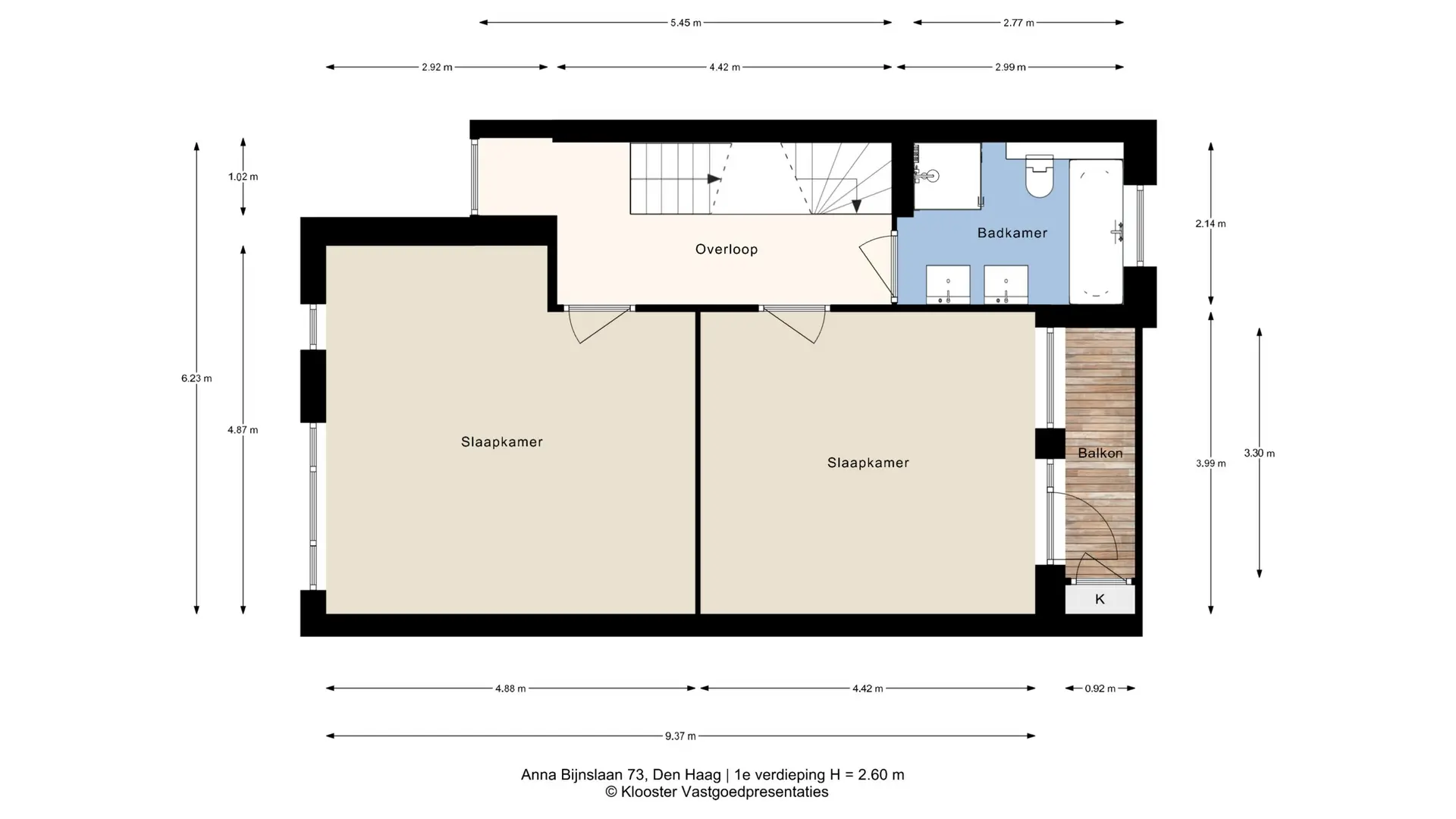 Op de eerste verdieping tref je twee zeer ruime slaapkamers, de achterslaapkamer geeft toegang tot het eerste balkon. De overloop laat nog mooi het oorspronkelijke portiekwoning-entree zien, inclusief het kenmerkende glas-in-lood. De badkamer is voorzien van een ligbad, een douchecabine en een wastafelmeubel.