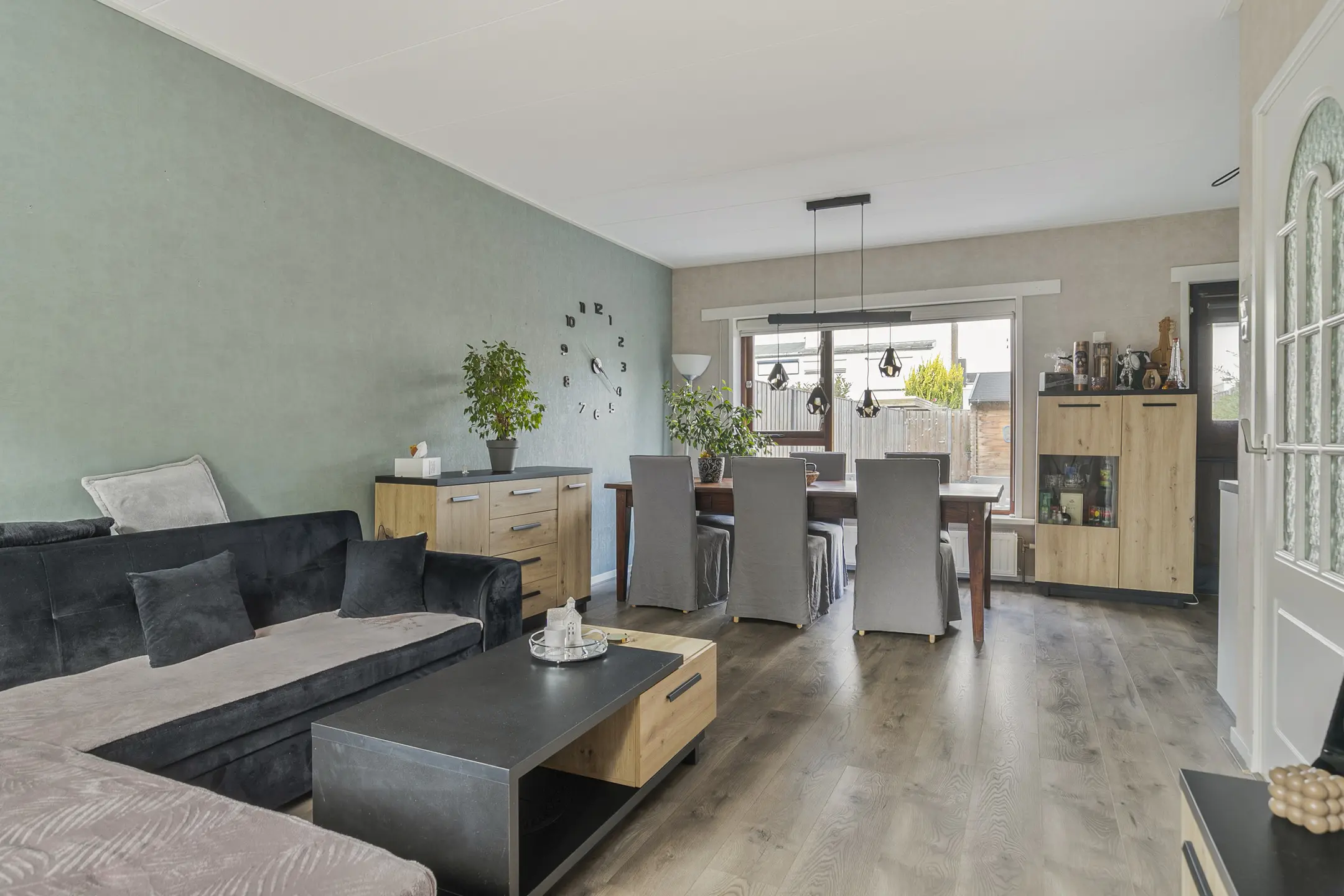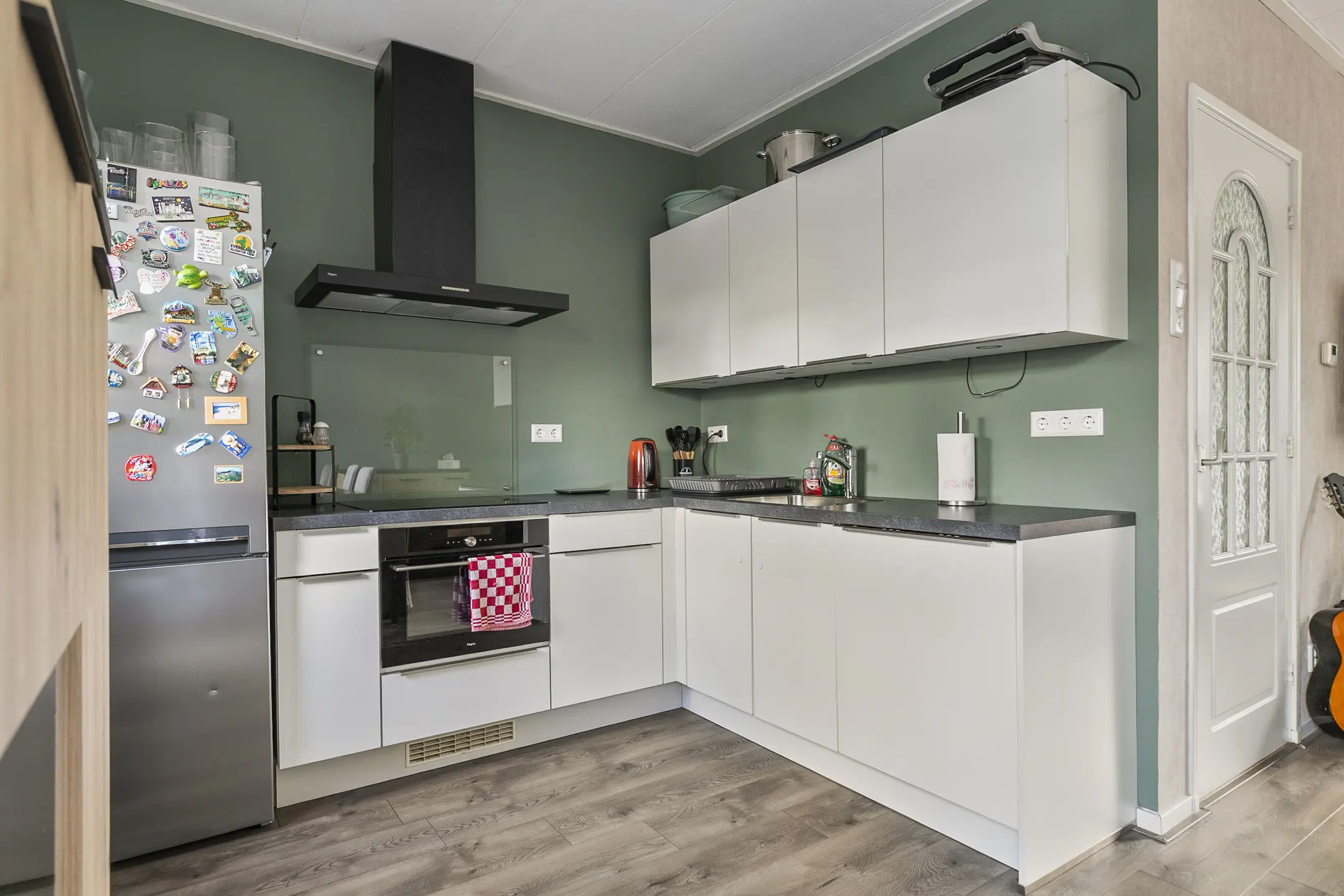 De gezellige doorzonwoonkamer met laminaatvloer vormt het hart van de woning en staat in open verbinding met de moderne hoekkeuken. Deze keuken (2020) is uitgerust met:
