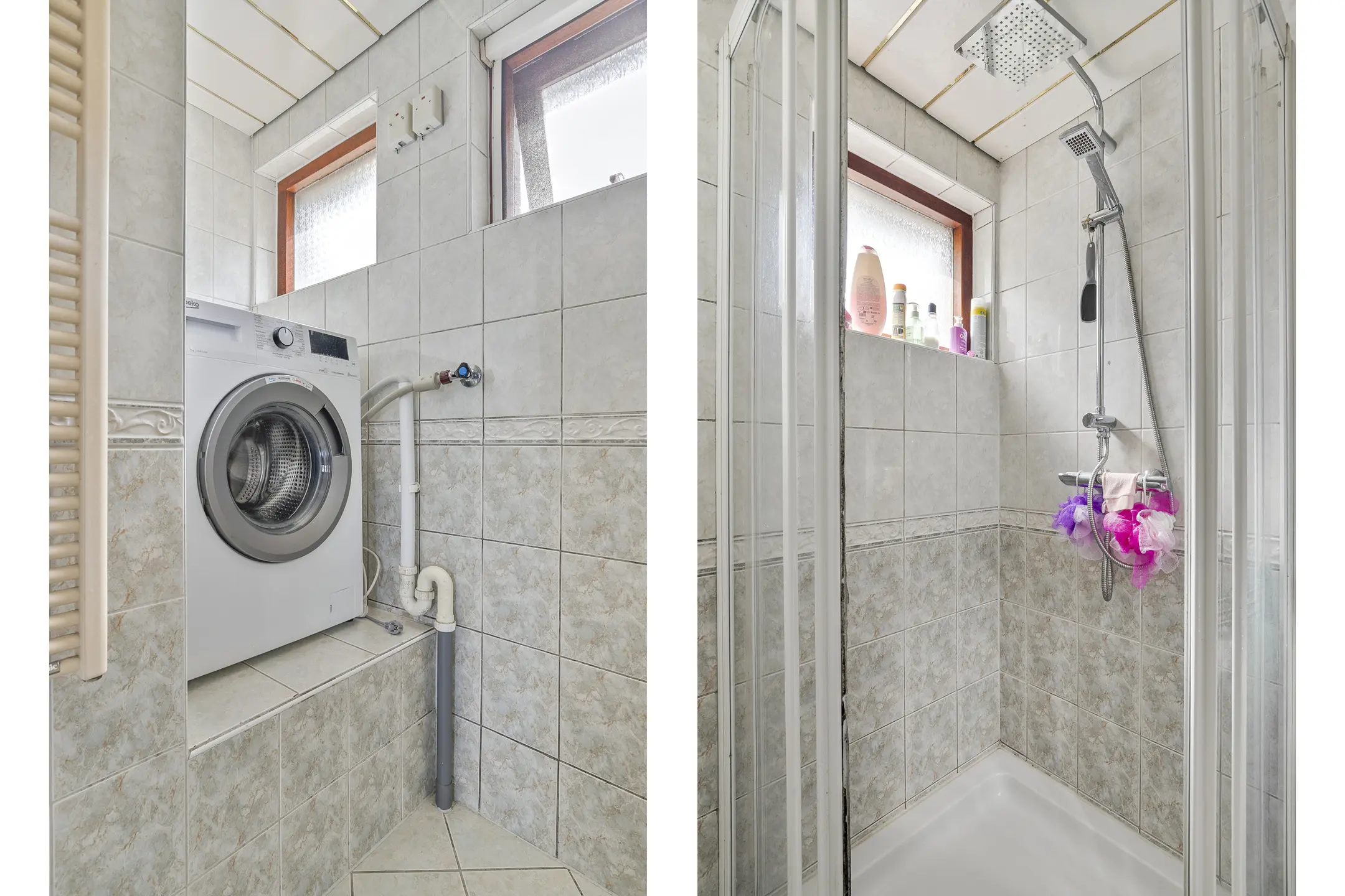 - A fully tiled bathroom with shower cabin, washbasin, and connections for a washing machine and dryer