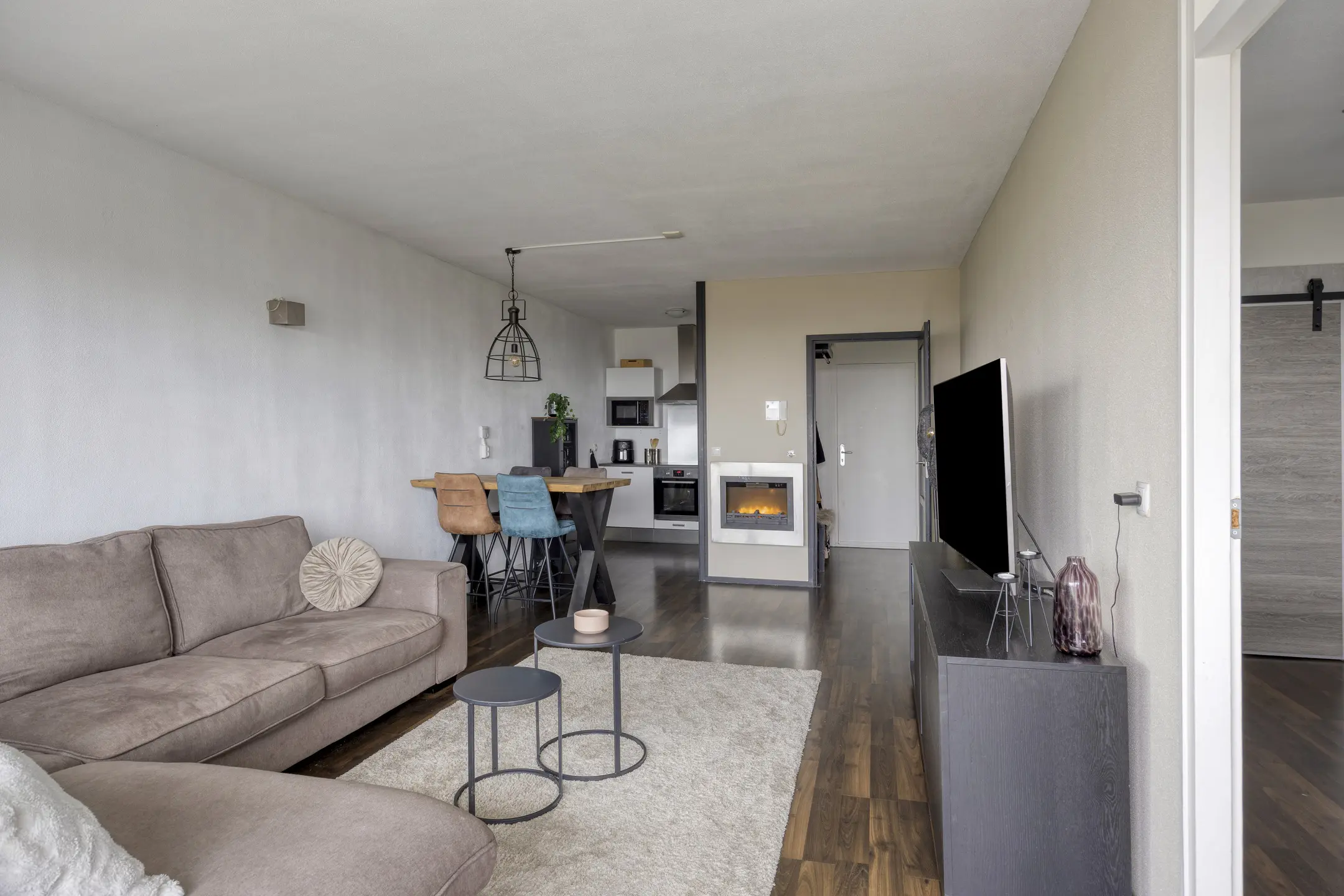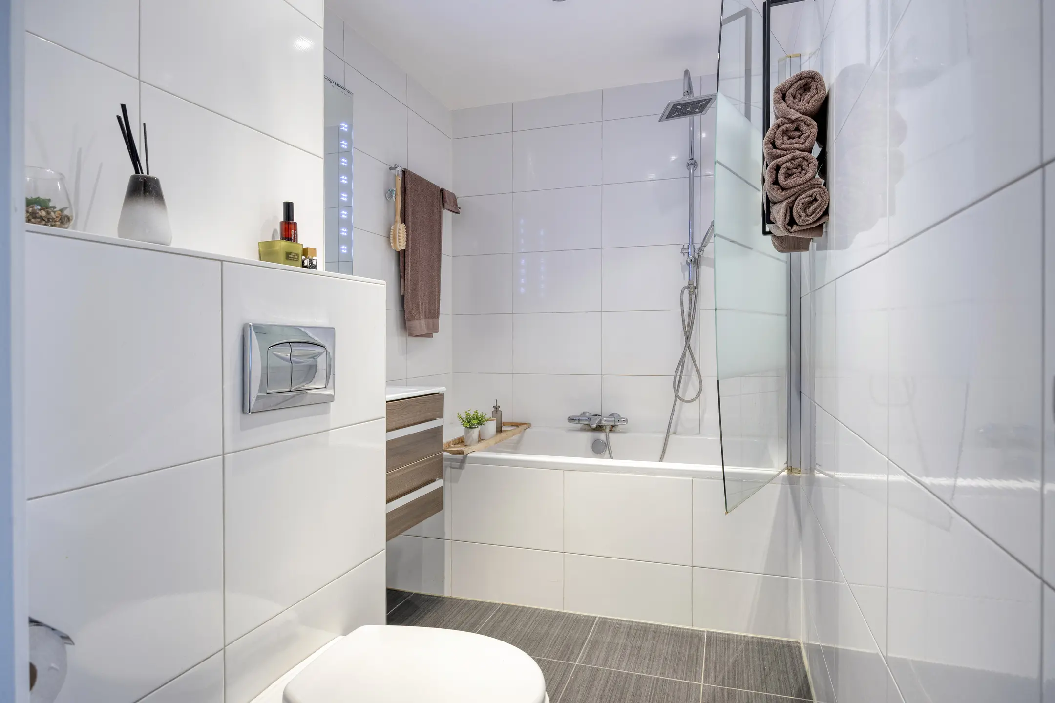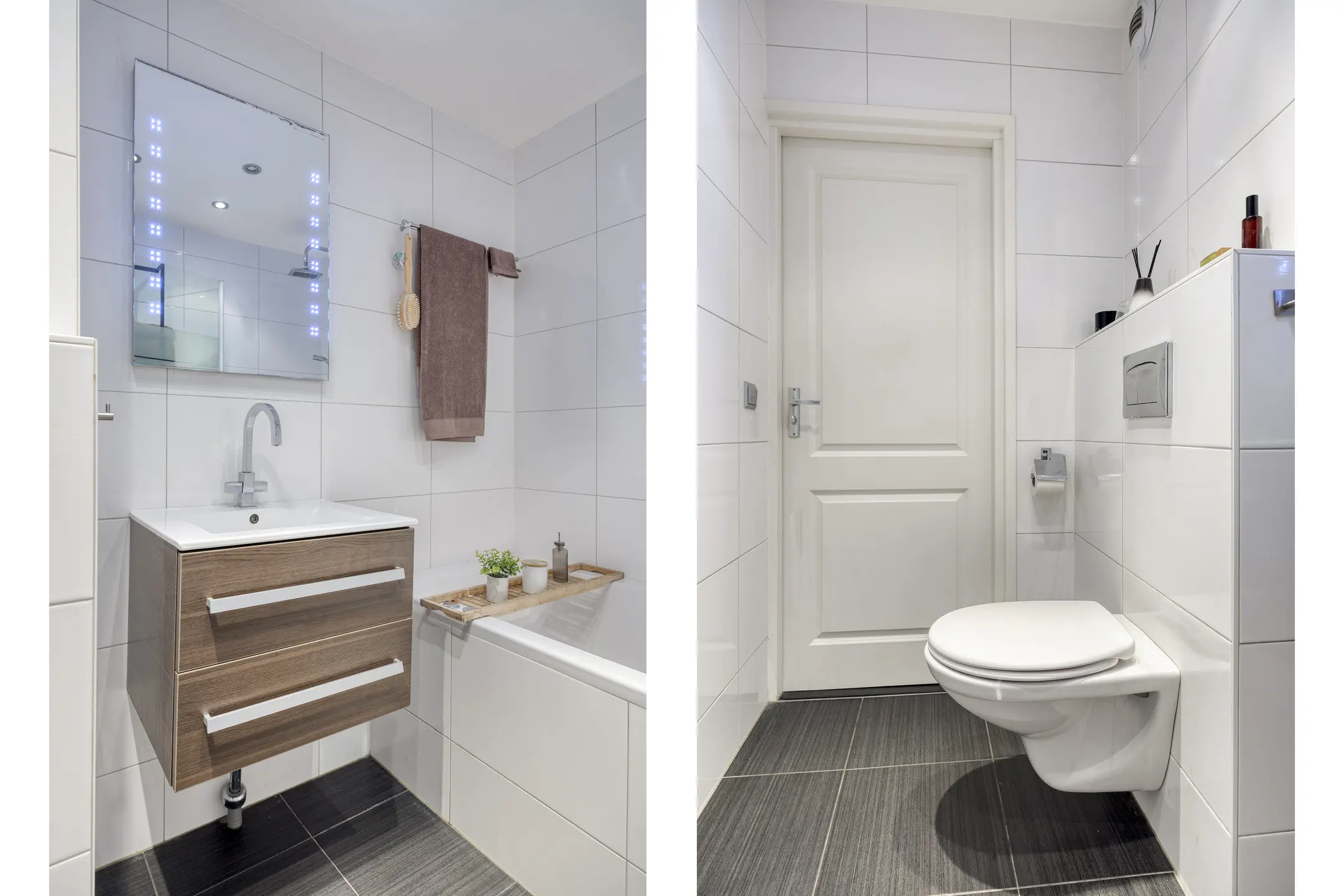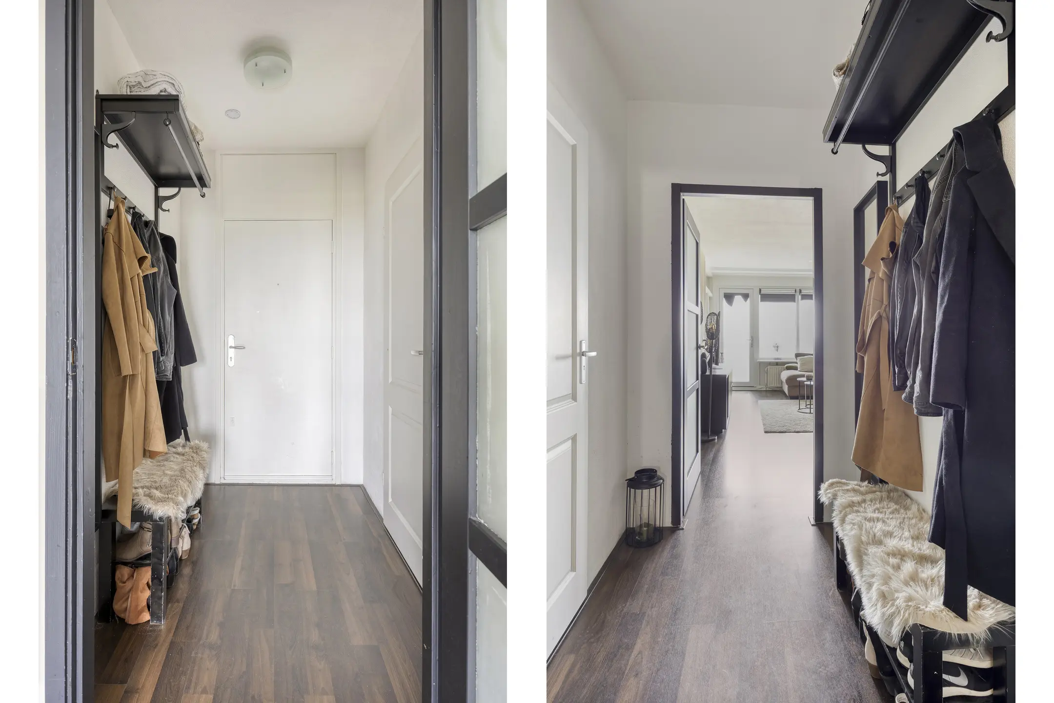 Bij binnenkomst in het appartement komt u in de hal die toegang geeft tot de verschillende vertrekken. Aan de linkerzijde bevindt zich de badkamer, die volledig is betegeld en is voorzien van een douche, een ligbad en een modern zwevend toilet. De hal loopt verder door naar de woonkamer, die bijzonder ruim aanvoelt dankzij de grote raampartijen en het indrukwekkende uitzicht over Zoetermeer.