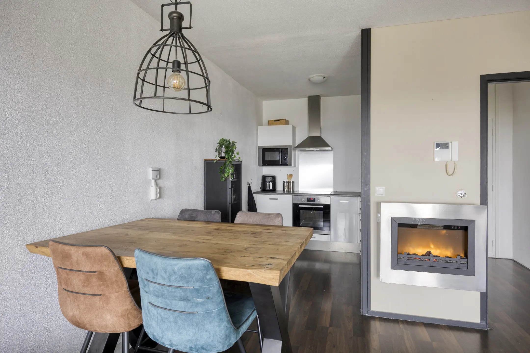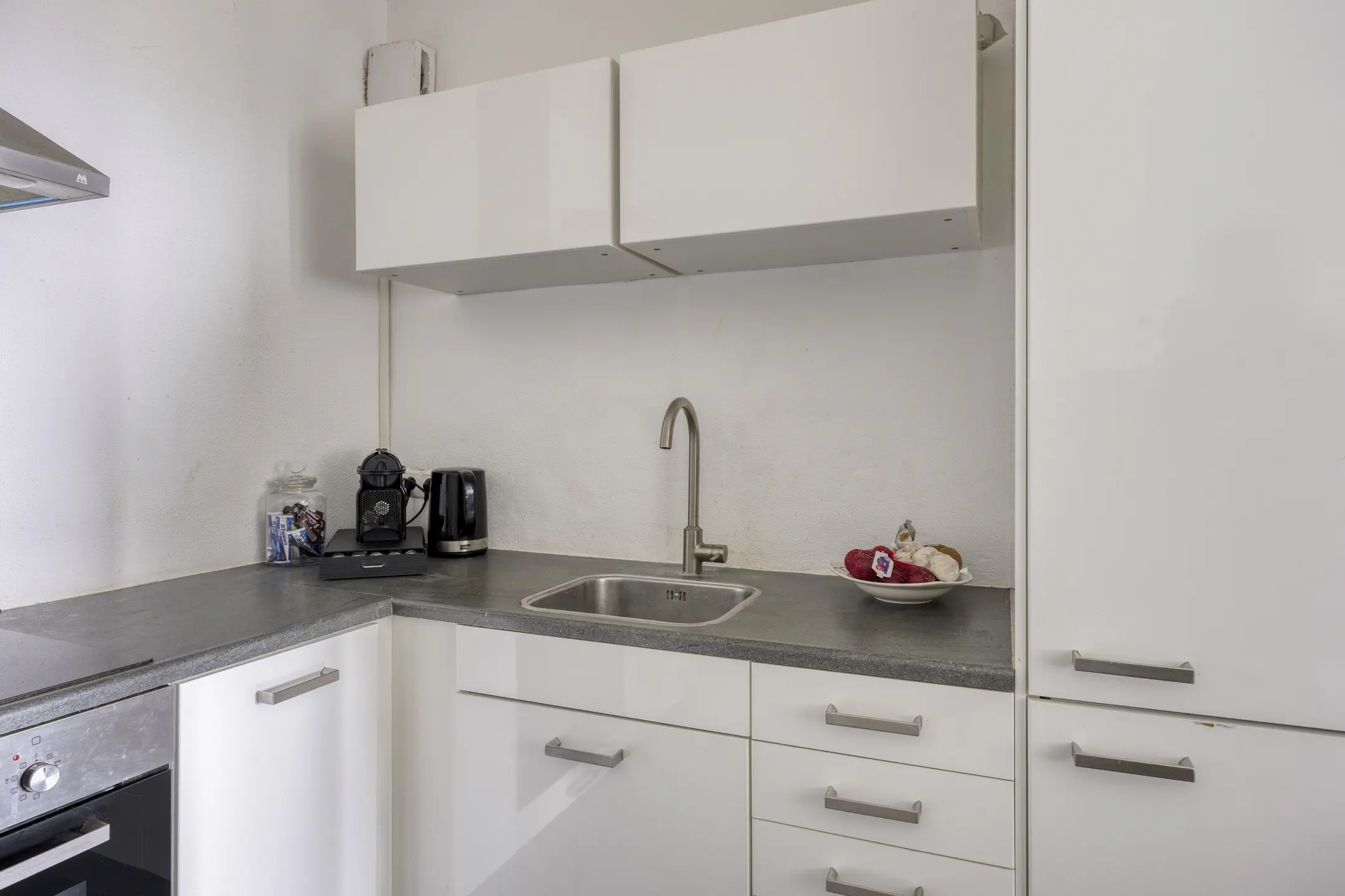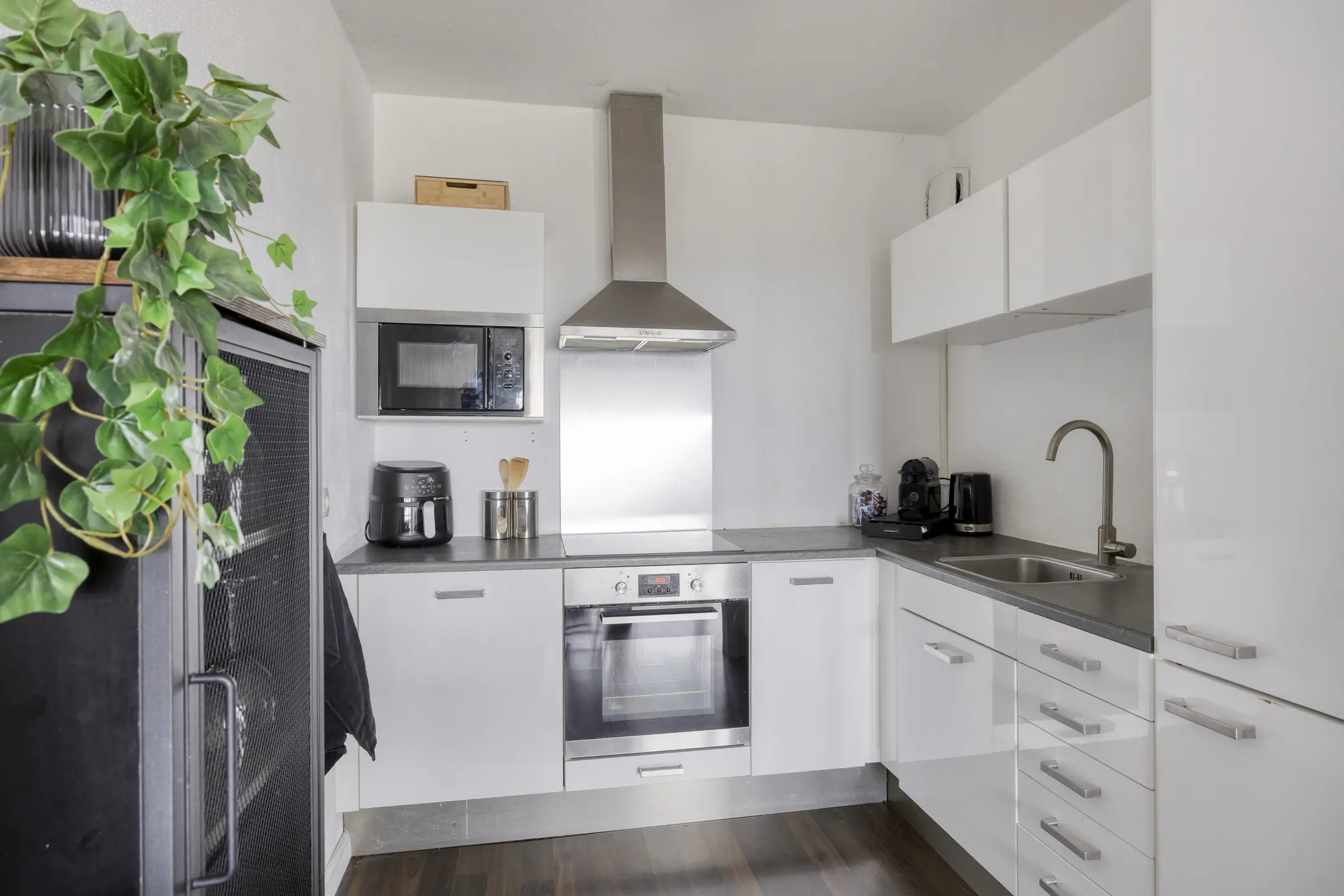 Aan de voorzijde van het appartement bevindt zich de open keuken. Deze is modern uitgevoerd en voorzien van diverse inbouwapparatuur, waaronder een koel-vriescombinatie, magnetron, oven, vaatwasser, inductiekookplaat en afzuigkap. De open opzet zorgt voor een fijne verbinding tussen keuken en woonkamer, wat het geheel een ruim en licht karakter geeft.