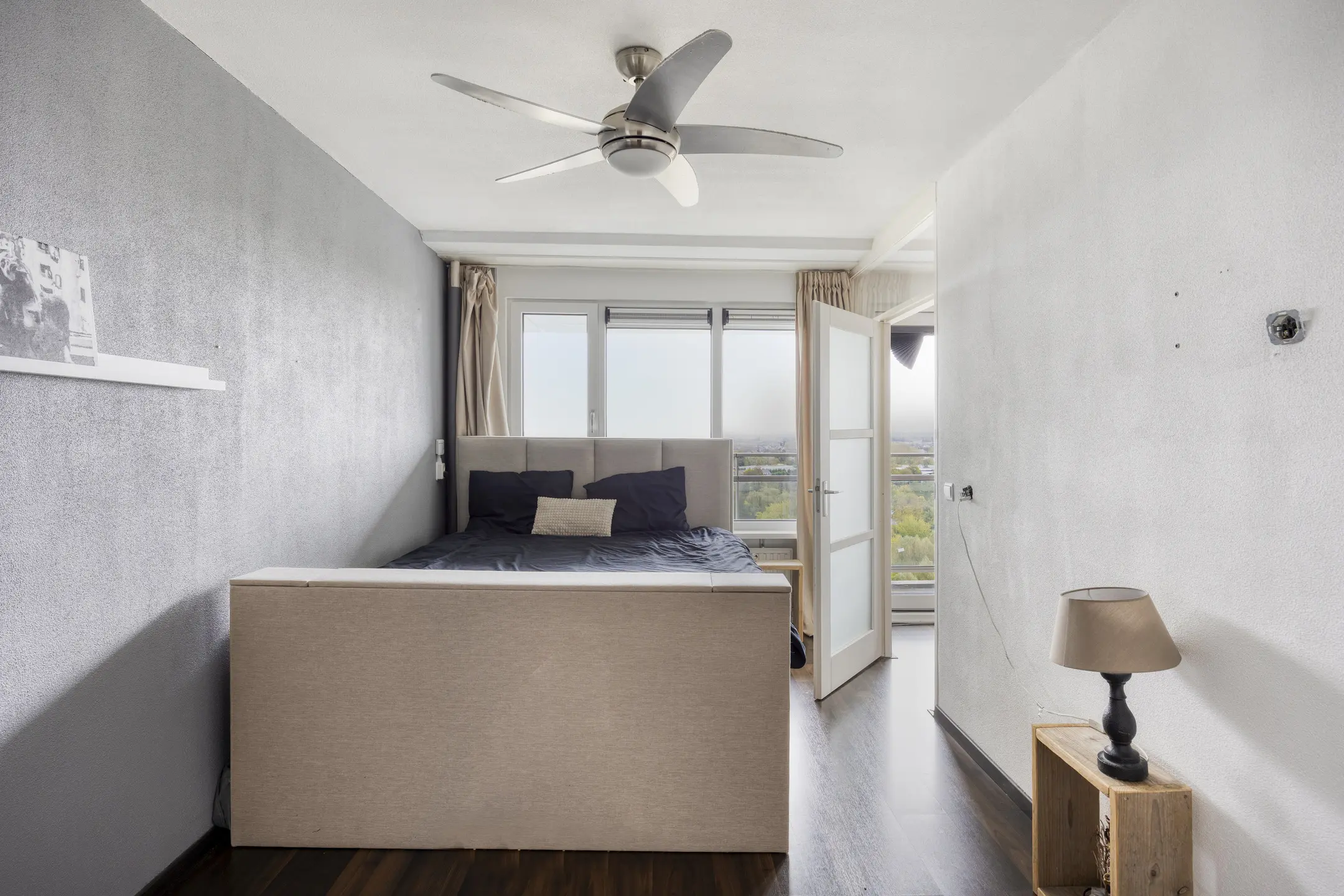 Grenzend aan de woonkamer ligt de slaapkamer, die eveneens profiteert van het mooie uitzicht en is voorzien van een praktische walk-in closet. Over de gehele breedte van het appartement bevindt zich een ruim balkon, gelegen op het oosten. Hier kunt u al vroeg op de dag genieten van de zon en het wijdse uitzicht over de stad.