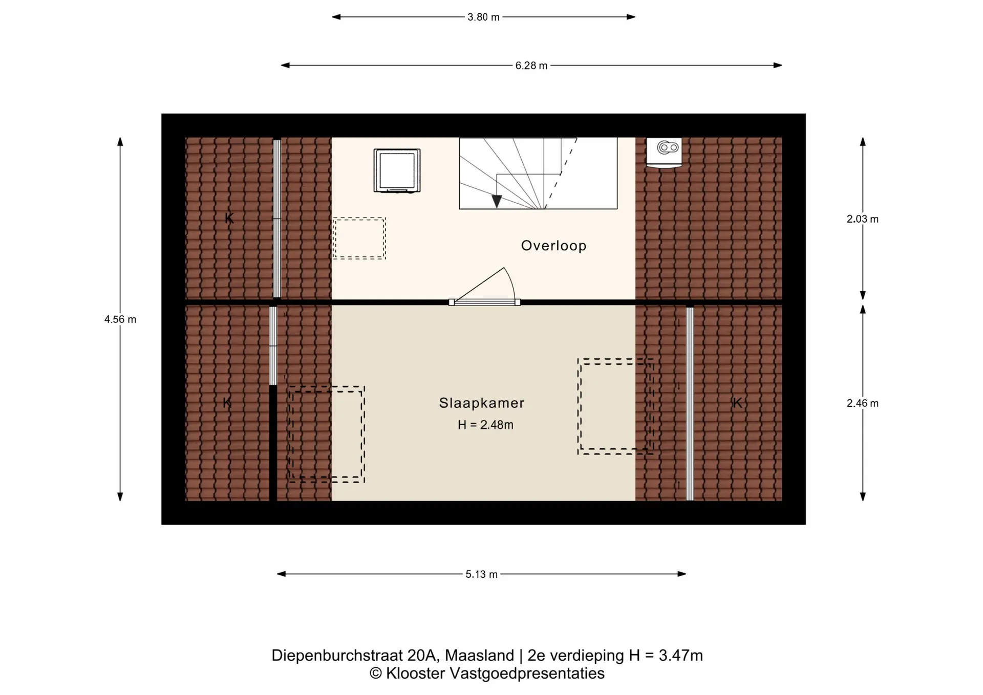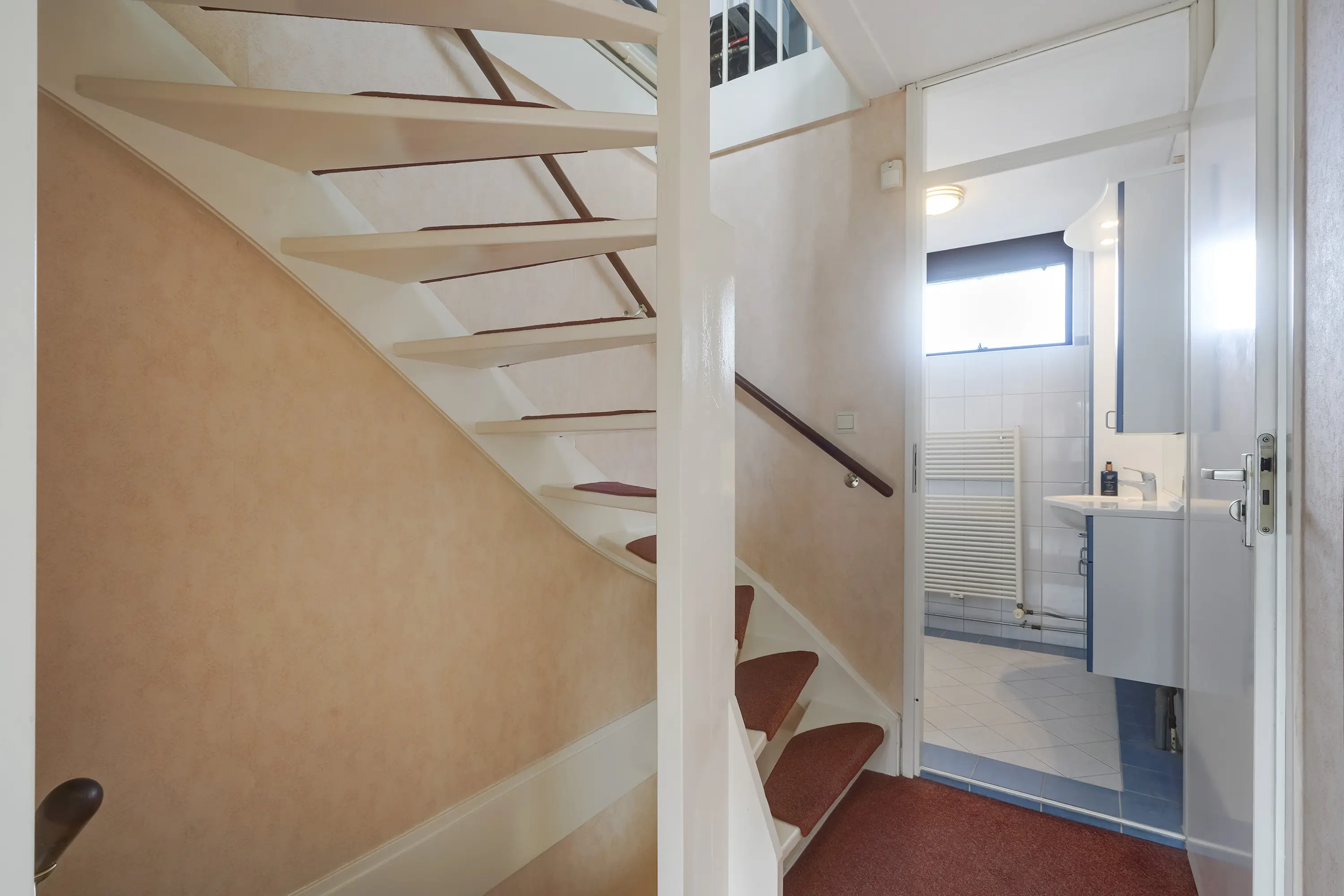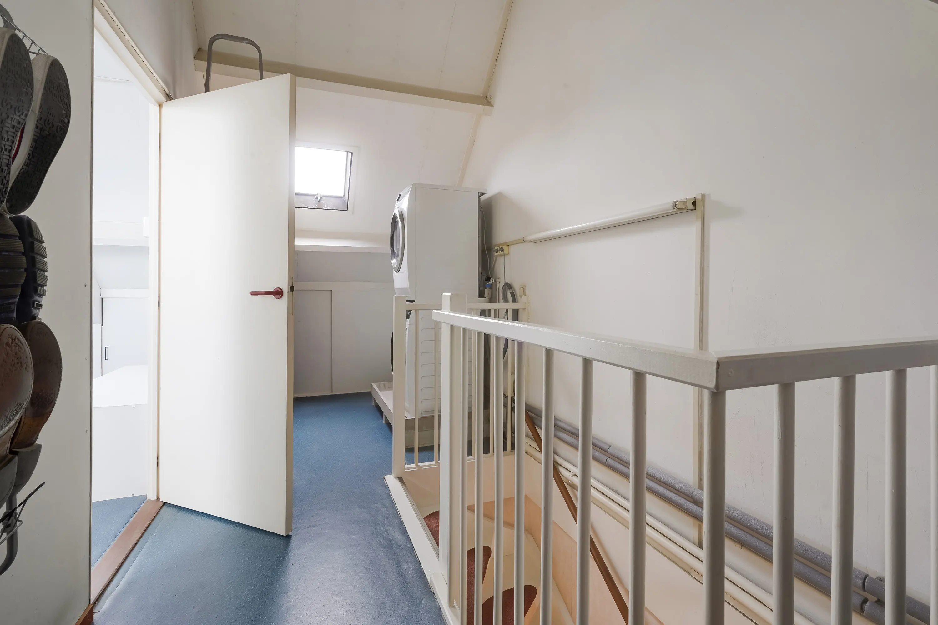 De tweede verdieping beschikt over een derde slaapkamer, opstelplaats voor de cv-ketel en aansluiting voor wasmachine en droger. Achter de knieschotten is volop bergruimte aanwezig.