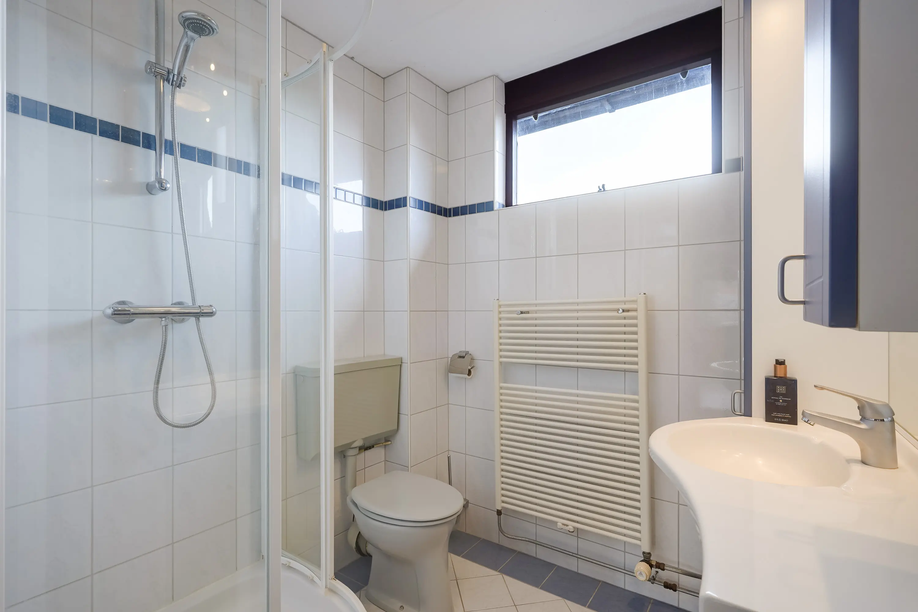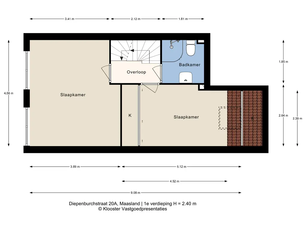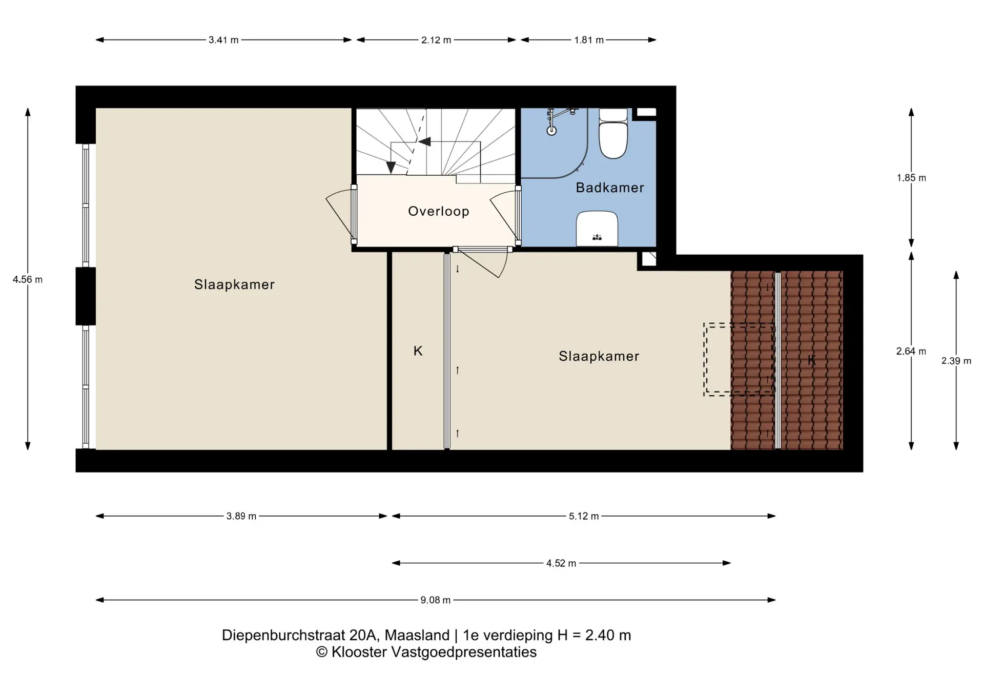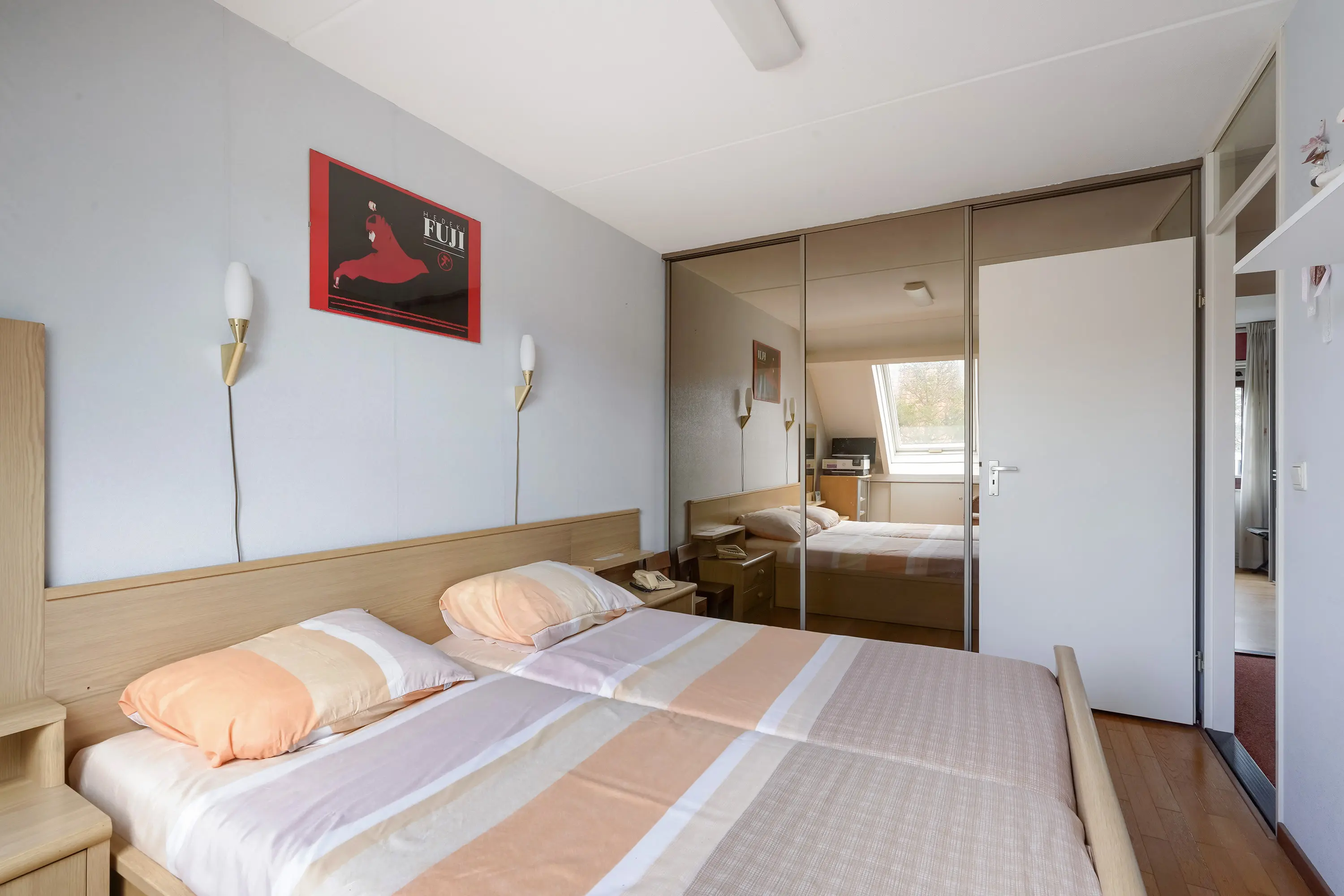 Hier bevinden zich twee ruime slaapkamers, waarvan de grootste eenvoudig weer kan worden teruggebracht naar de oorspronkelijke twee kamers. De badkamer is netjes en voorzien van douche, wastafel en tweede toilet.