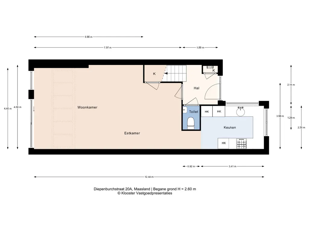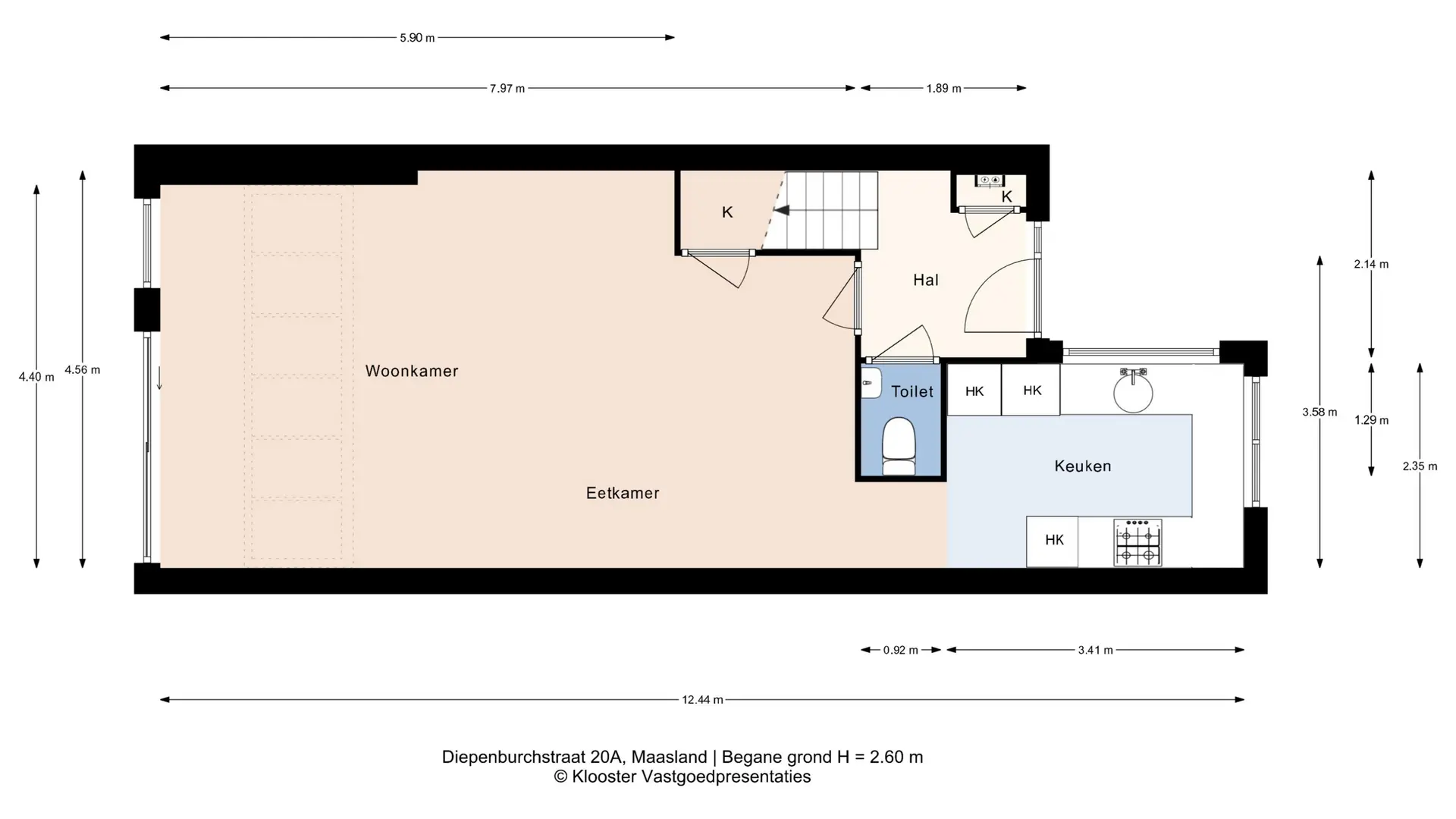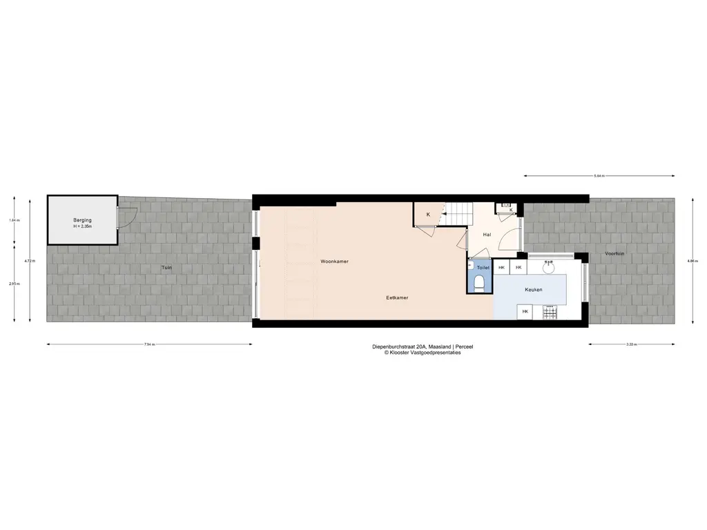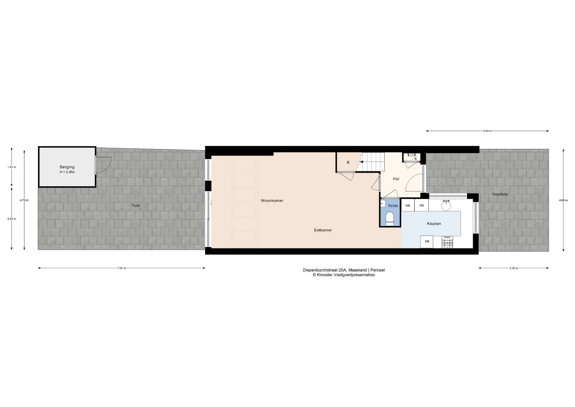 Aan de voorzijde bevindt zich de nette voortuin, waarna je via de voordeur binnenkomt in de hal met toilet, meterkast en trapopgang naar de eerste verdieping.