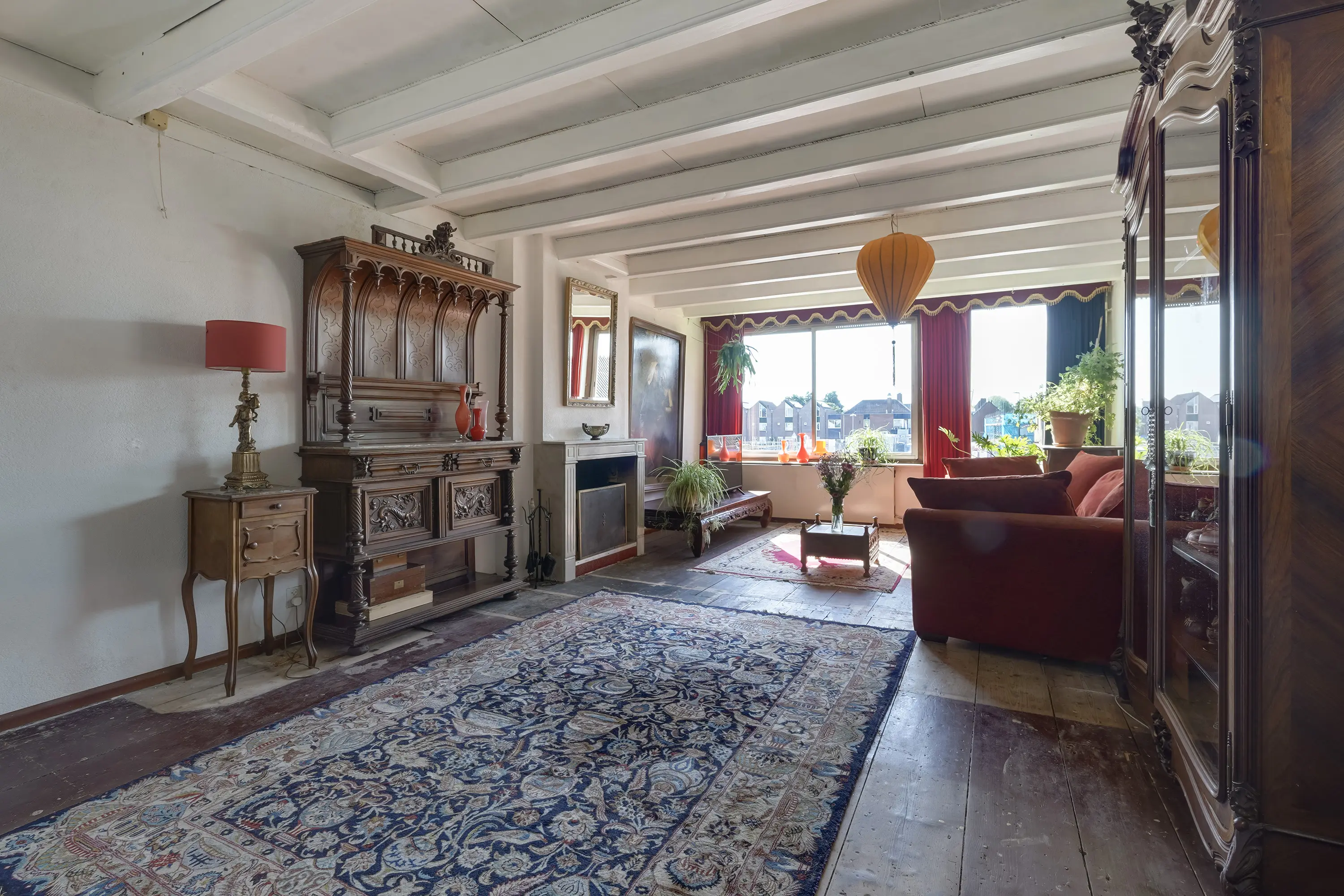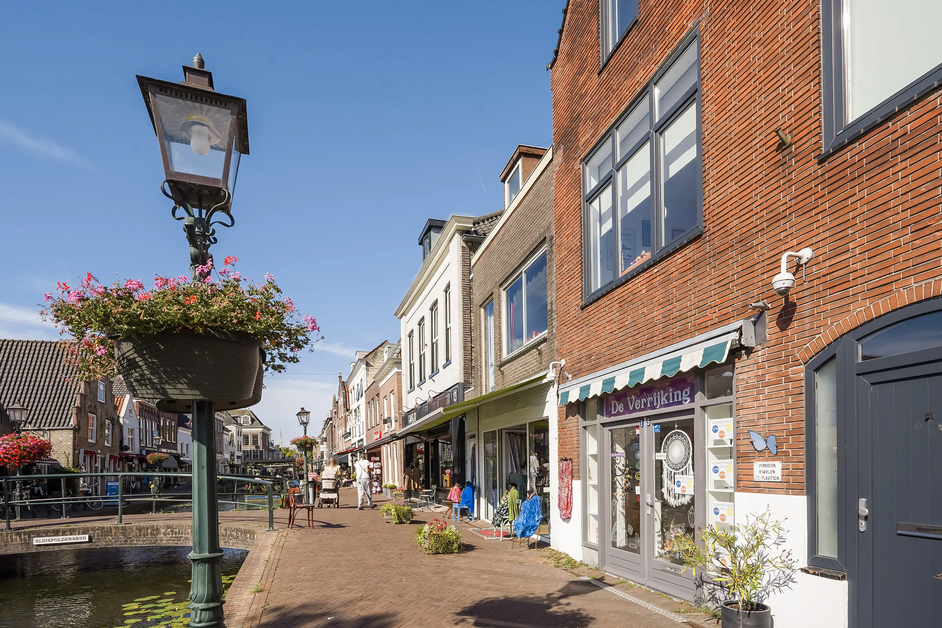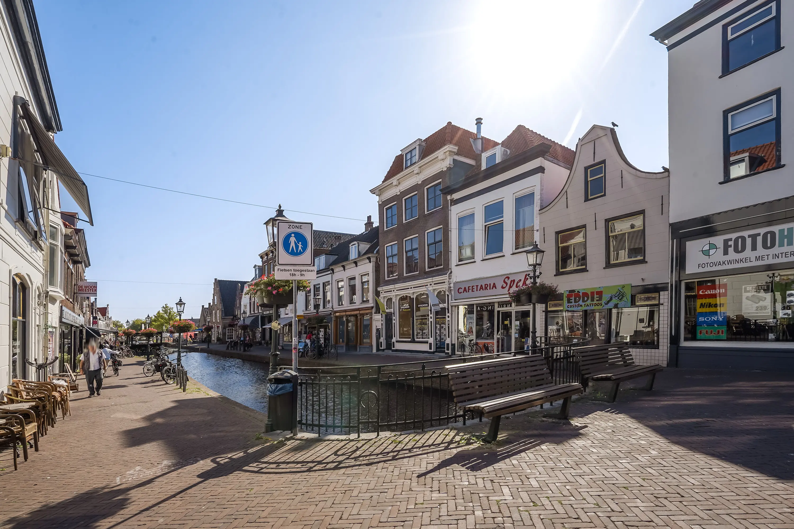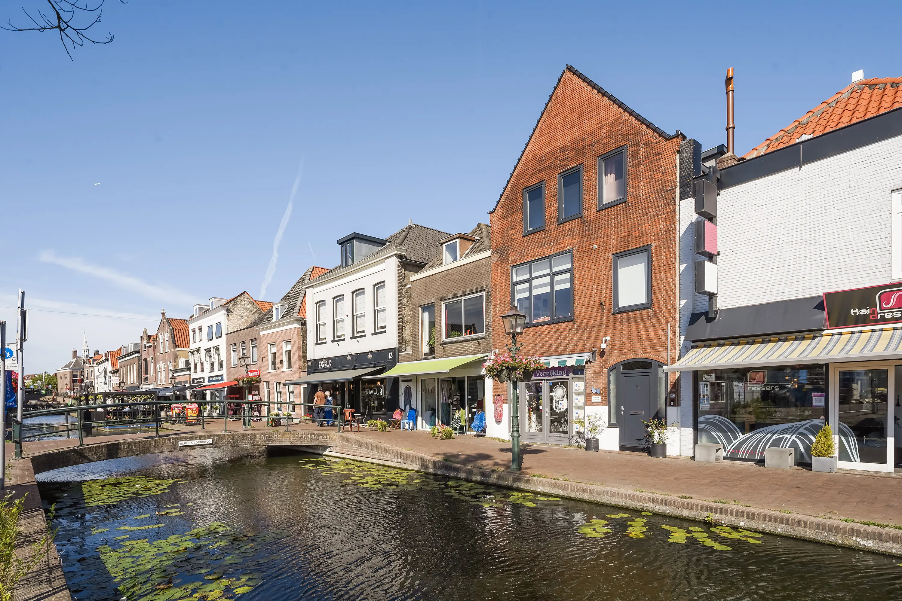 De linker entree leidt naar de hal met trapopgang. Op de eerste verdieping treft u prachtige details zoals glas-in-lood en balkenplafonds. De lichte woonkamer biedt een fraai uitzicht over de vliet en de binnenstad. Daarnaast is er een slaapkamer aan de achterzijde en een walk-in closet (voorheen badkamer).