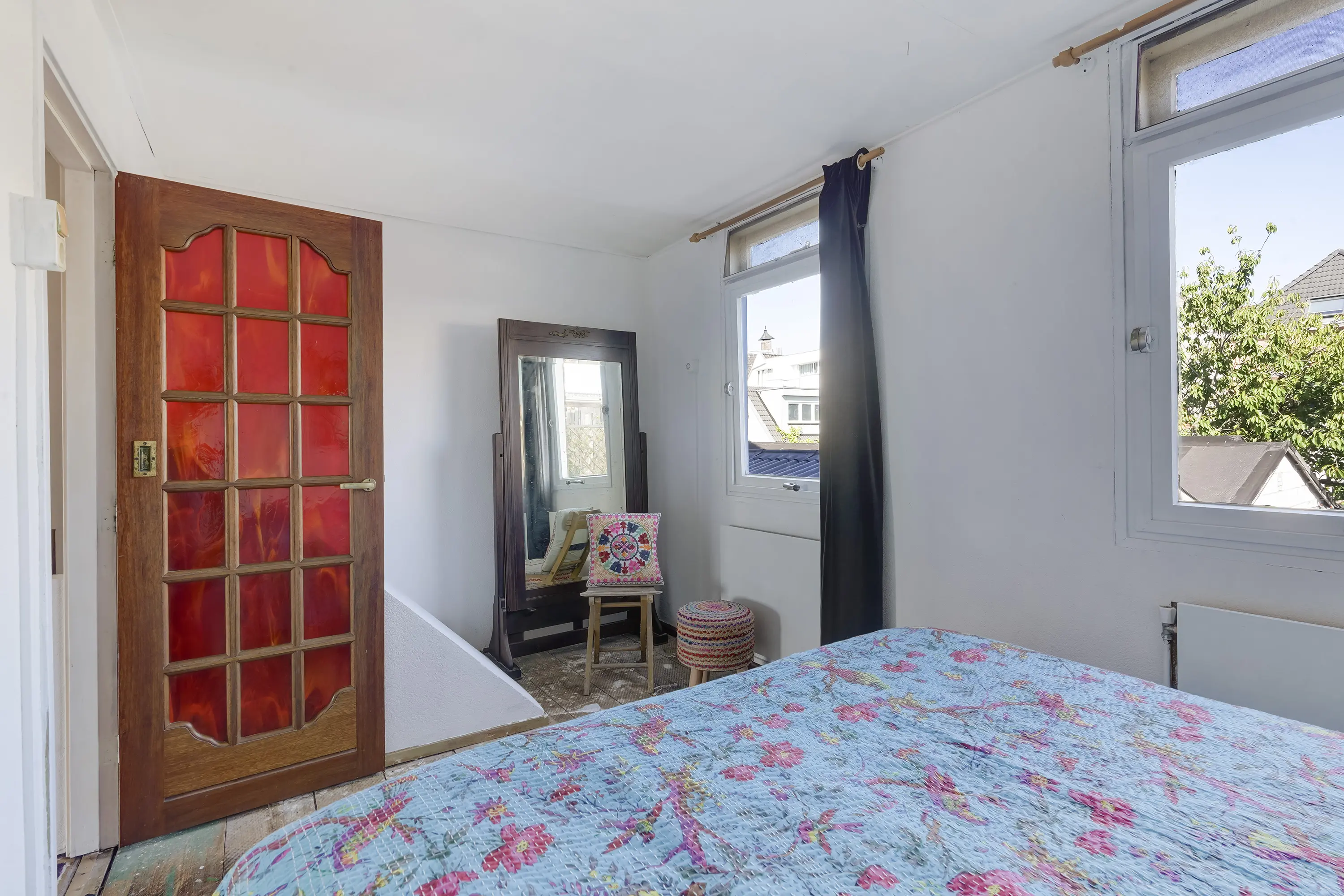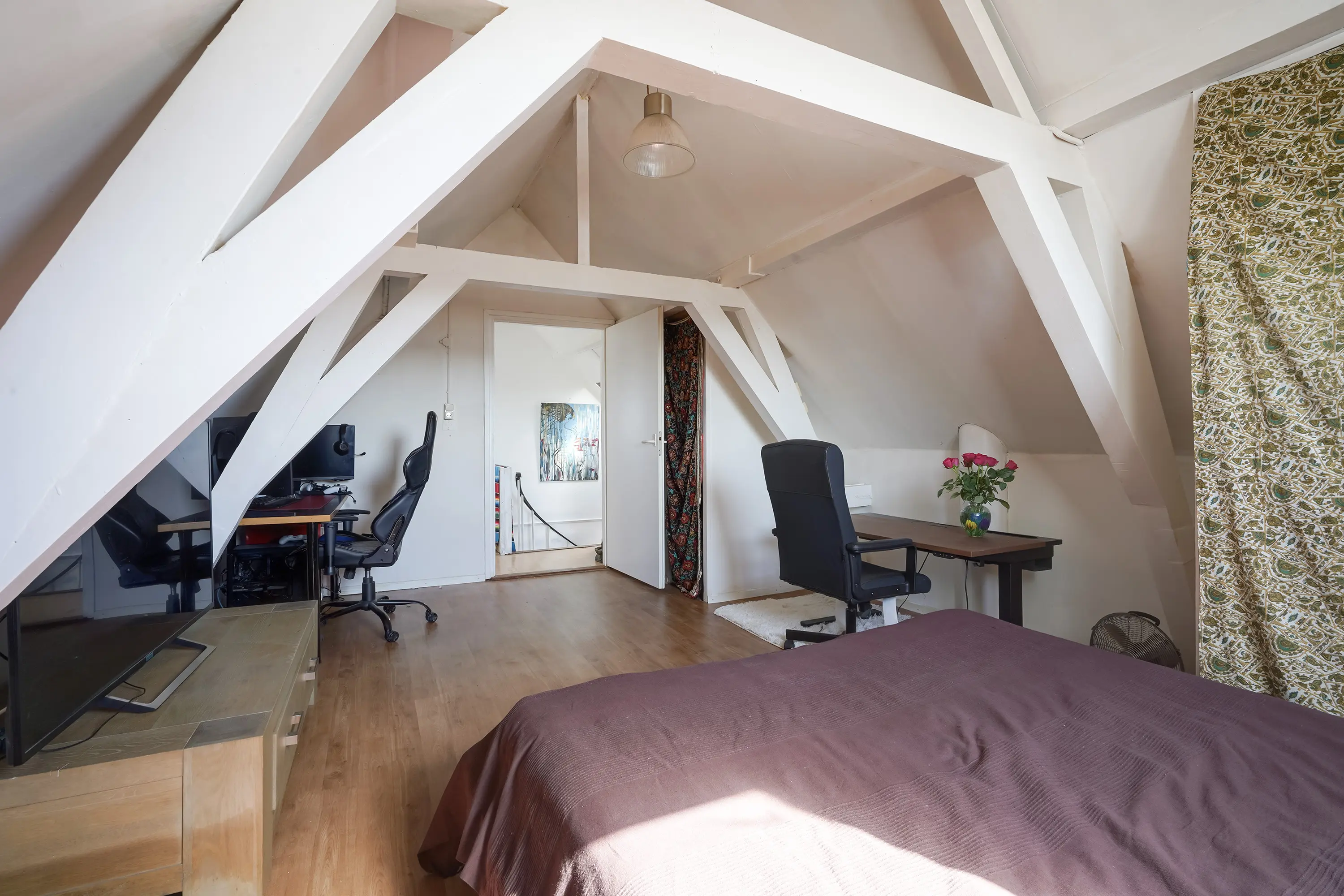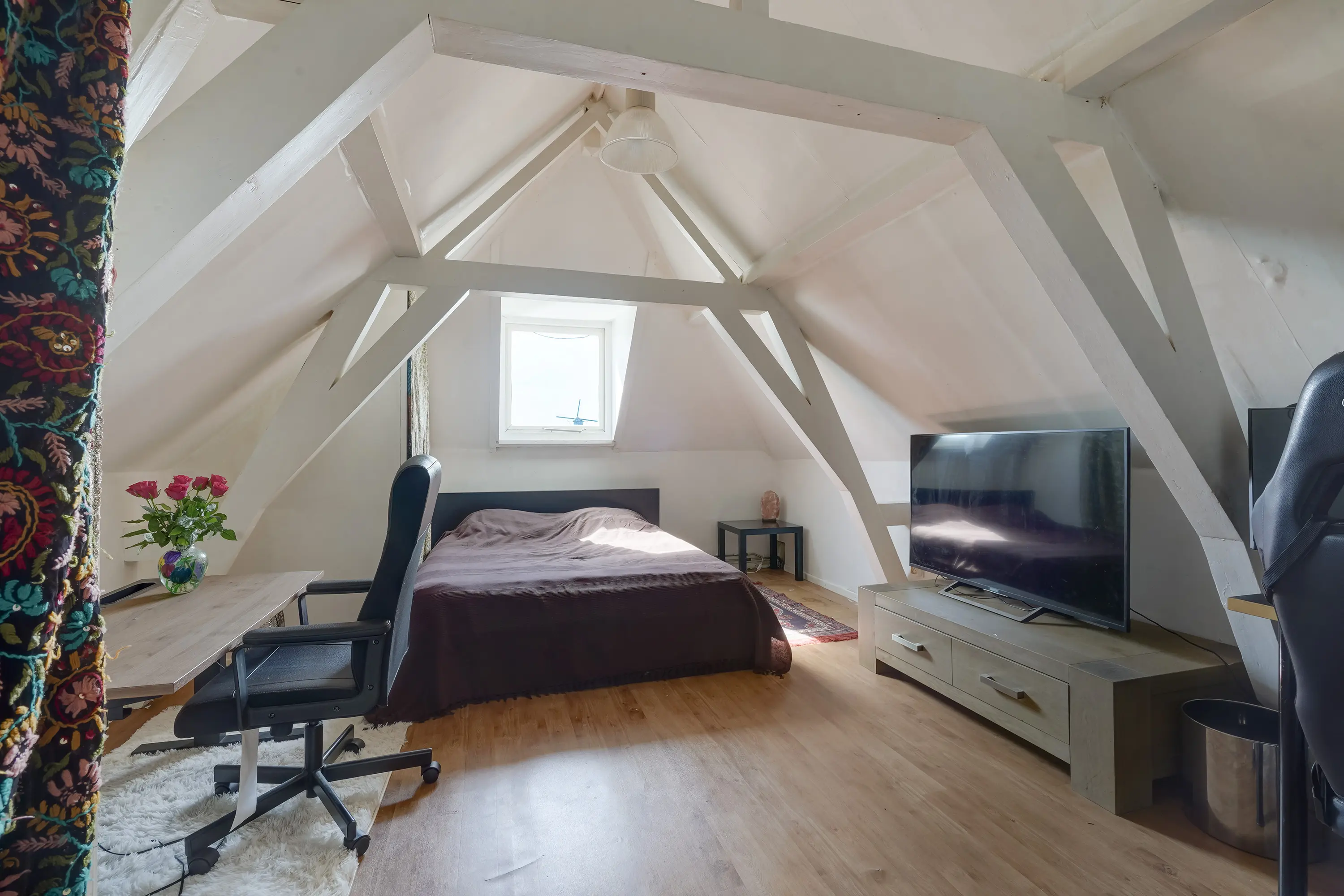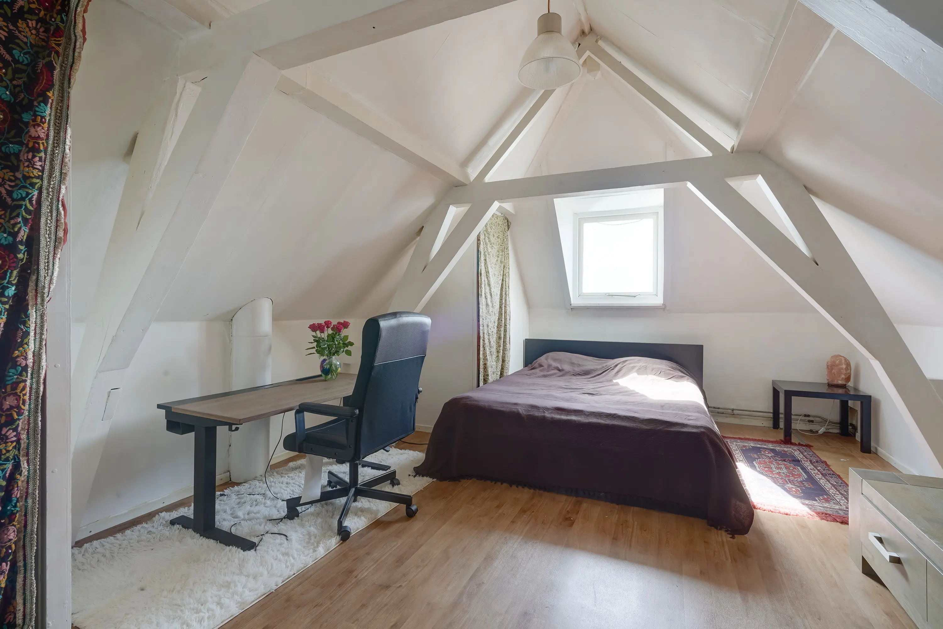 De tweede verdieping heeft een verrassende ruimte: een slaapkamer aan de voorzijde met karakteristieke balken, een royale slaapkamer aan de achterzijde en een lichte badkamer met ligbad, toilet, wastafel, vloerverwarming en een prachtige lichtkoepel.