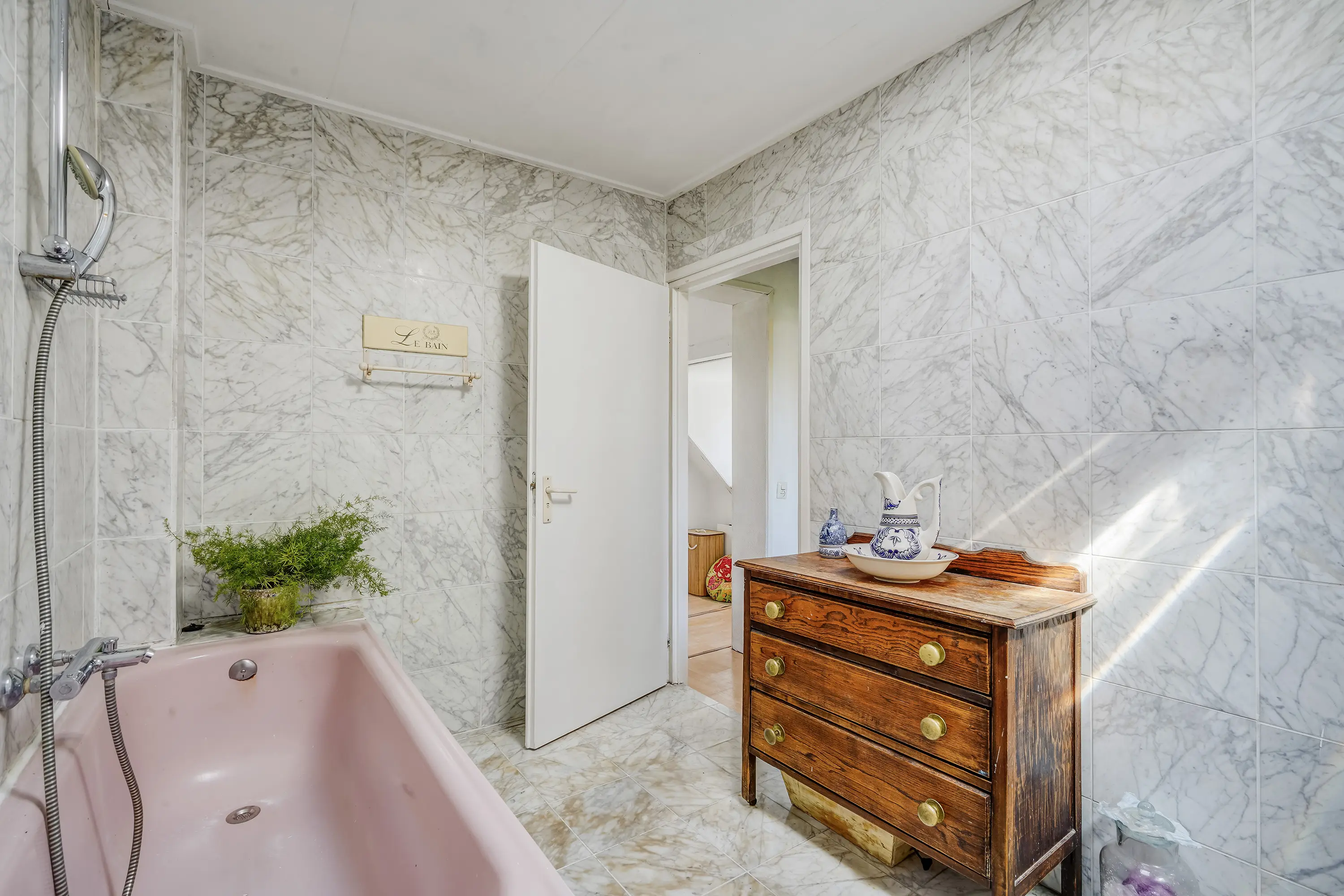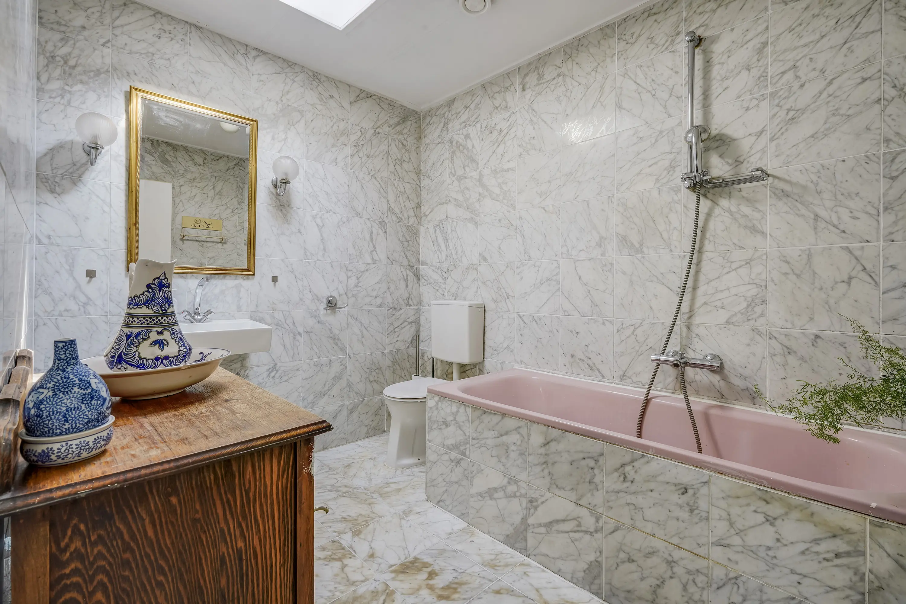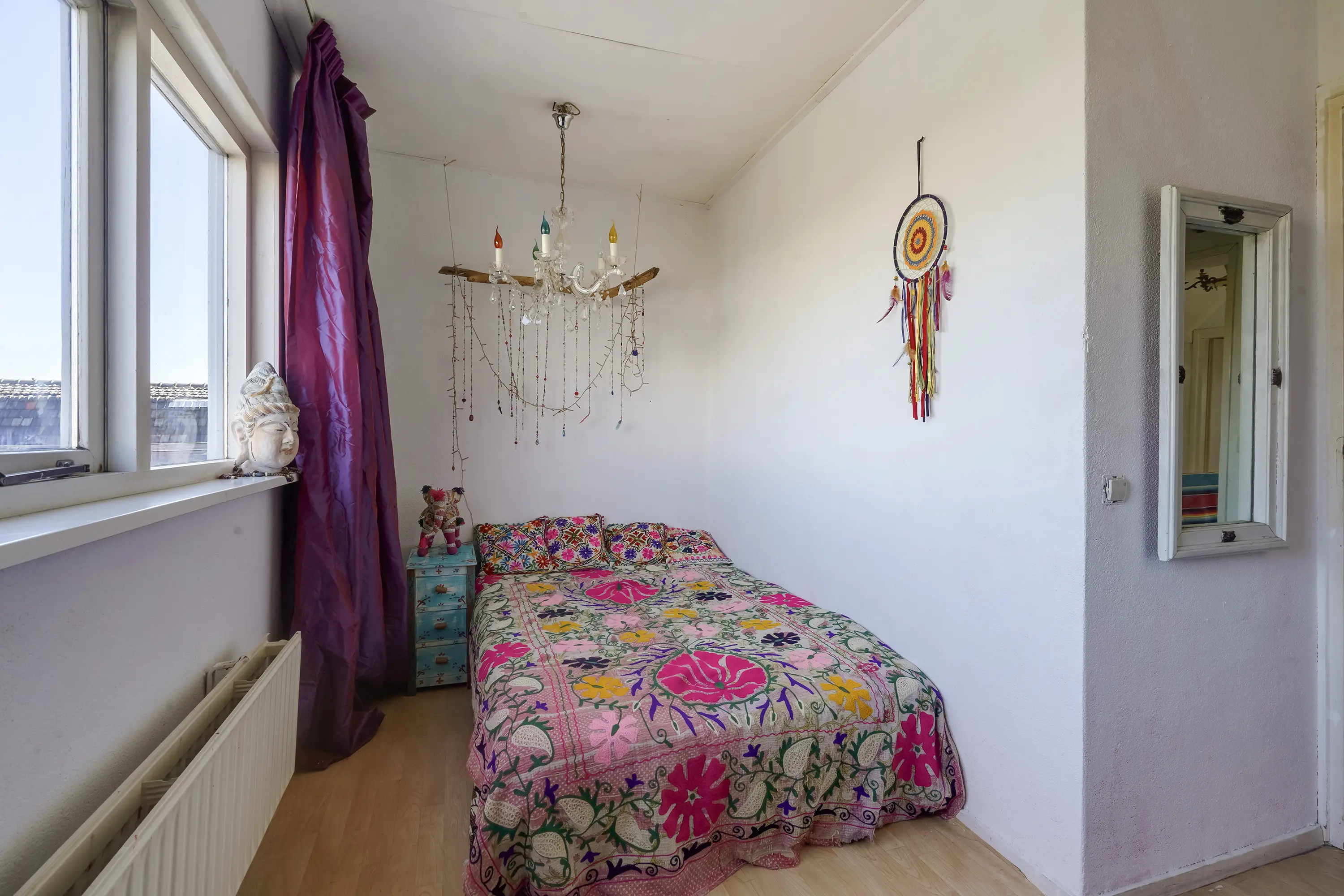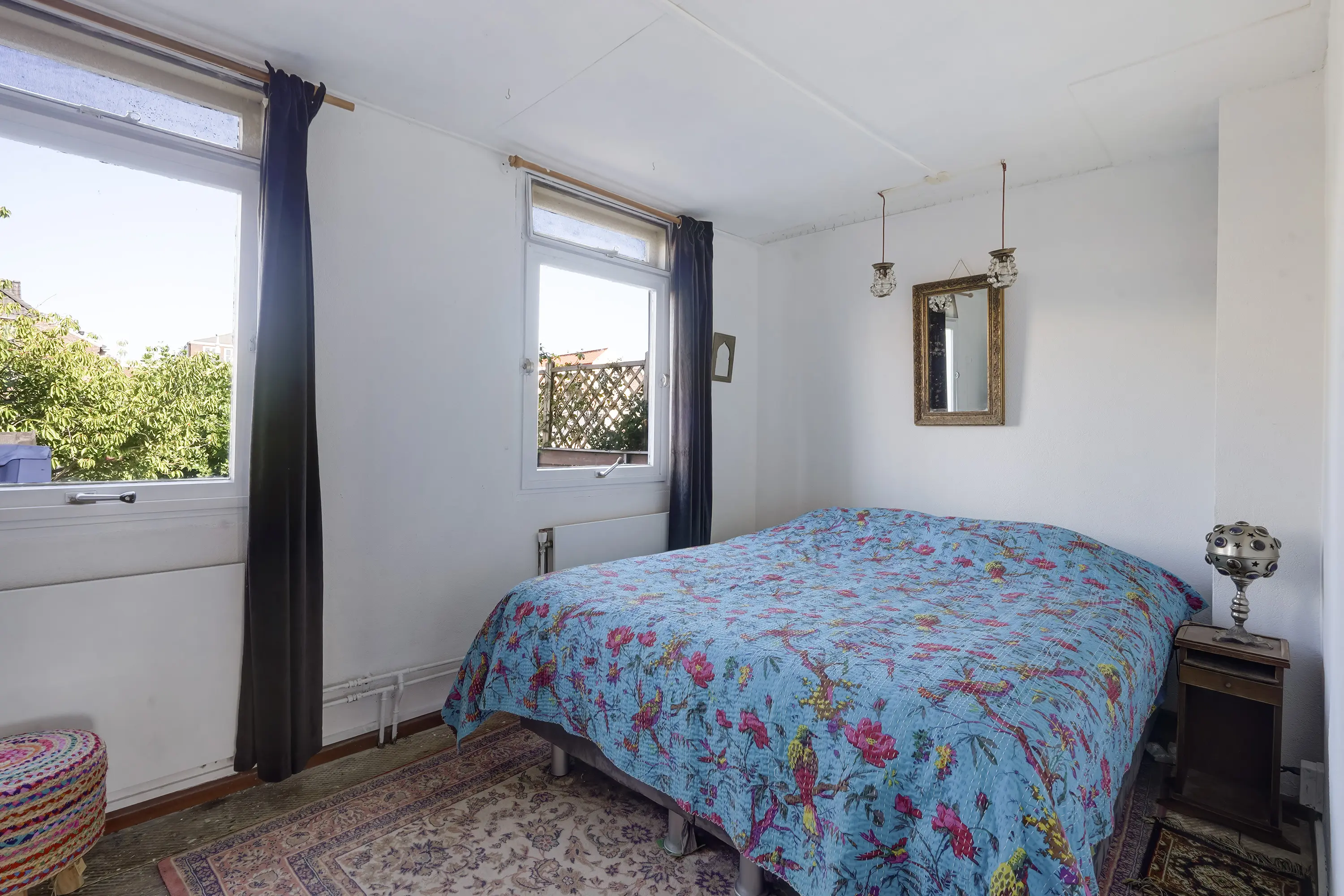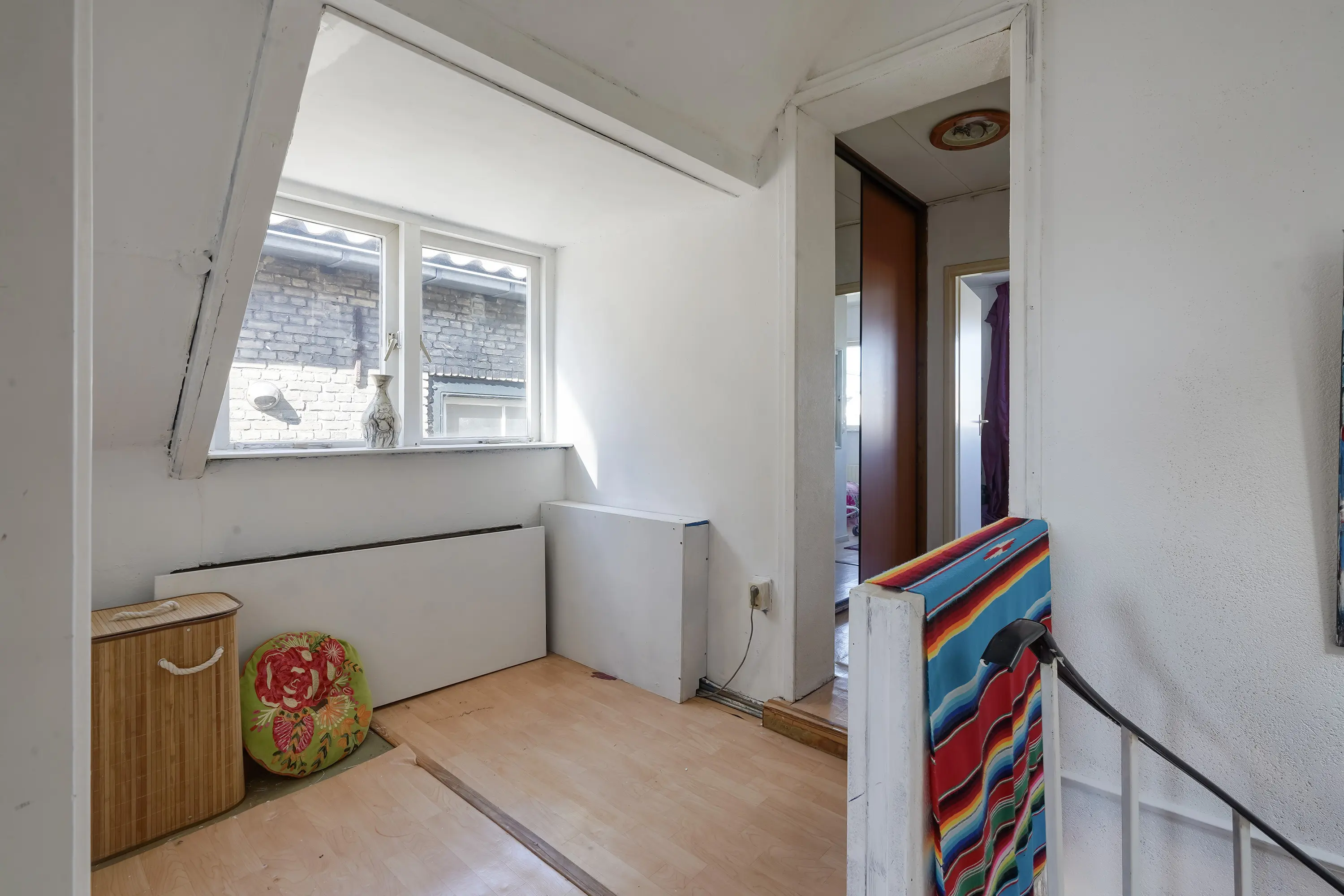 De tweede verdieping heeft een verrassende ruimte: een slaapkamer aan de voorzijde met karakteristieke balken, een royale slaapkamer aan de achterzijde en een lichte badkamer met ligbad, toilet, wastafel, vloerverwarming en een prachtige lichtkoepel.