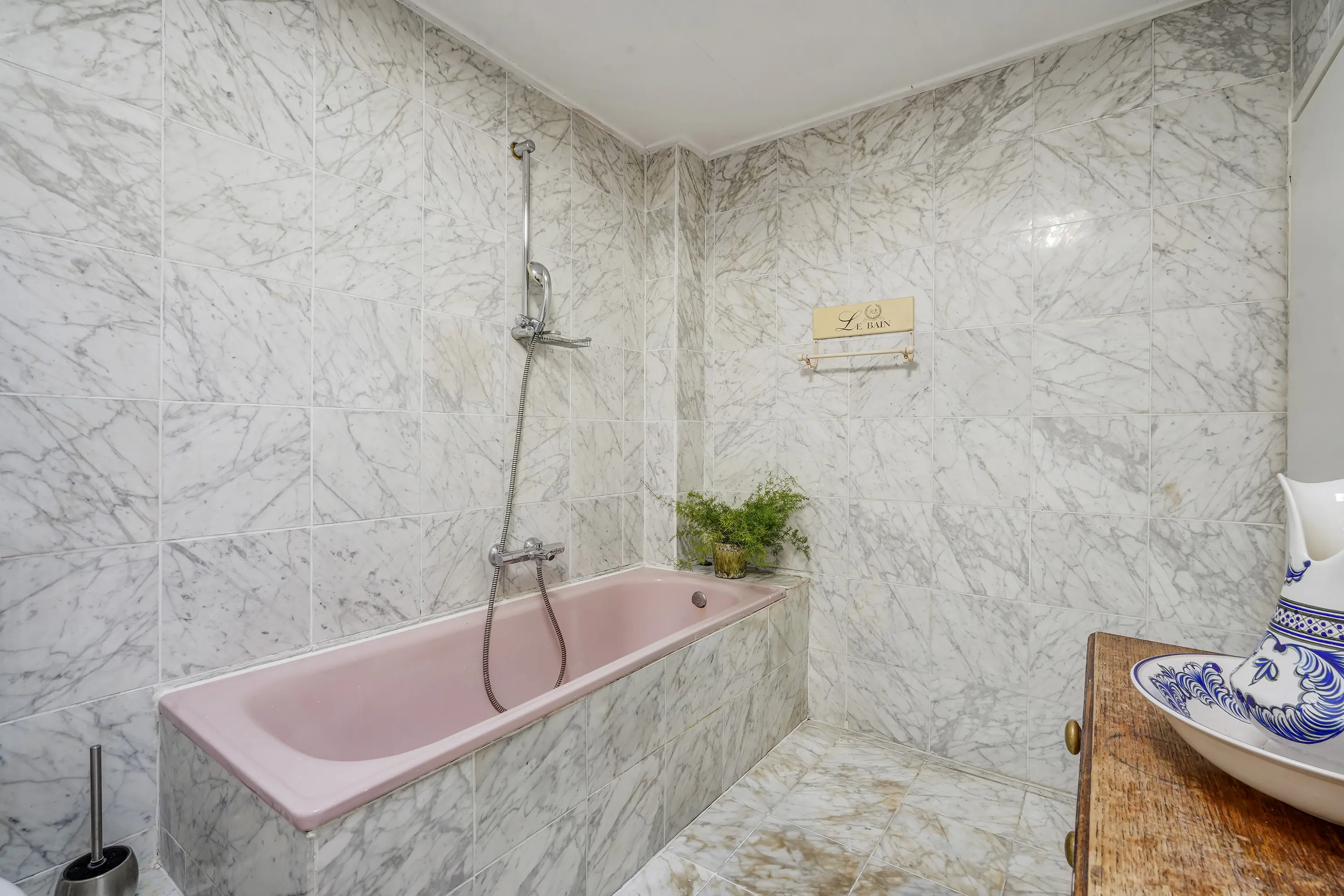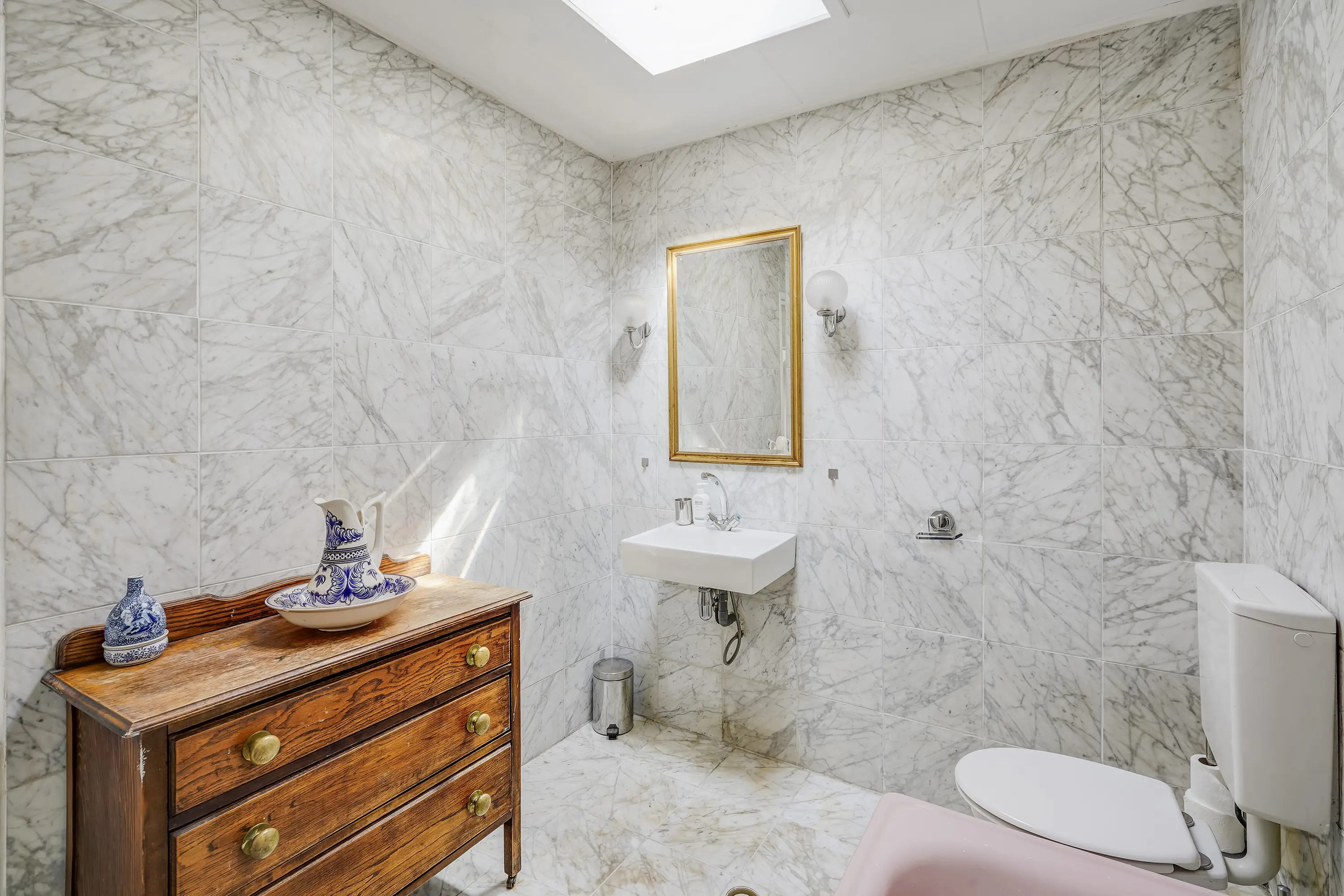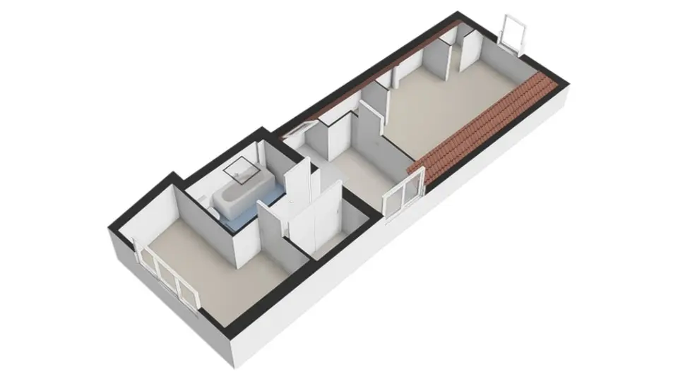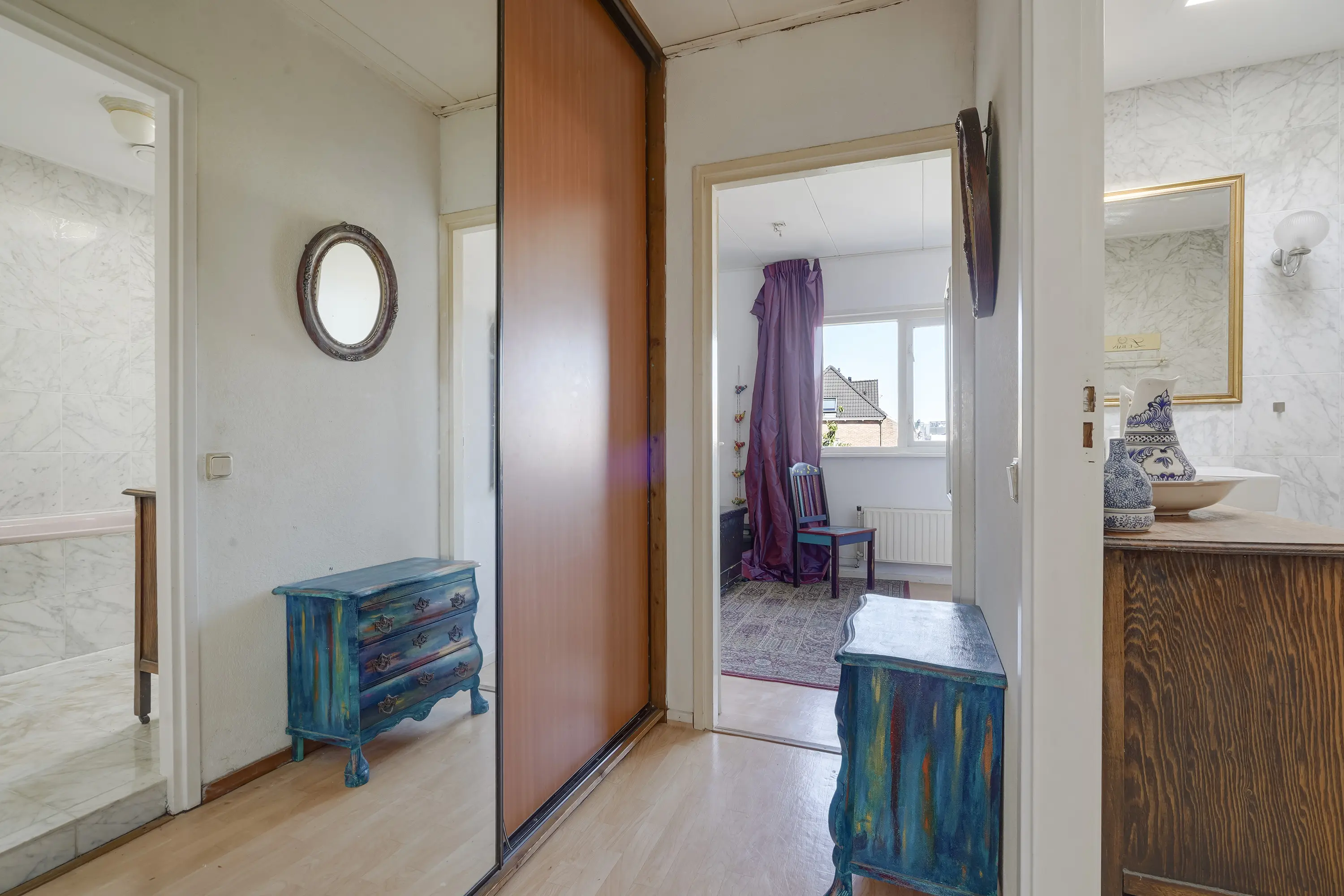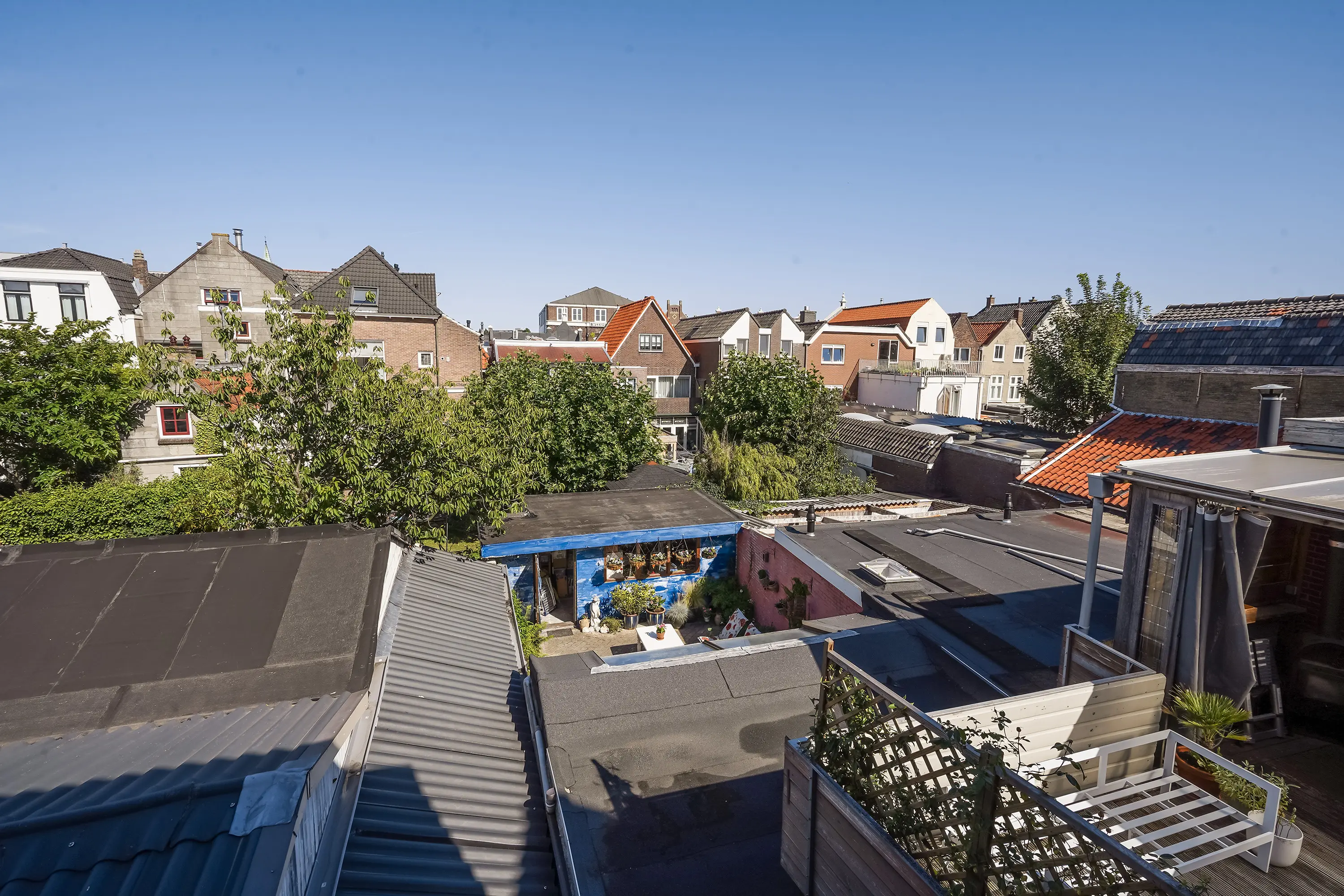De tweede verdieping heeft een verrassende ruimte: een slaapkamer aan de voorzijde met karakteristieke balken, een royale slaapkamer aan de achterzijde en een lichte badkamer met ligbad, toilet, wastafel, vloerverwarming en een prachtige lichtkoepel.