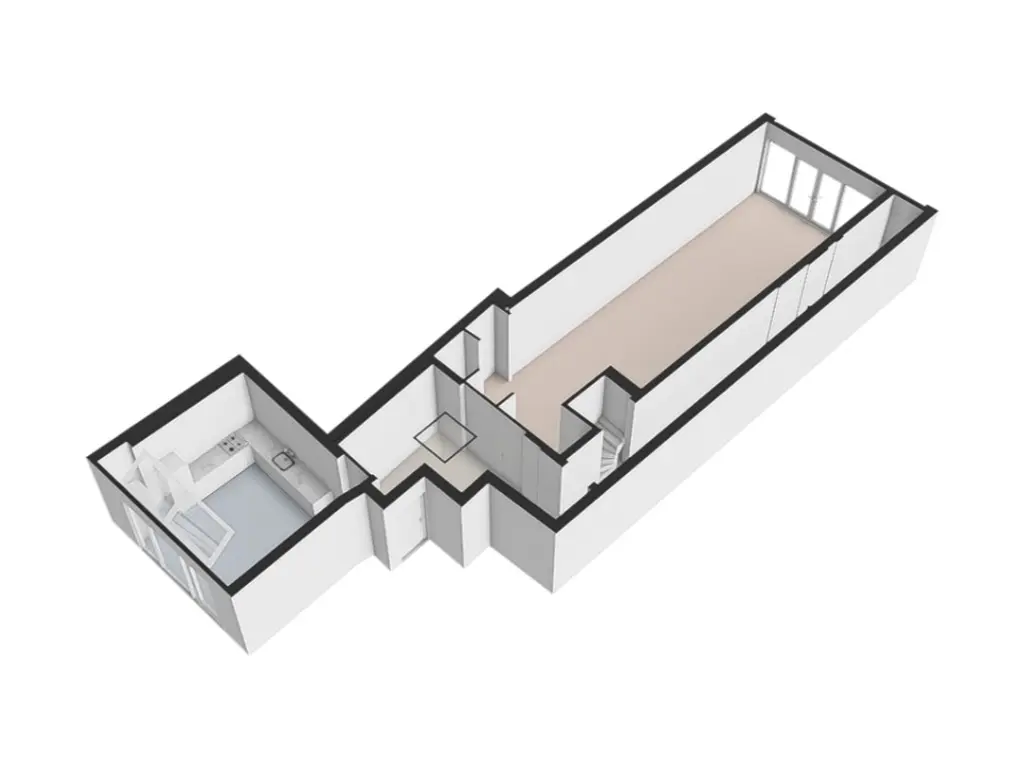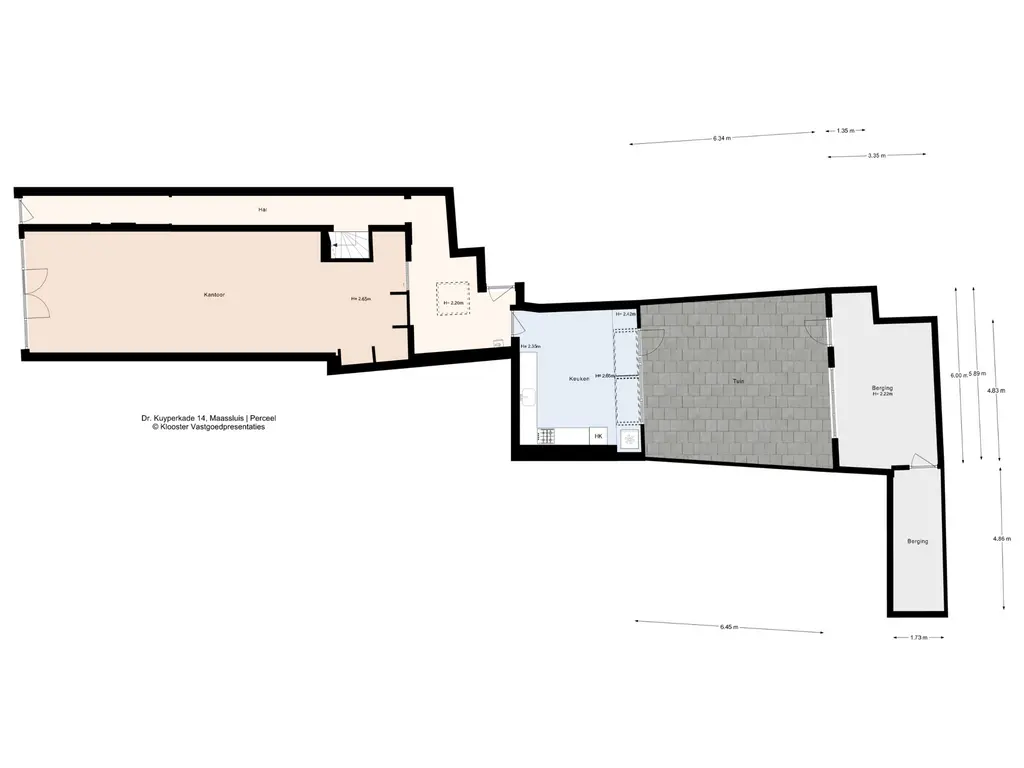 Via de rechter entree stapt u de winkelruimte binnen, die doorloopt naar de achtergelegen gang en de ruime keuken in hoekopstelling. Deze keuken is licht en geeft via openslaande deur toegang tot de tuin – een groot pluspunt midden in de stad. Achter in de tuin vind u een berging.