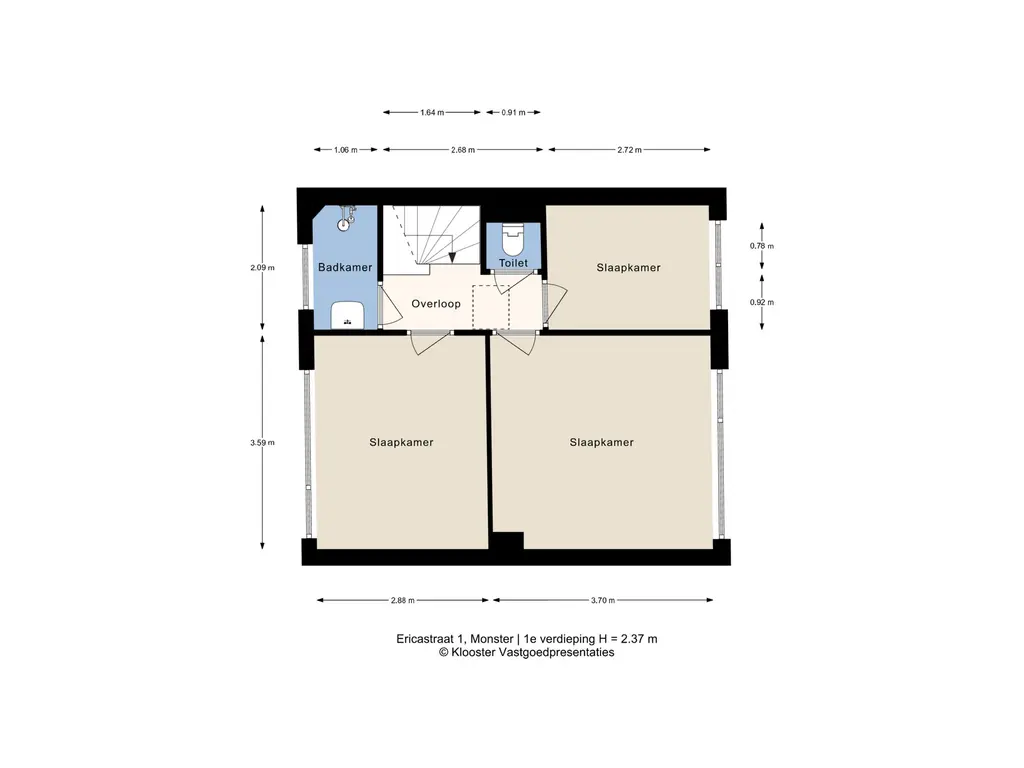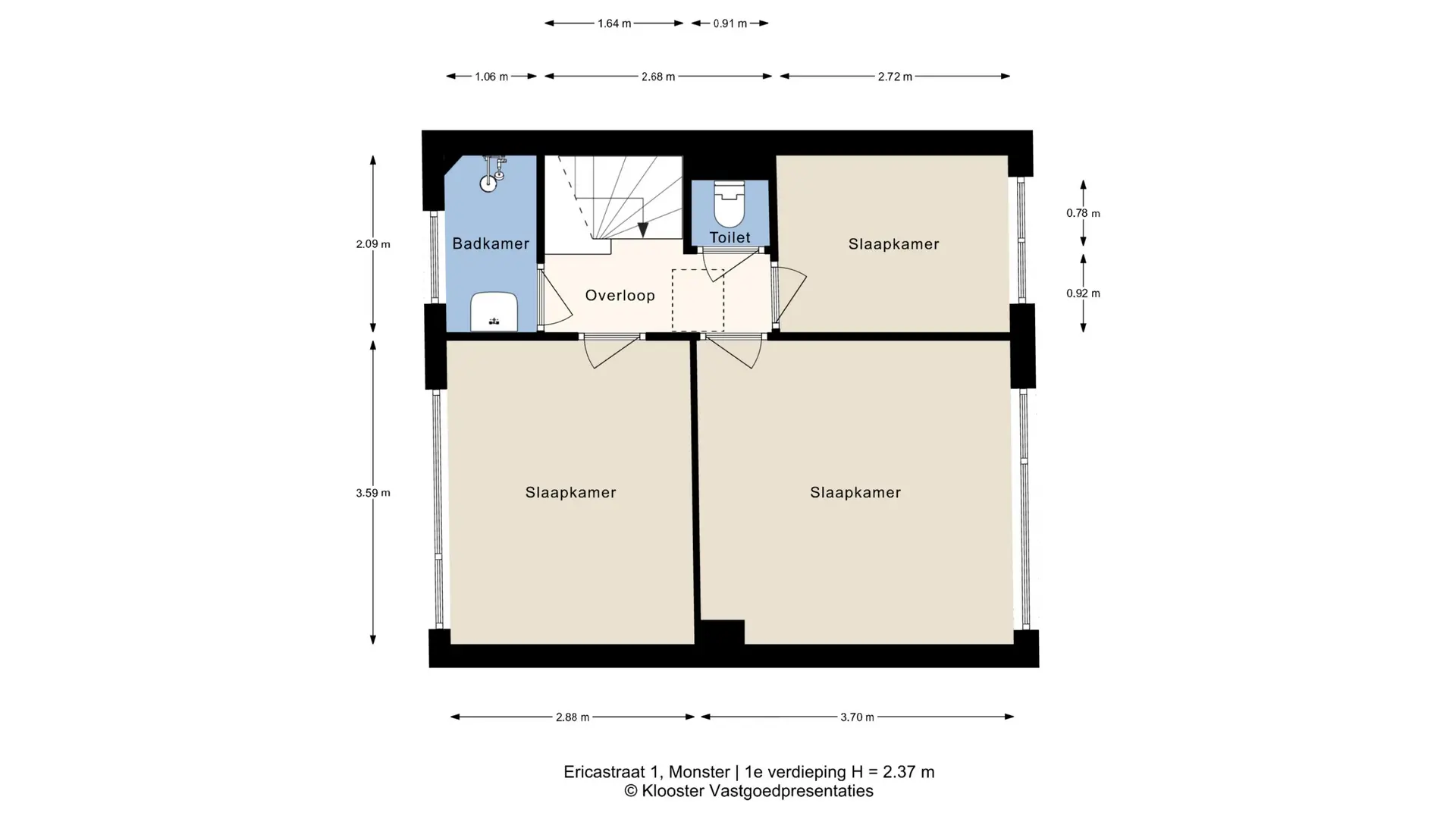 Op de eerste verdieping bevinden zich drie slaapkamers en een badkamer met wastafel en douche.