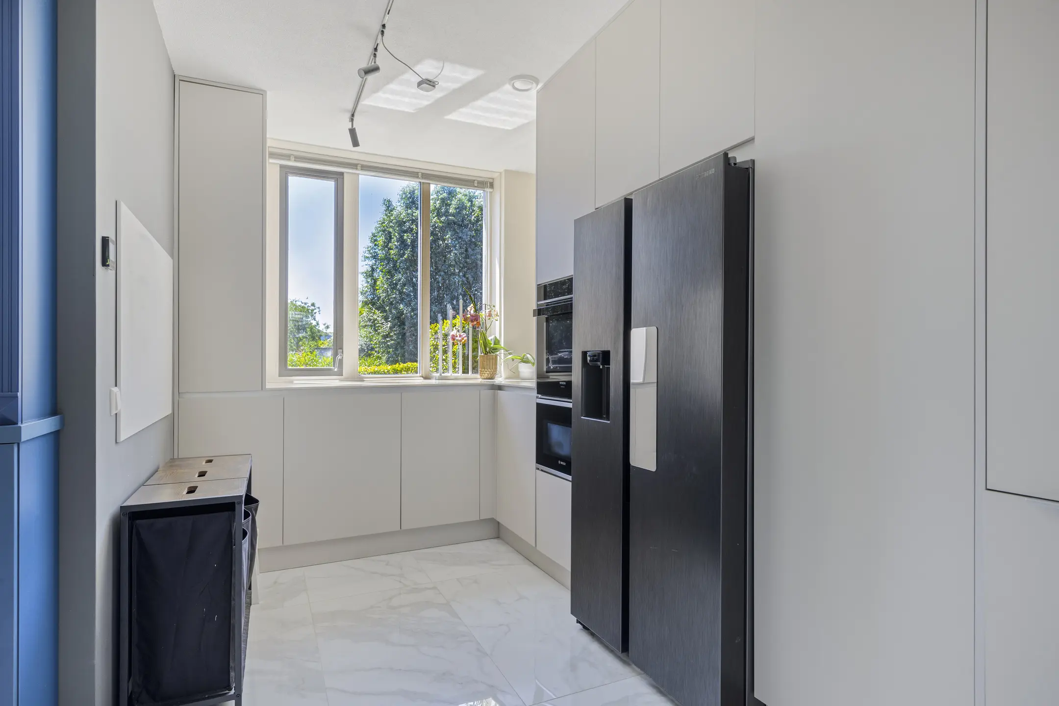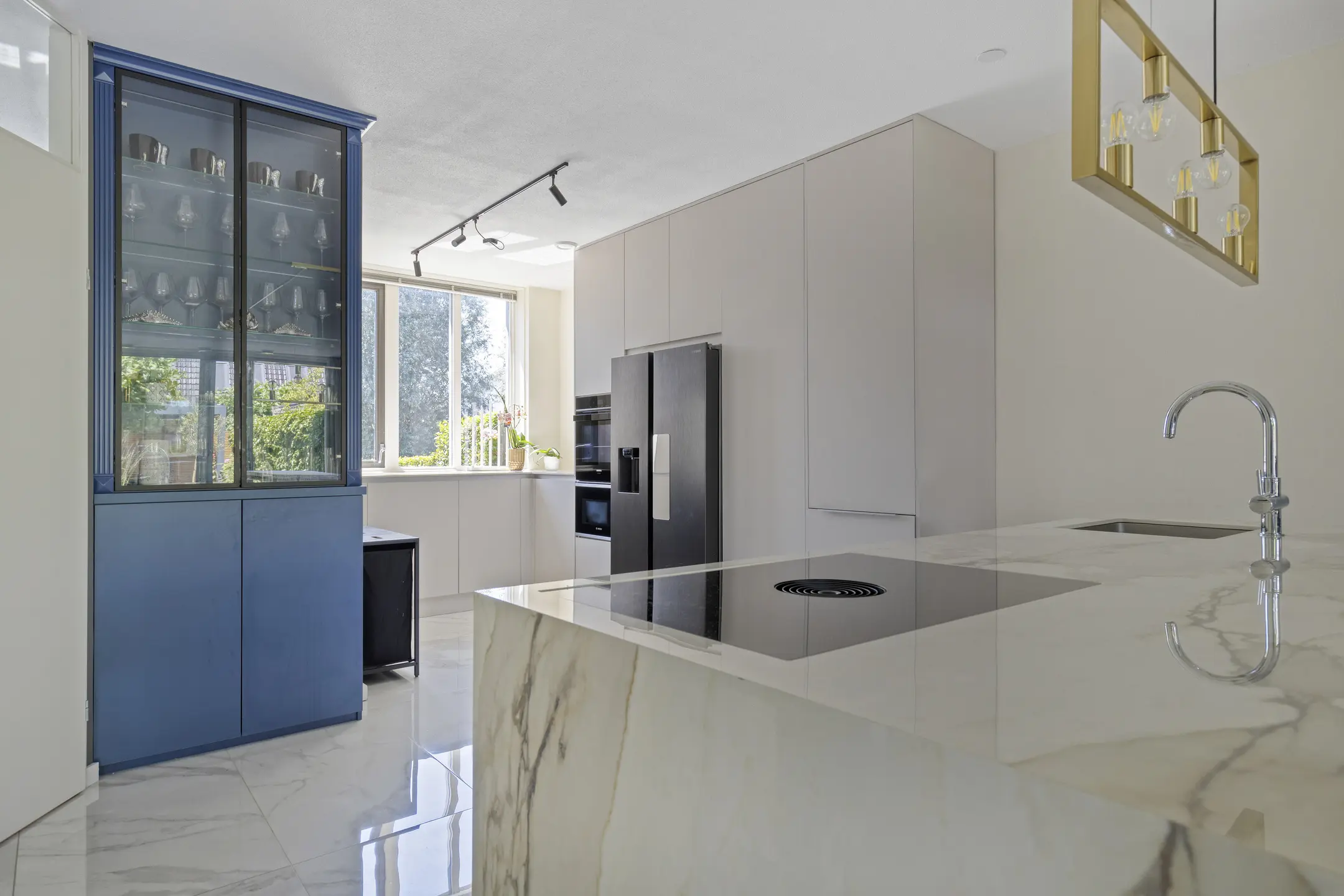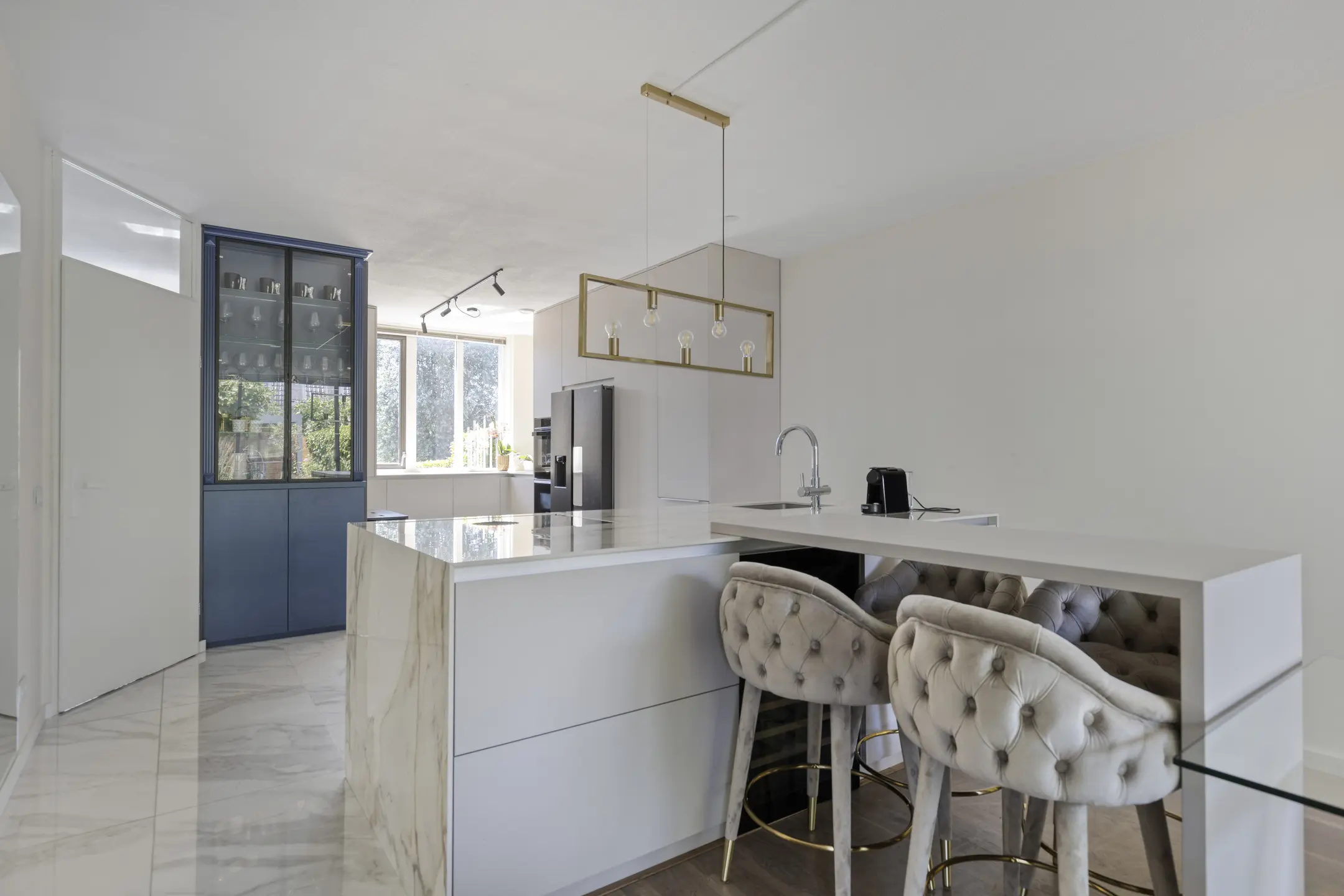 The entrance is bright due to the windows and the light marble floor tiles. This beautiful flooring continues into the brand-new open kitchen. Renovated in April 2023, the kitchen is fully equipped with high-end built-in appliances, including a Bora induction hob with integrated extractor, wine fridge, Quooker, dishwasher, oven, and fridge-freezer. A stunning royal blue china cabinet, reaching to the ceiling, has also been installed here. Underfloor heating ensures comfort during colder months.