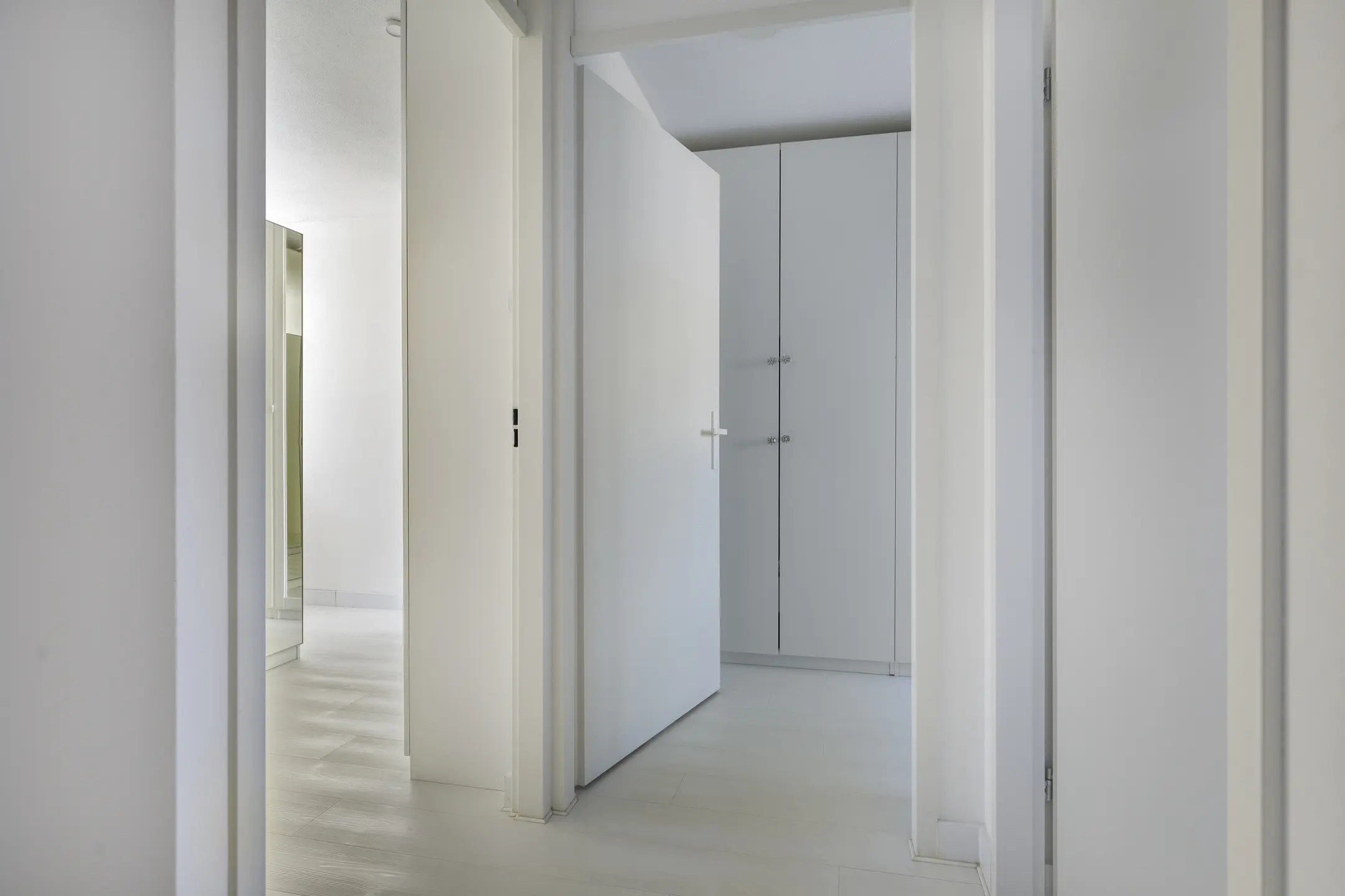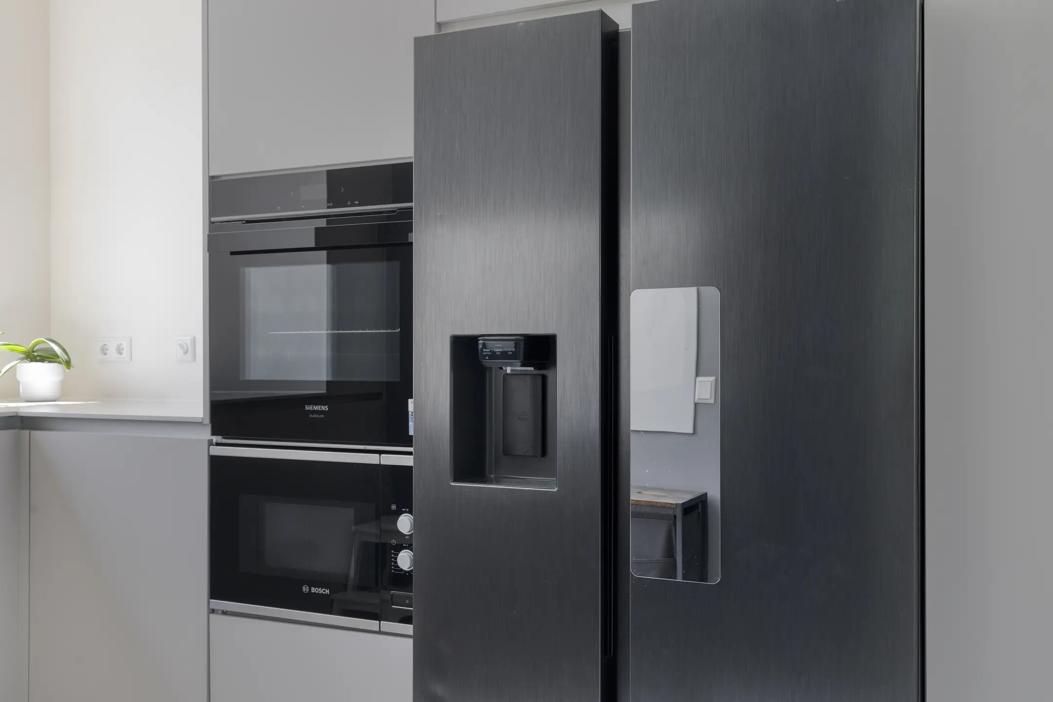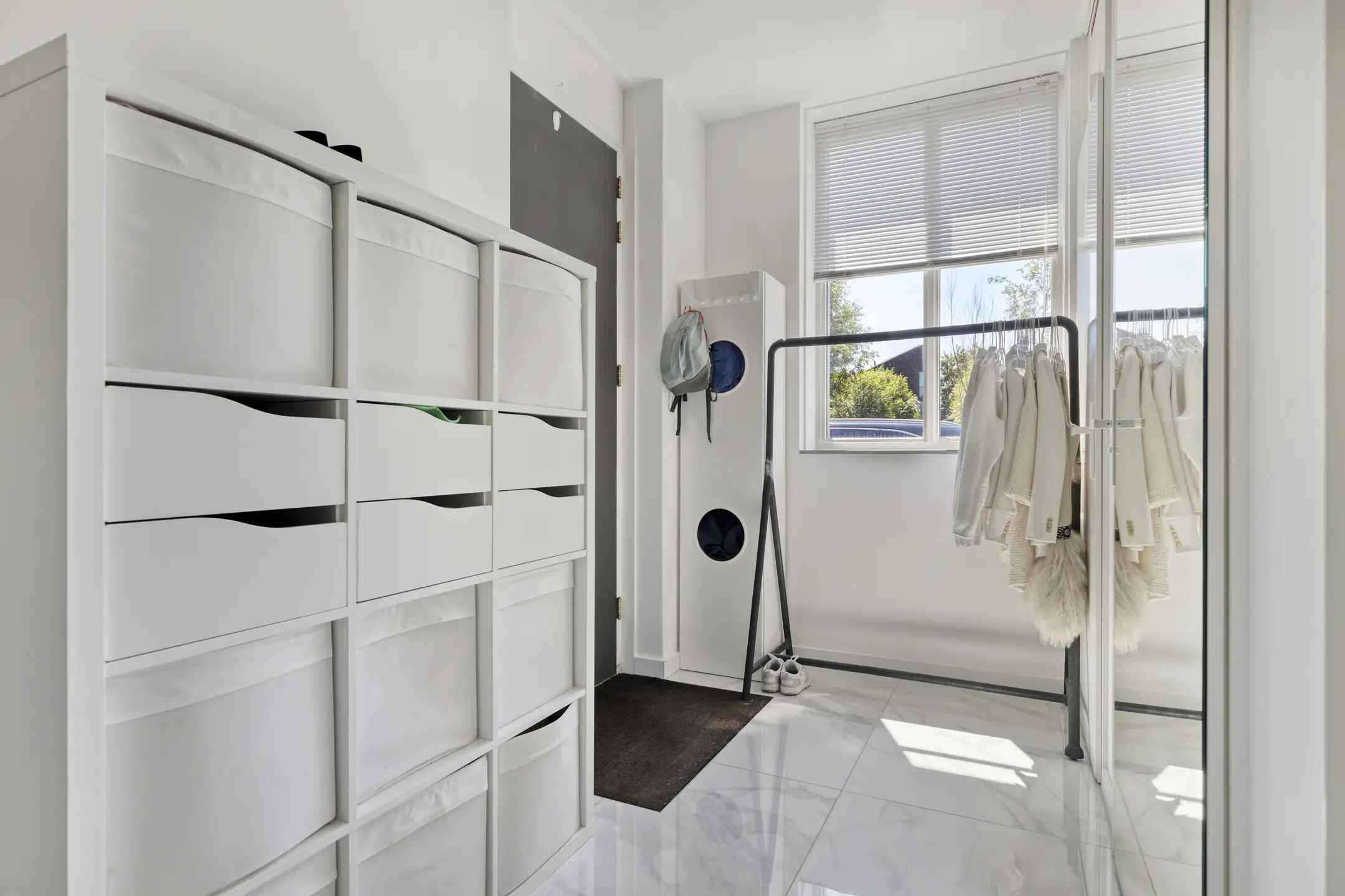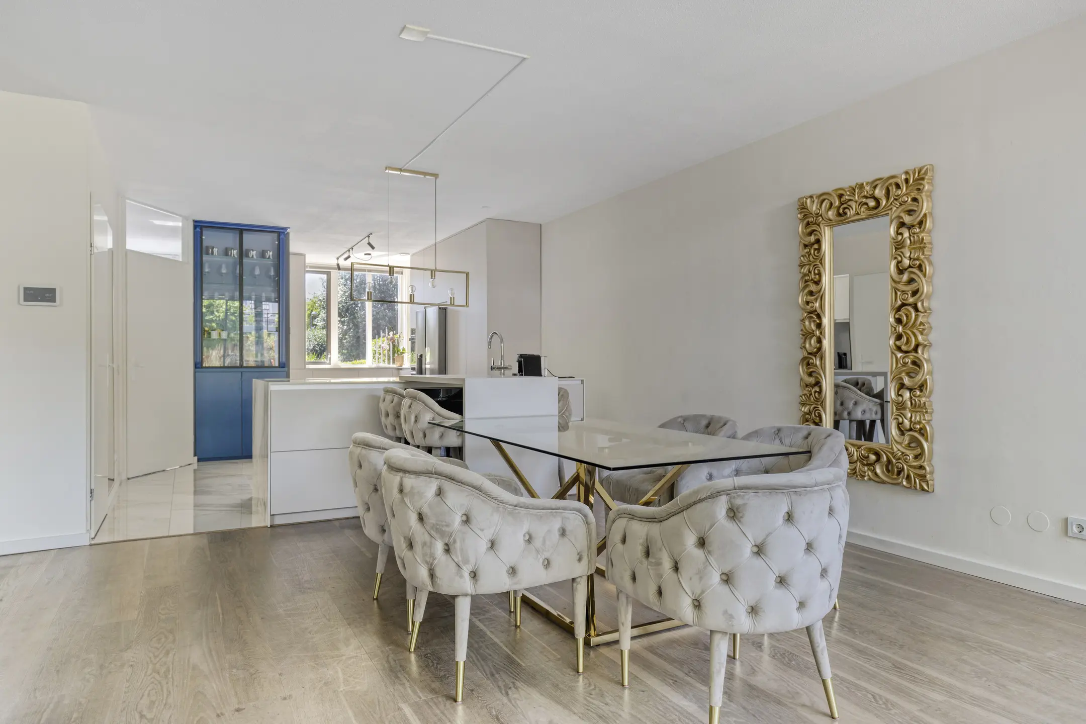 The entrance is bright due to the windows and the light marble floor tiles. This beautiful flooring continues into the brand-new open kitchen. Renovated in April 2023, the kitchen is fully equipped with high-end built-in appliances, including a Bora induction hob with integrated extractor, wine fridge, Quooker, dishwasher, oven, and fridge-freezer. A stunning royal blue china cabinet, reaching to the ceiling, has also been installed here. Underfloor heating ensures comfort during colder months.