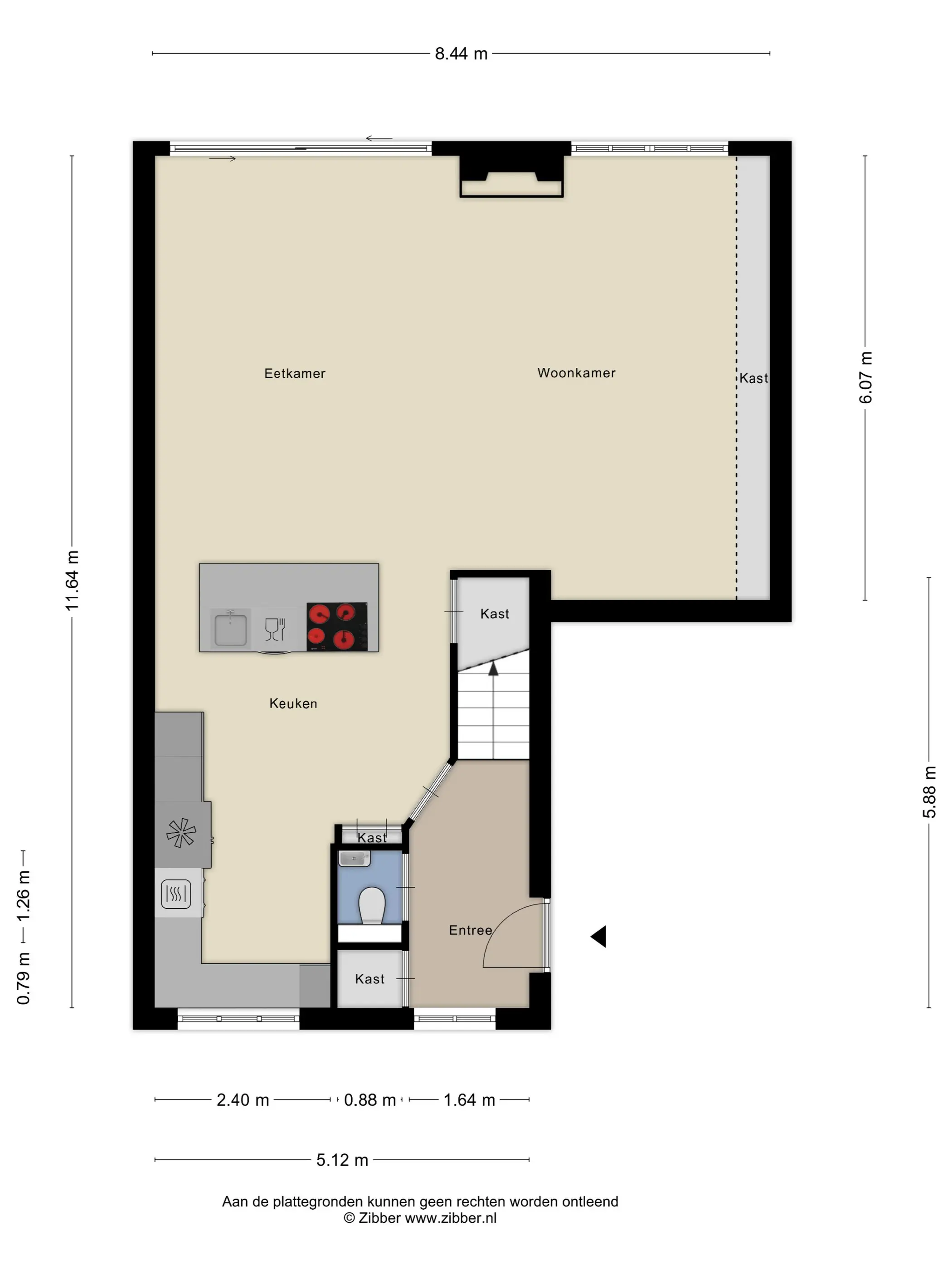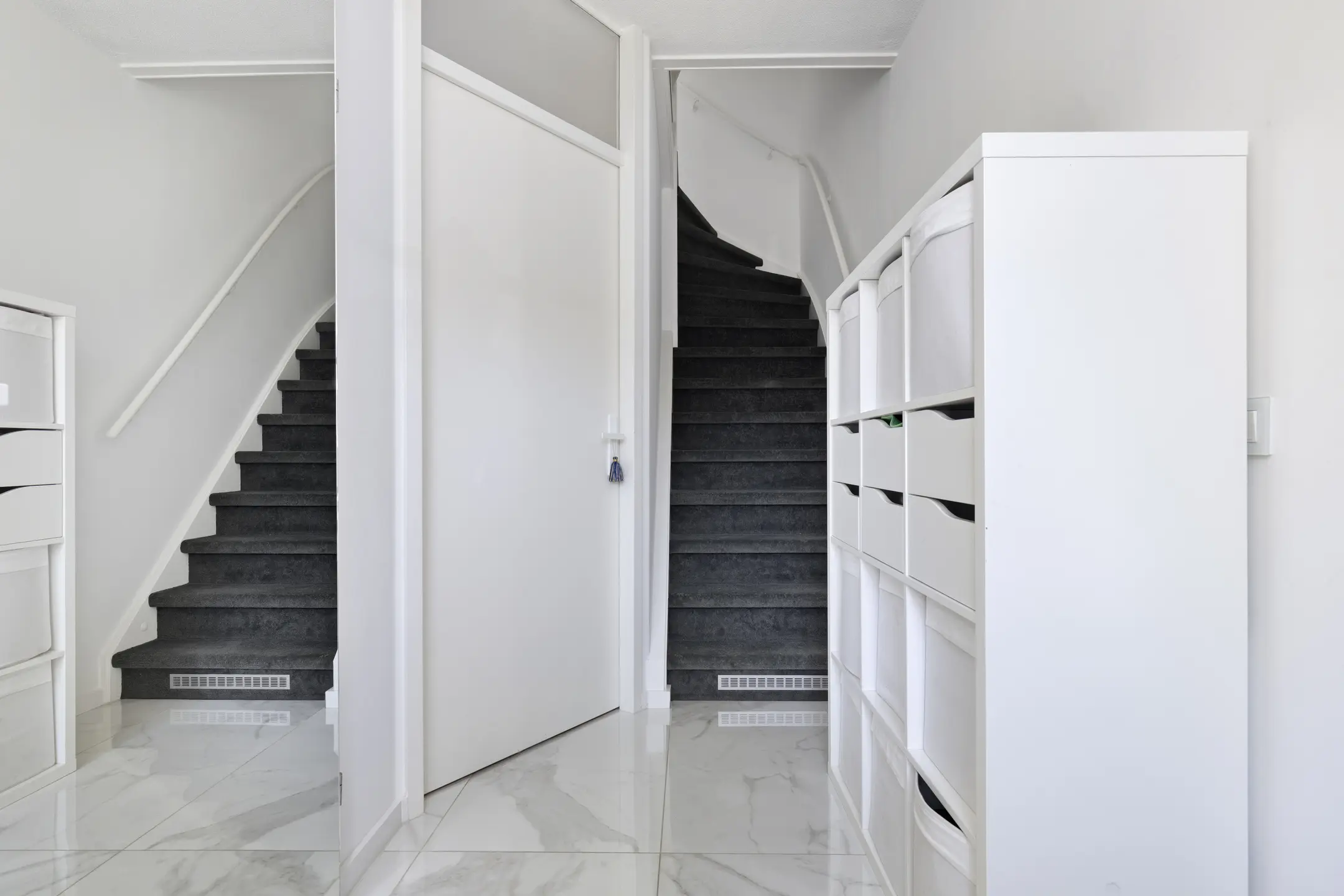 De entree van de woning is licht dankzij de raampartijen en de lichte marmeren vloertegel. Deze prachtige vloer loopt door in de gloednieuwe open keuken. De keuken is in april 2023 volledig gerenoveerd en voorzien van hoogwaardige inbouwapparatuur zoals een Bora inductiekookplaat met geïntegreerde afzuiging, wijnklimaatkast, Quooker, vaatwasser, oven en koel-vriescombinatie. Ook is hier een prachtige, tot aan het plafond reikende, koningsblauwe servieskast geplaatst. Vloerverwarming is aanwezig voor de koudere maanden.