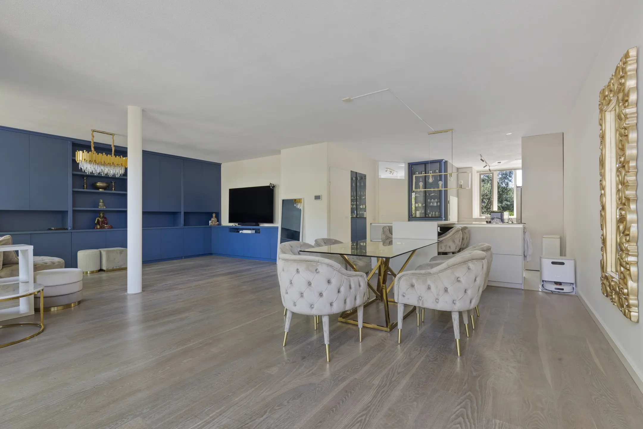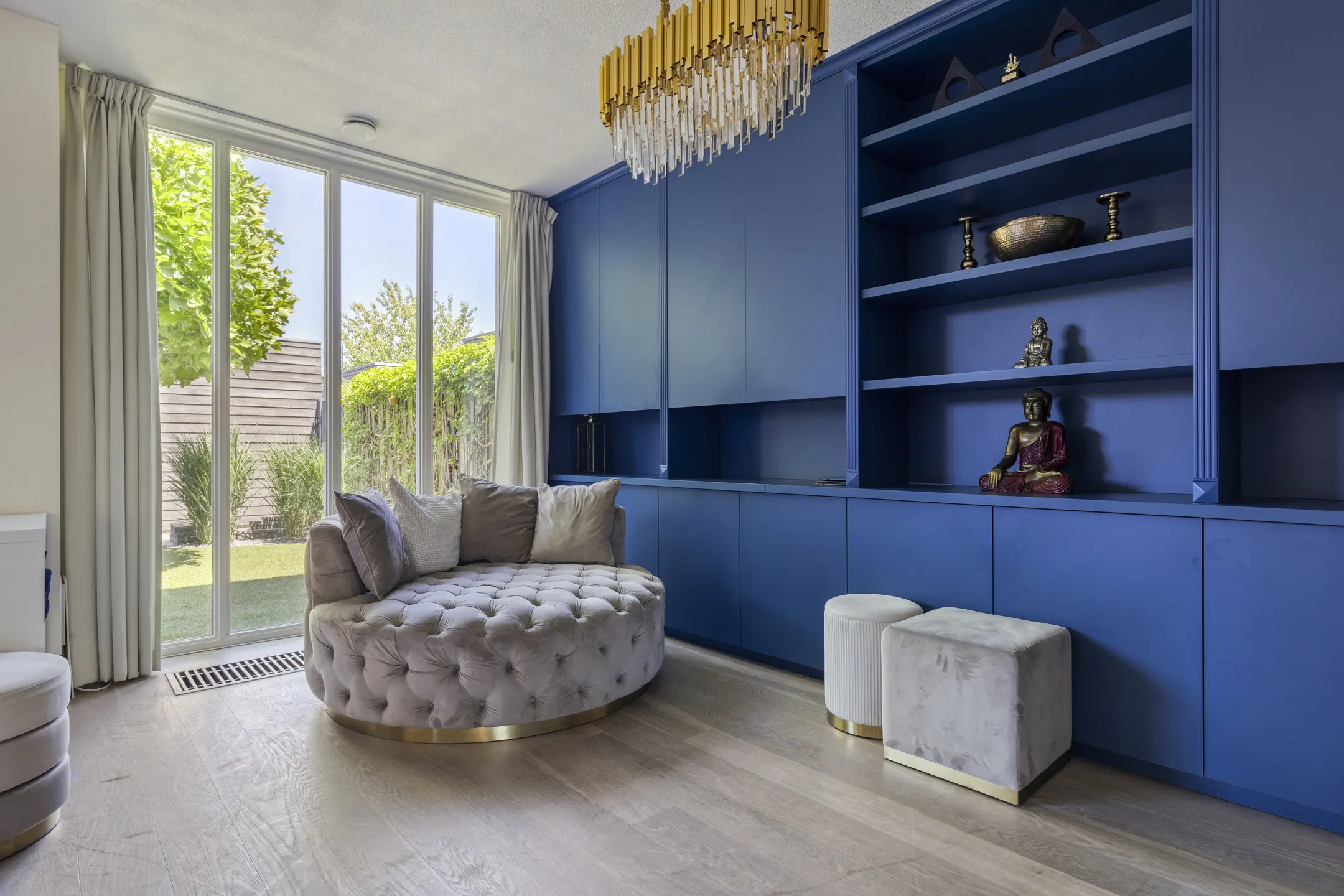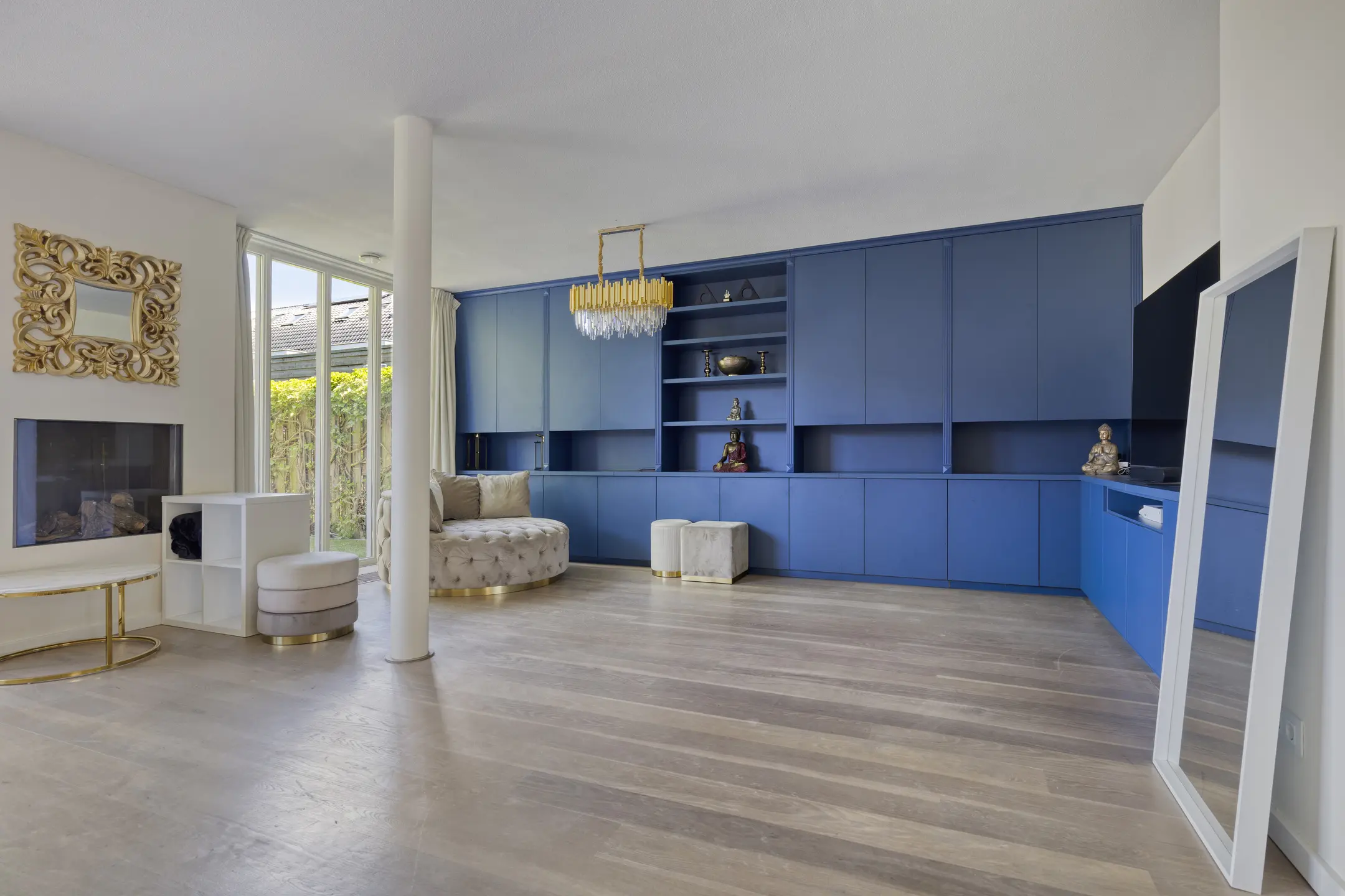 The living room is no less than 8.45 meters wide thanks to the integrated garage and has also been extended at the rear. This creates a beautiful living space, and the floor-to-ceiling windows and large sliding doors provide abundant natural light. The elegant royal blue wall and TV cabinets exude luxury, as does the sleek gas fireplace. The white-wash oak flooring is fitted with floor convectors.