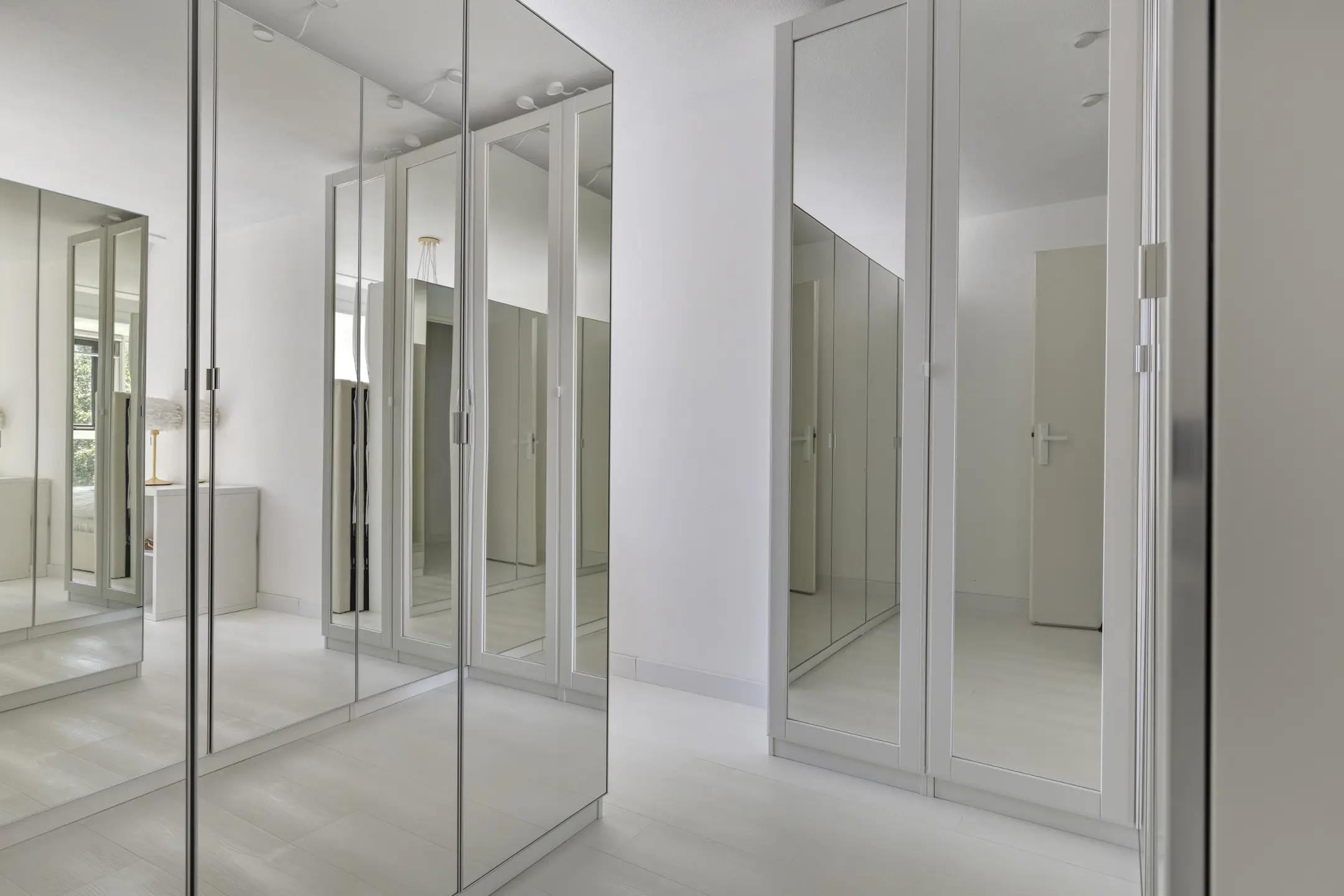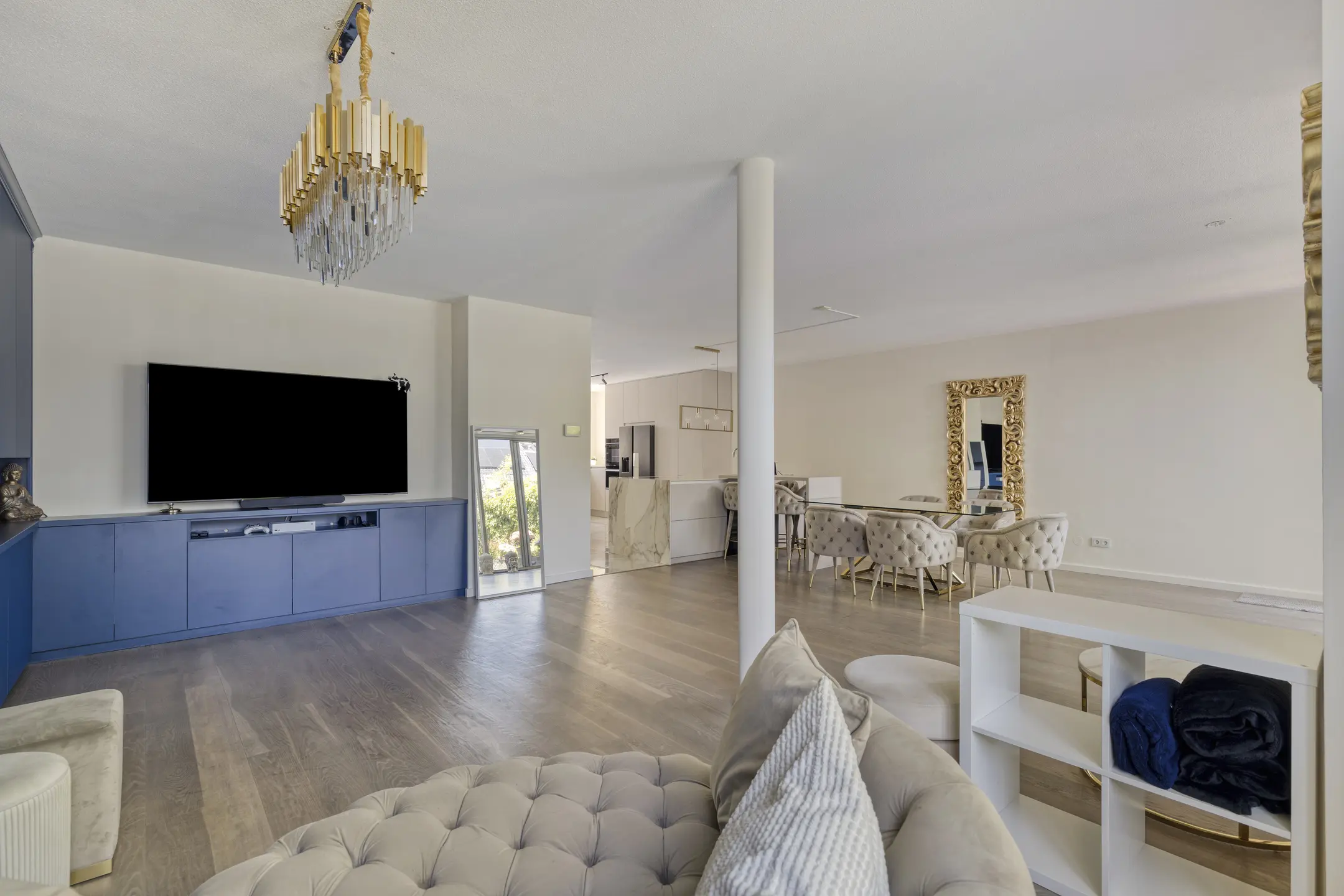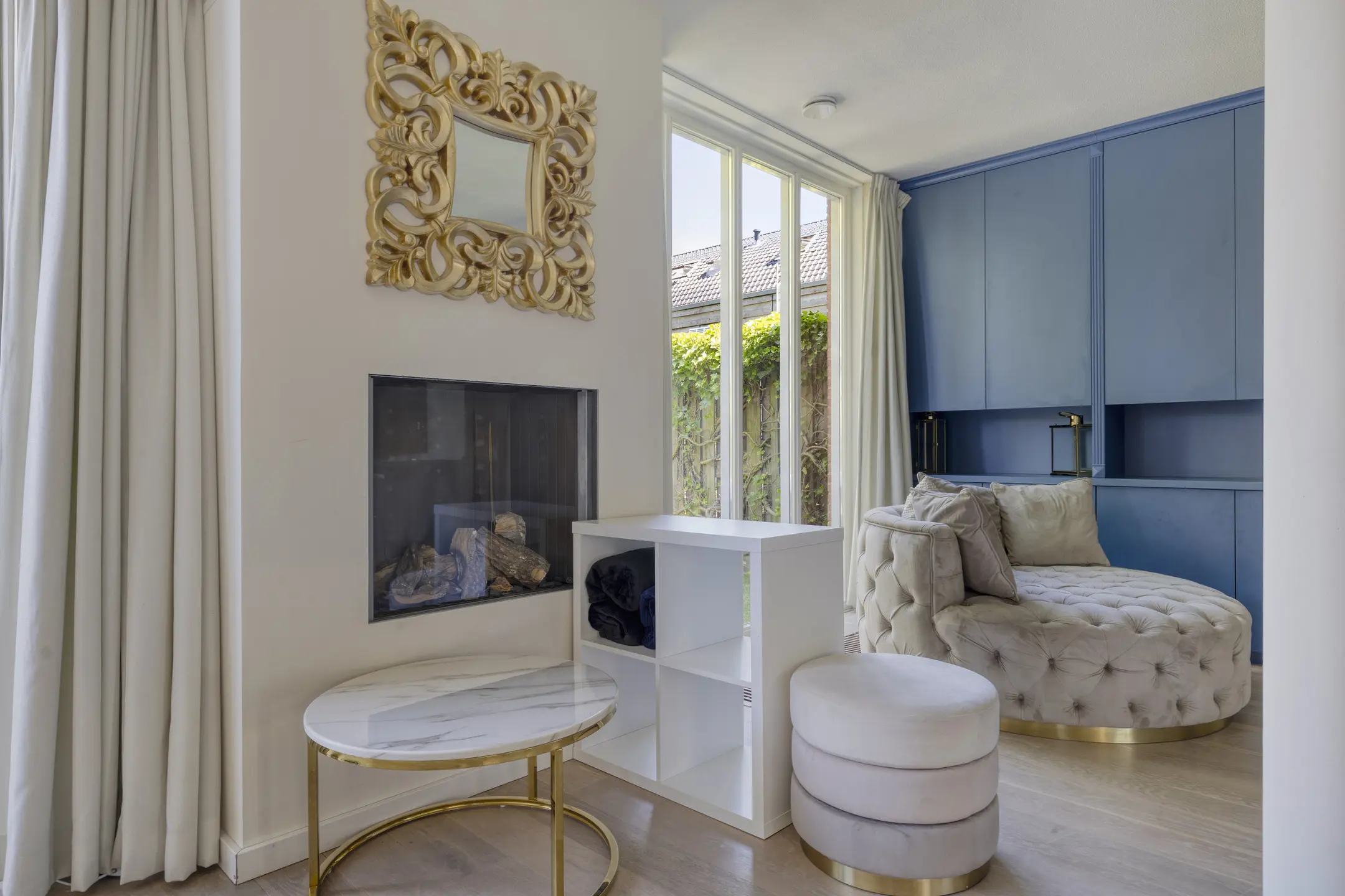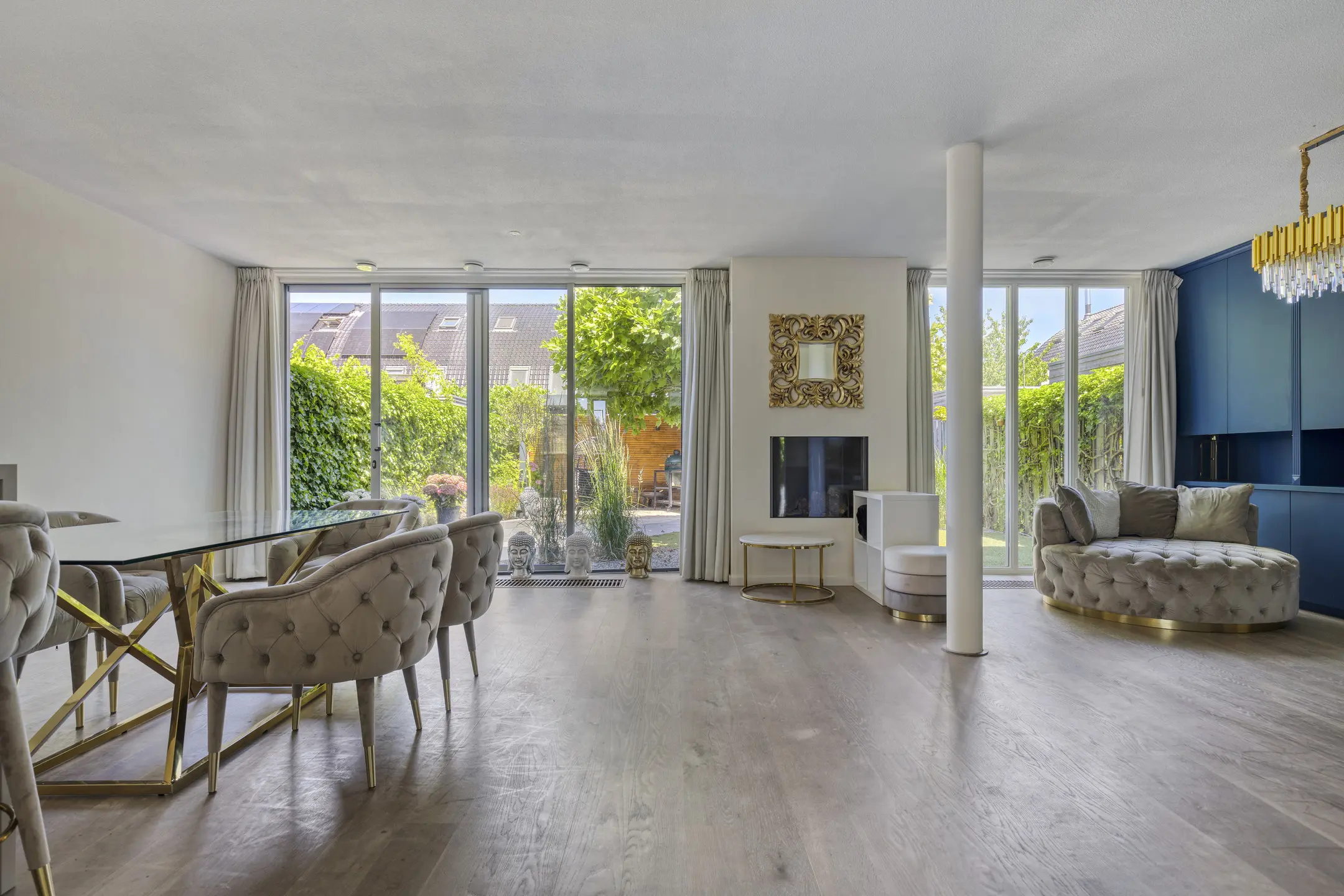 The living room is no less than 8.45 meters wide thanks to the integrated garage and has also been extended at the rear. This creates a beautiful living space, and the floor-to-ceiling windows and large sliding doors provide abundant natural light. The elegant royal blue wall and TV cabinets exude luxury, as does the sleek gas fireplace. The white-wash oak flooring is fitted with floor convectors.