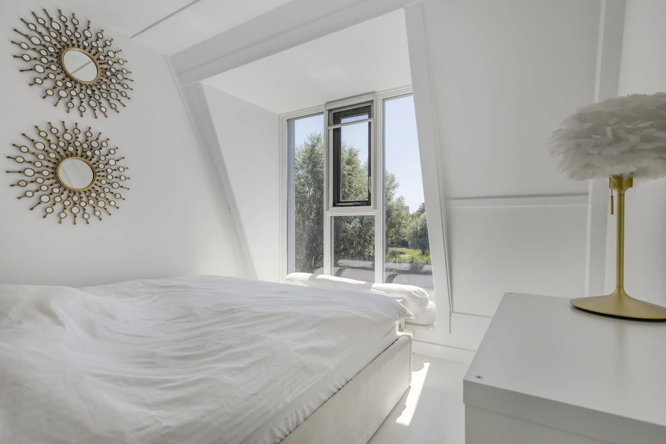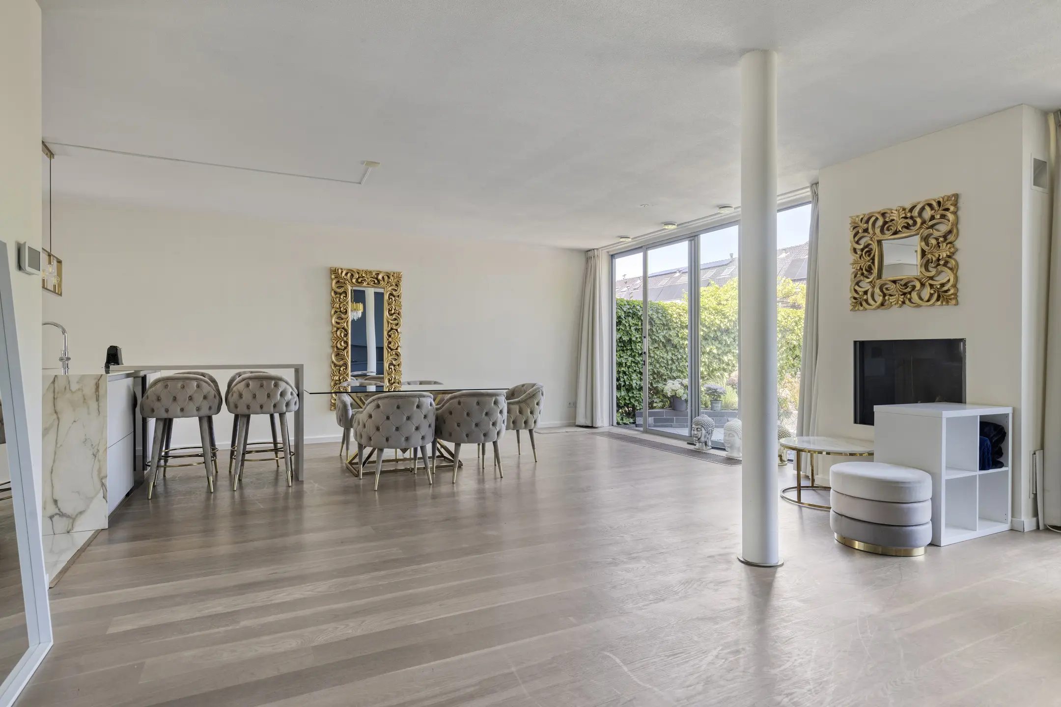 - Ruime, uitgebouwde woonkamer met white-washvloer, vloer-tot-plafond hoge ramen, schuifpui en Gashaard.