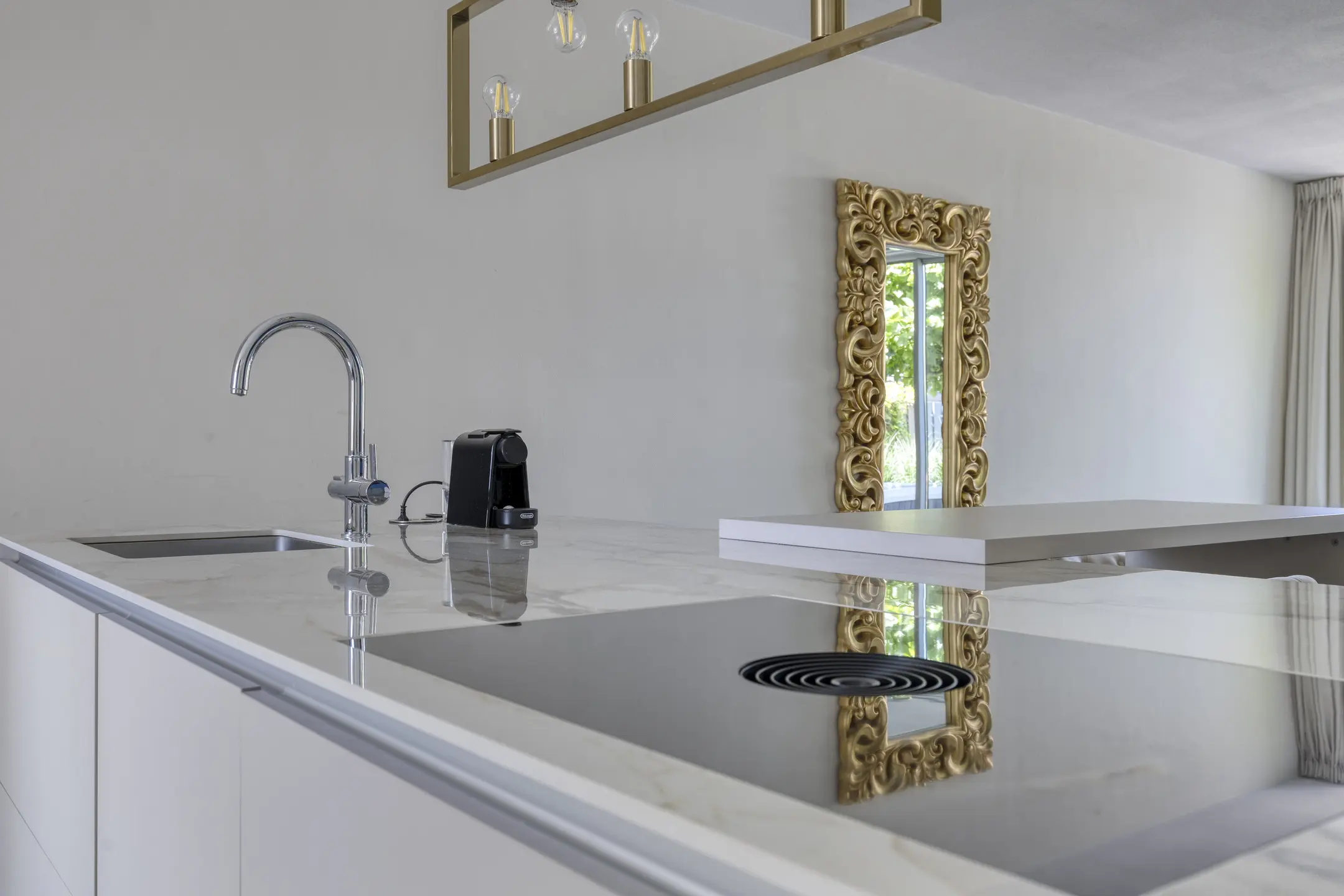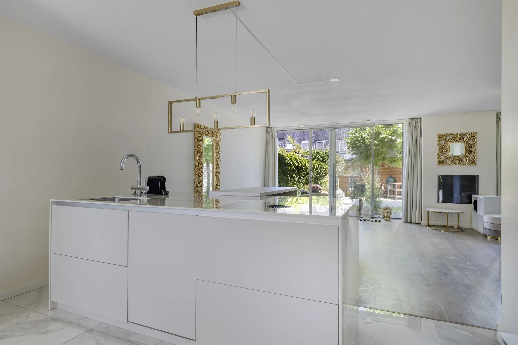 - Luxe open keuken (2023) met marmeren vloertegels, vloerverwarming, kookeiland, Bora inductiekookplaat met - Geïntegreerde afzuiging, wijnklimaatkast, Quooker, oven, vaatwasser en koel-vriescombinatie;