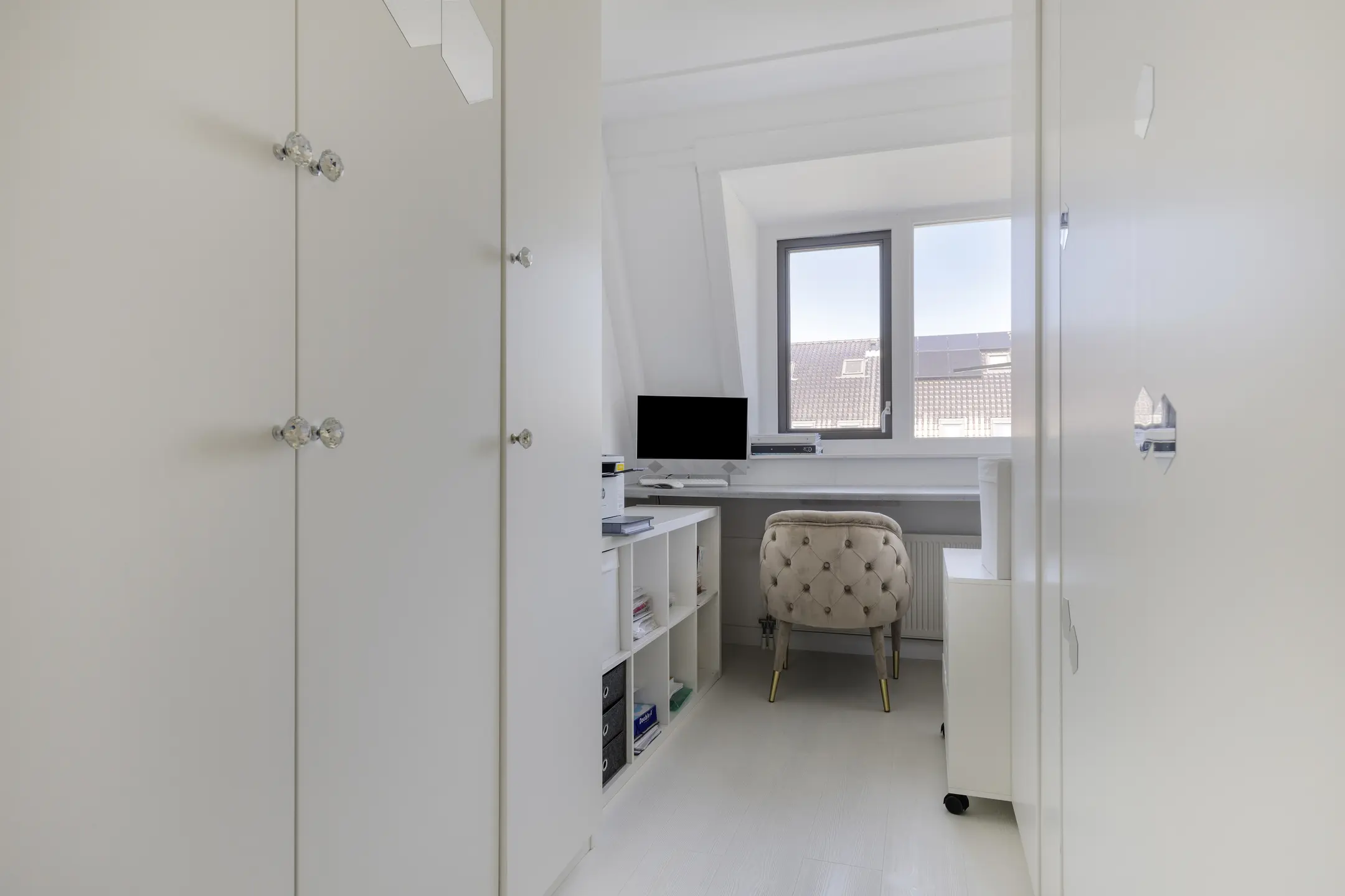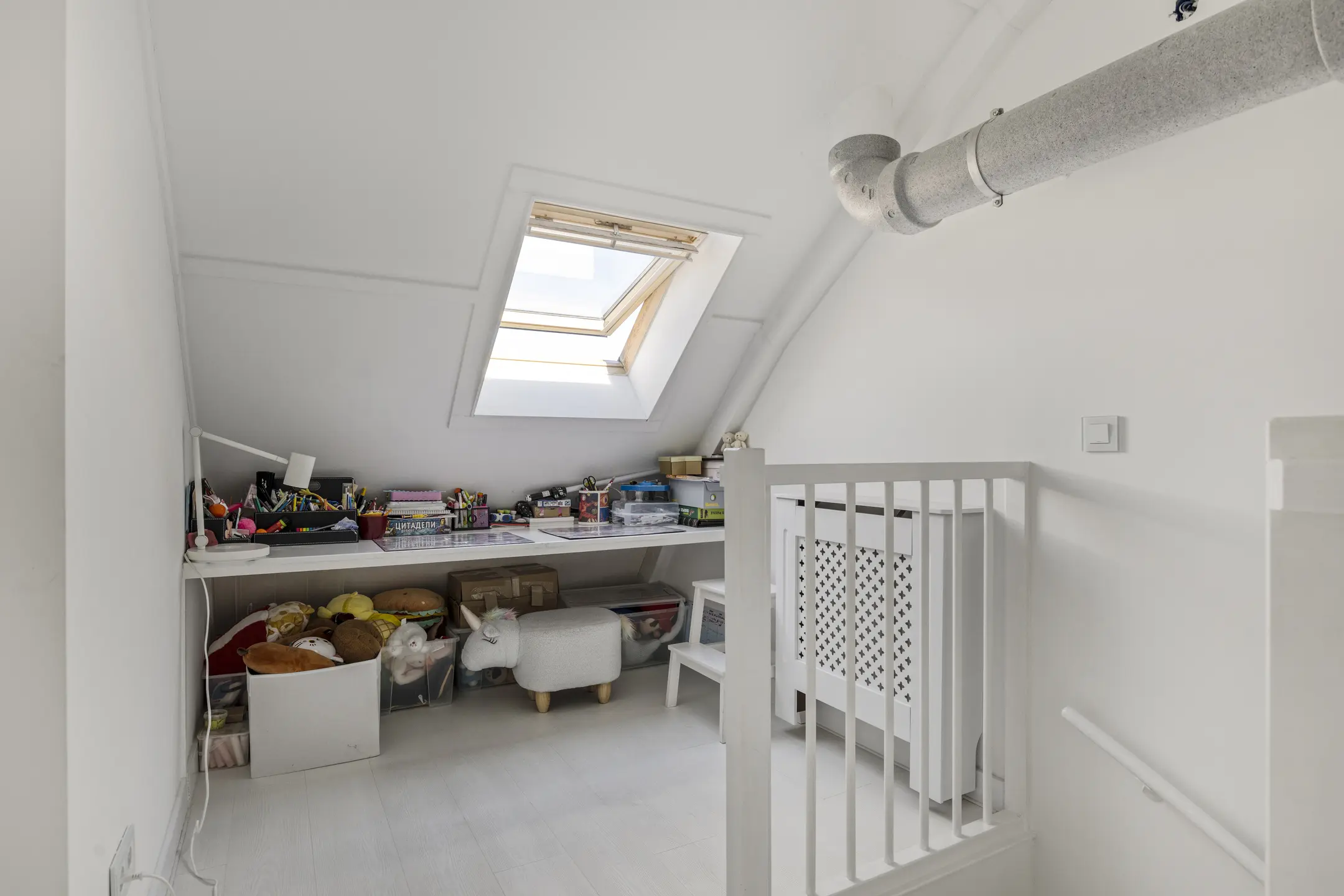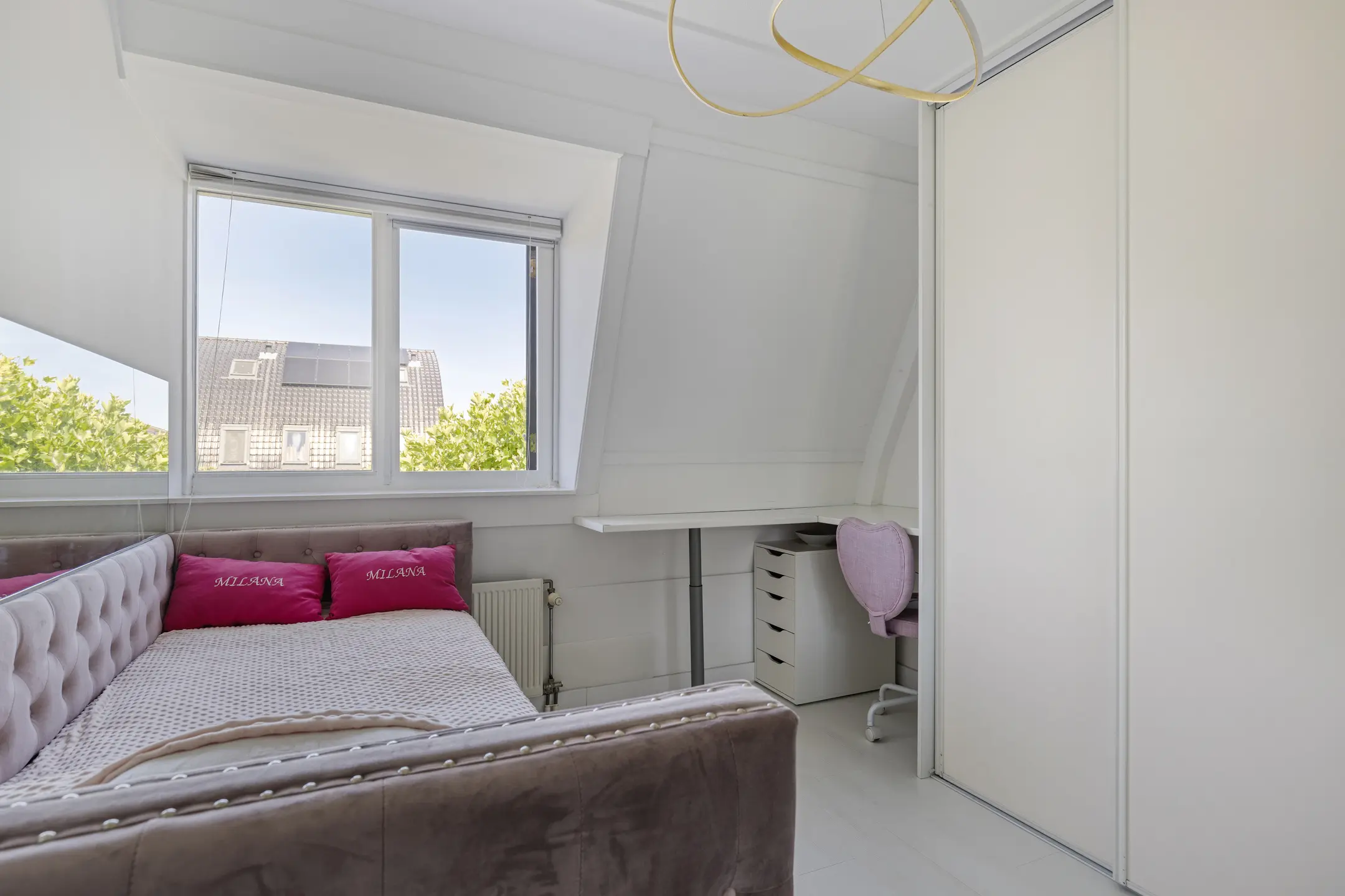 The first floor features three bedrooms where the charming effect of the curved roof is already visible. The large dormer windows provide ample light and space. The bathroom, also completely renovated in April 2023, includes a bathtub, wide washbasin, toilet, and a spacious walk-in shower with a ceiling-mounted rain shower. Marble floor tiles and fresh aqua-colored wall tiles have been used beautifully here. This floor also has underfloor heating.