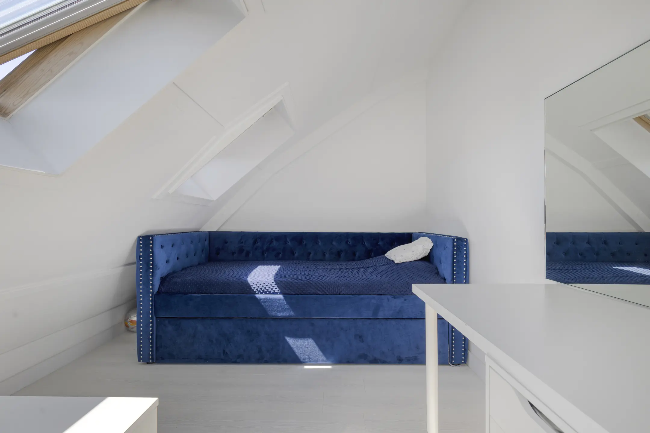 The second floor has two additional bedrooms. Multiple Velux skylights allow plenty of natural light while being fitted with blackout shades. Ample storage space is available under the curved roof.