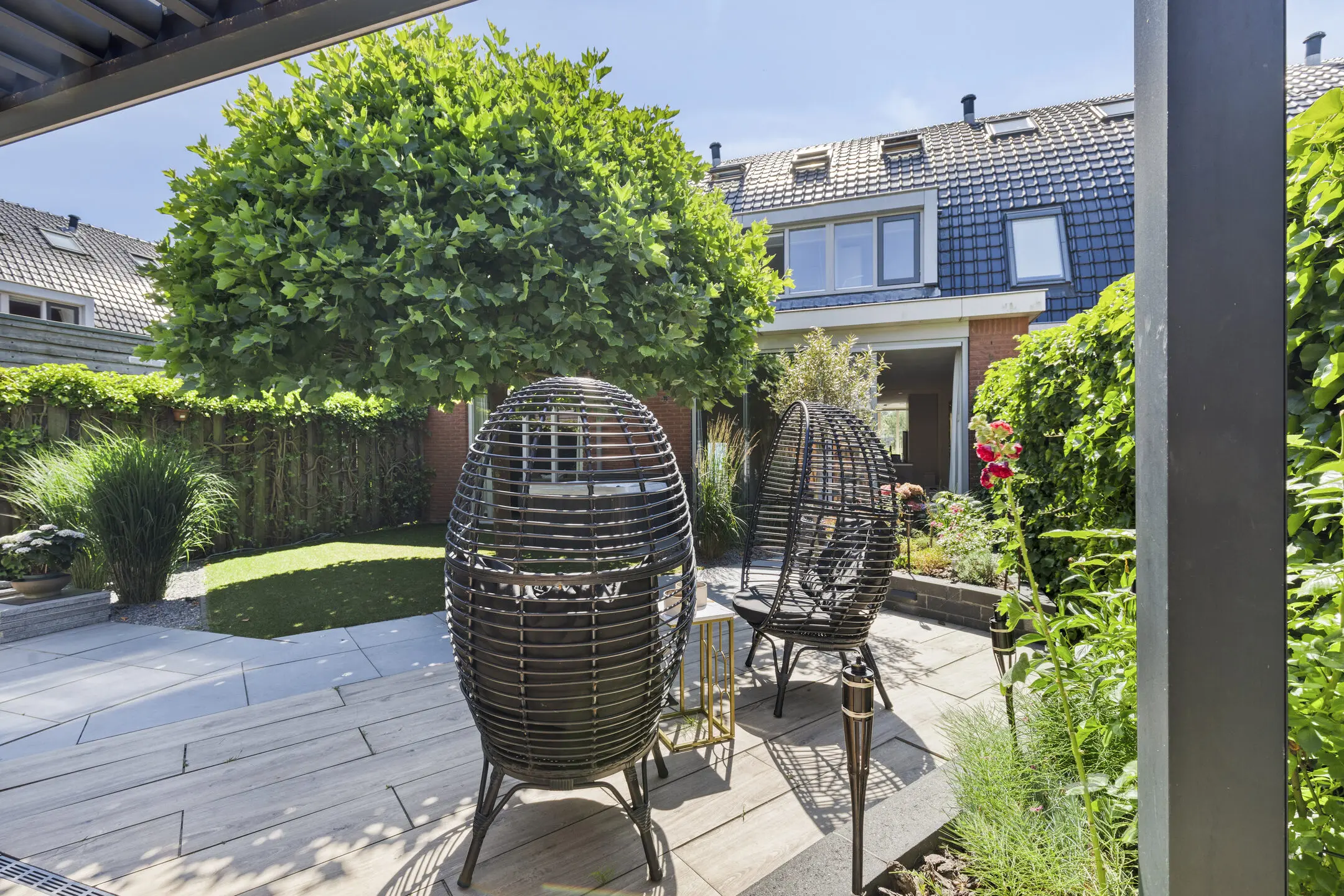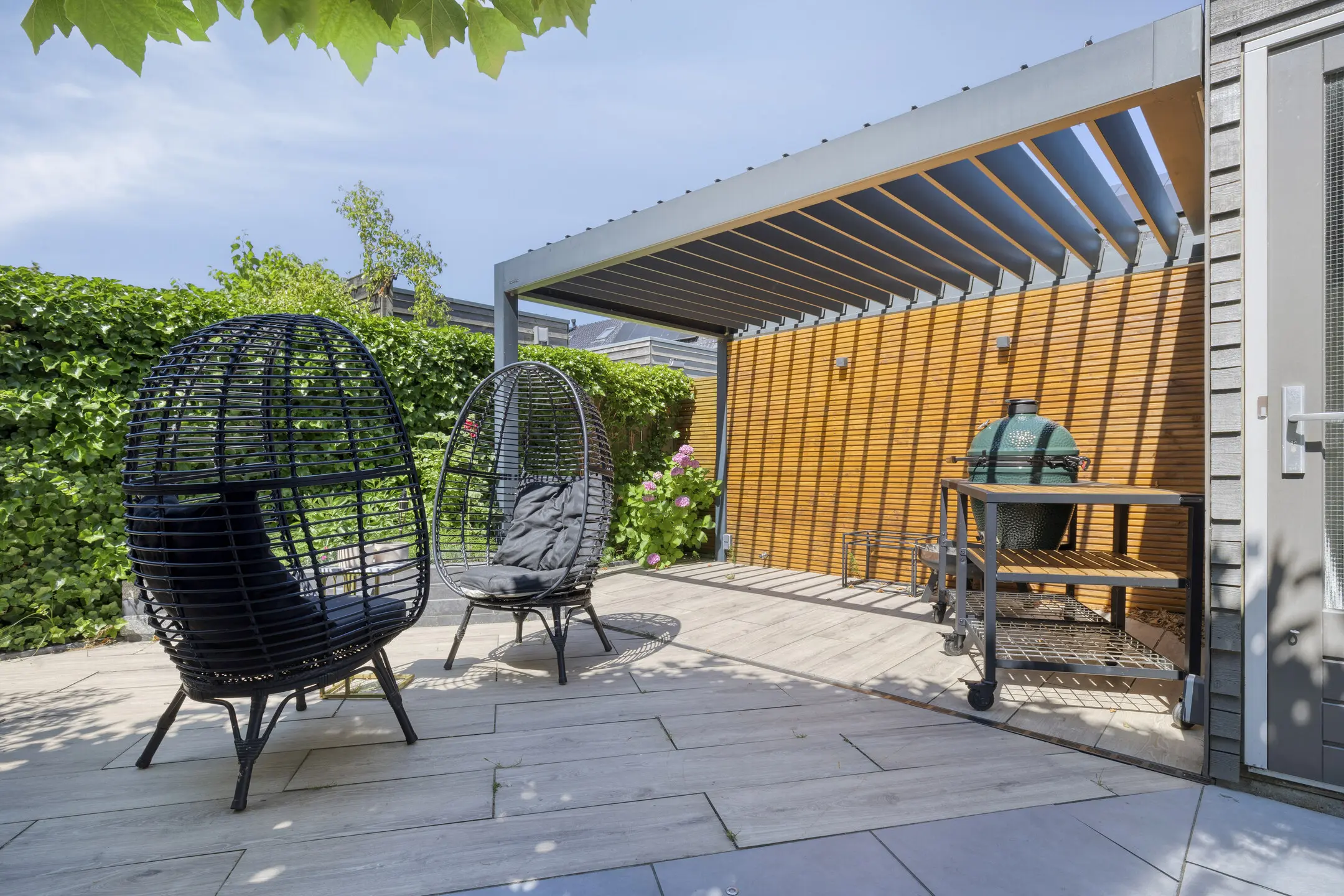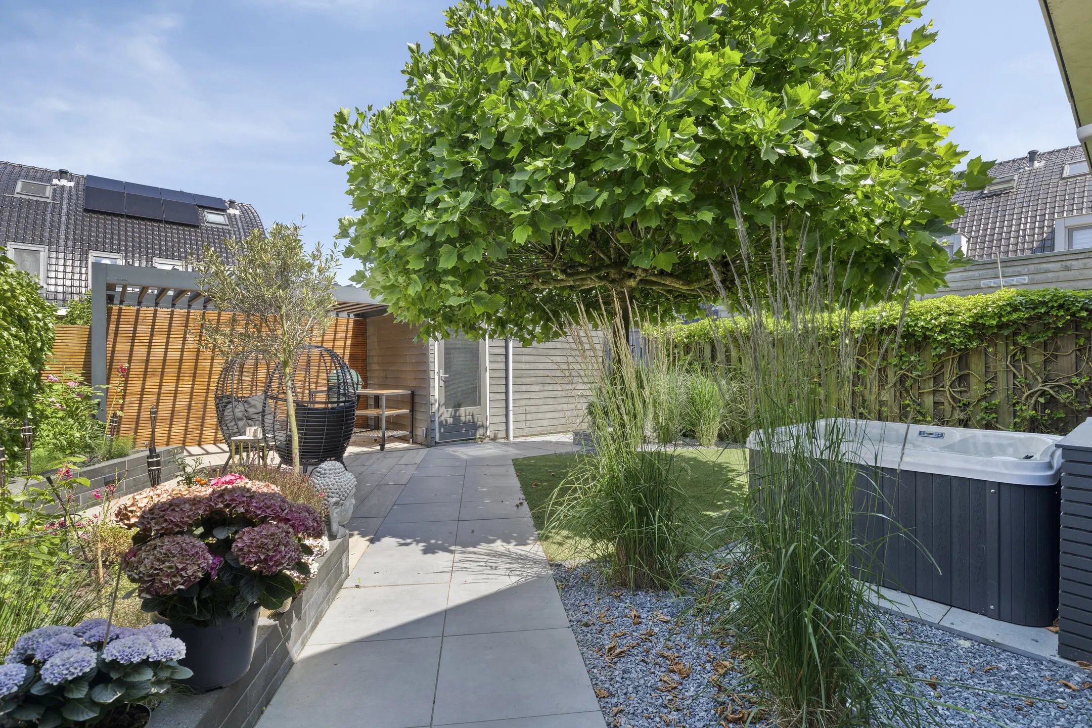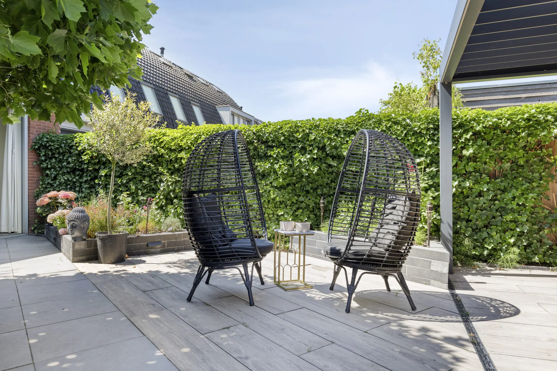 - Architectonisch aangelegde tuin (2020) met berging, achterom, aluminium overkapping, gashaard en strategische