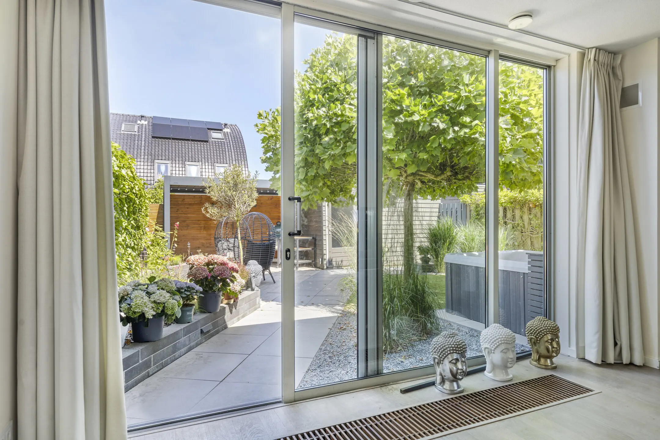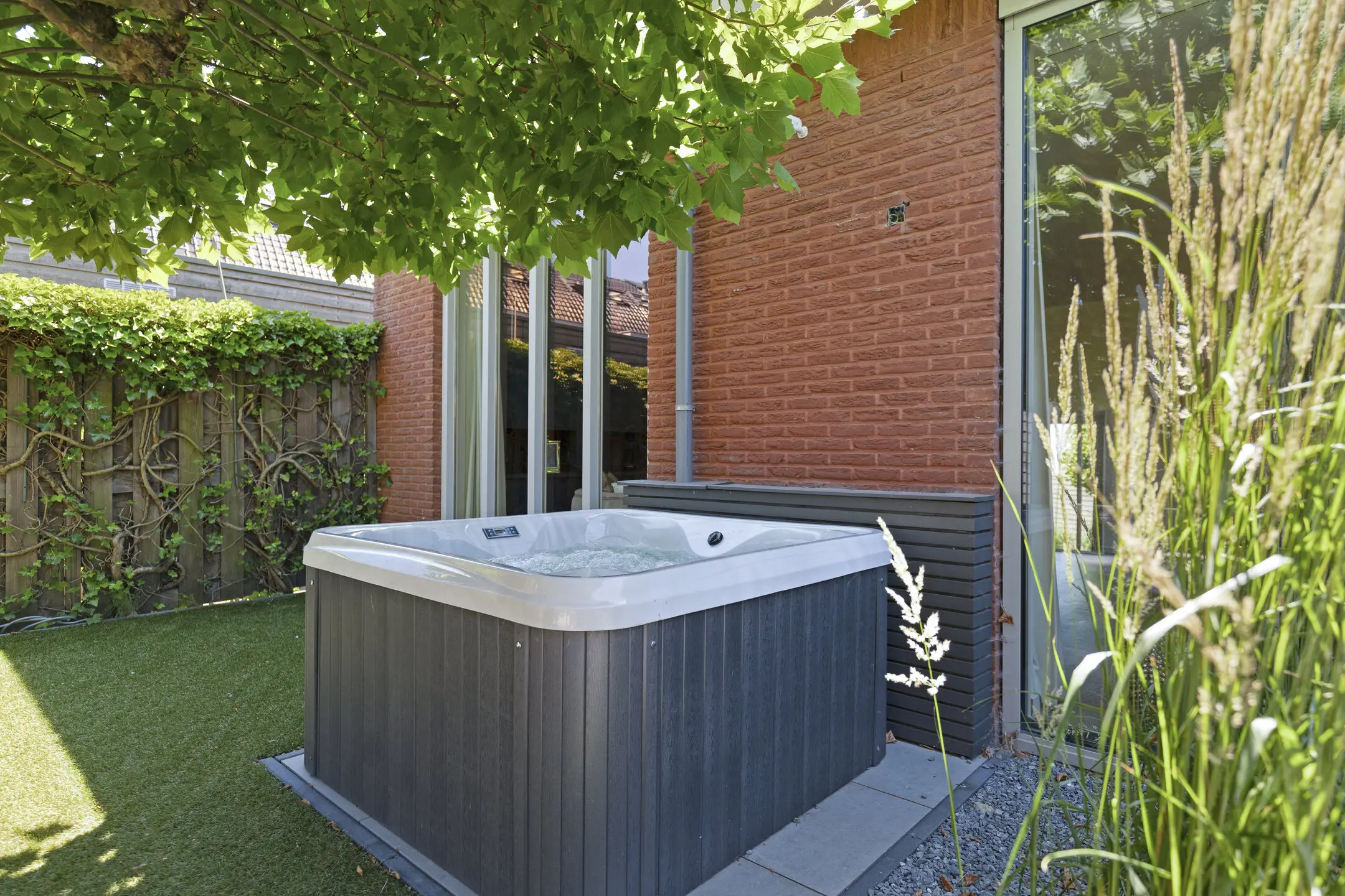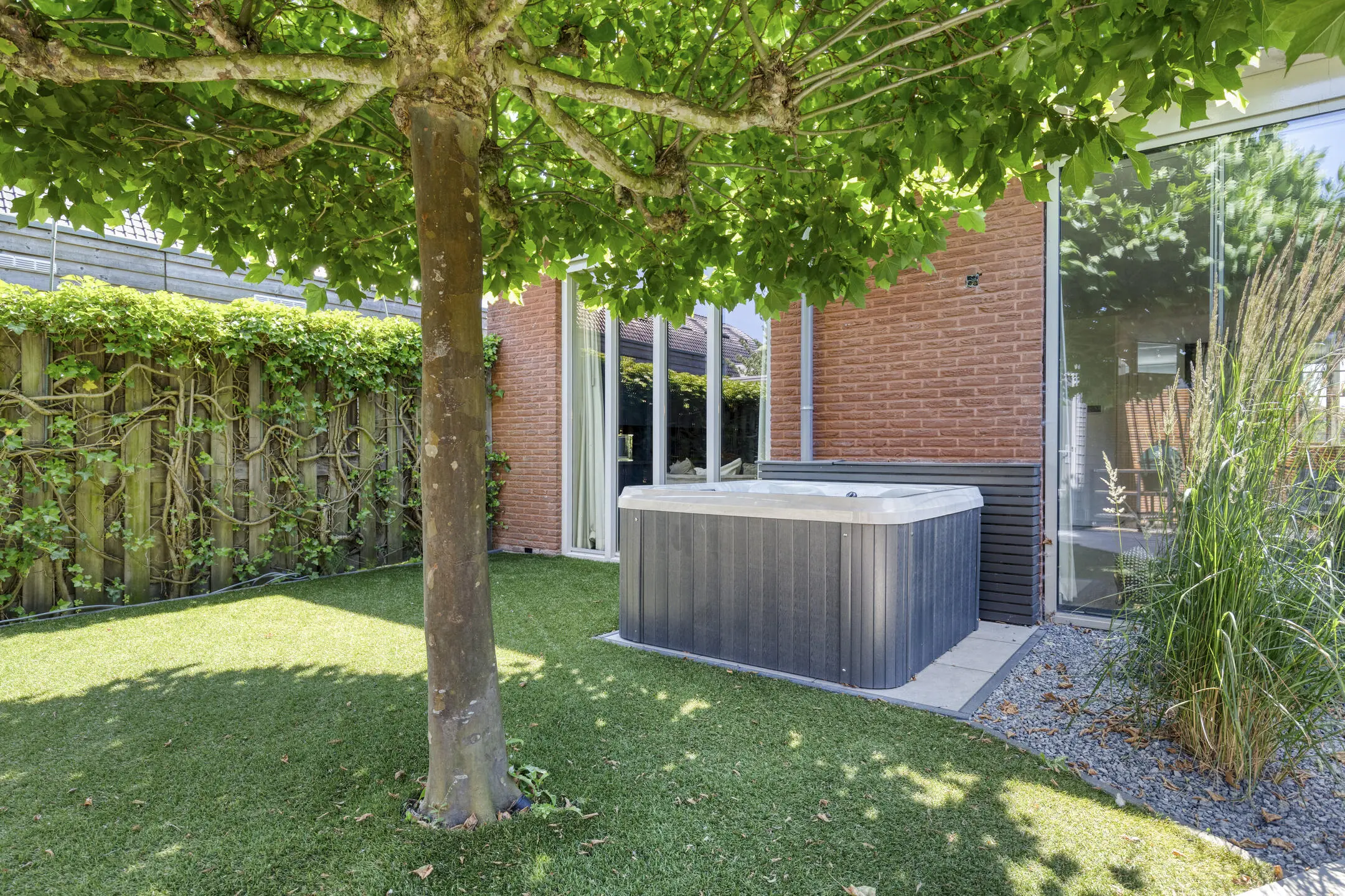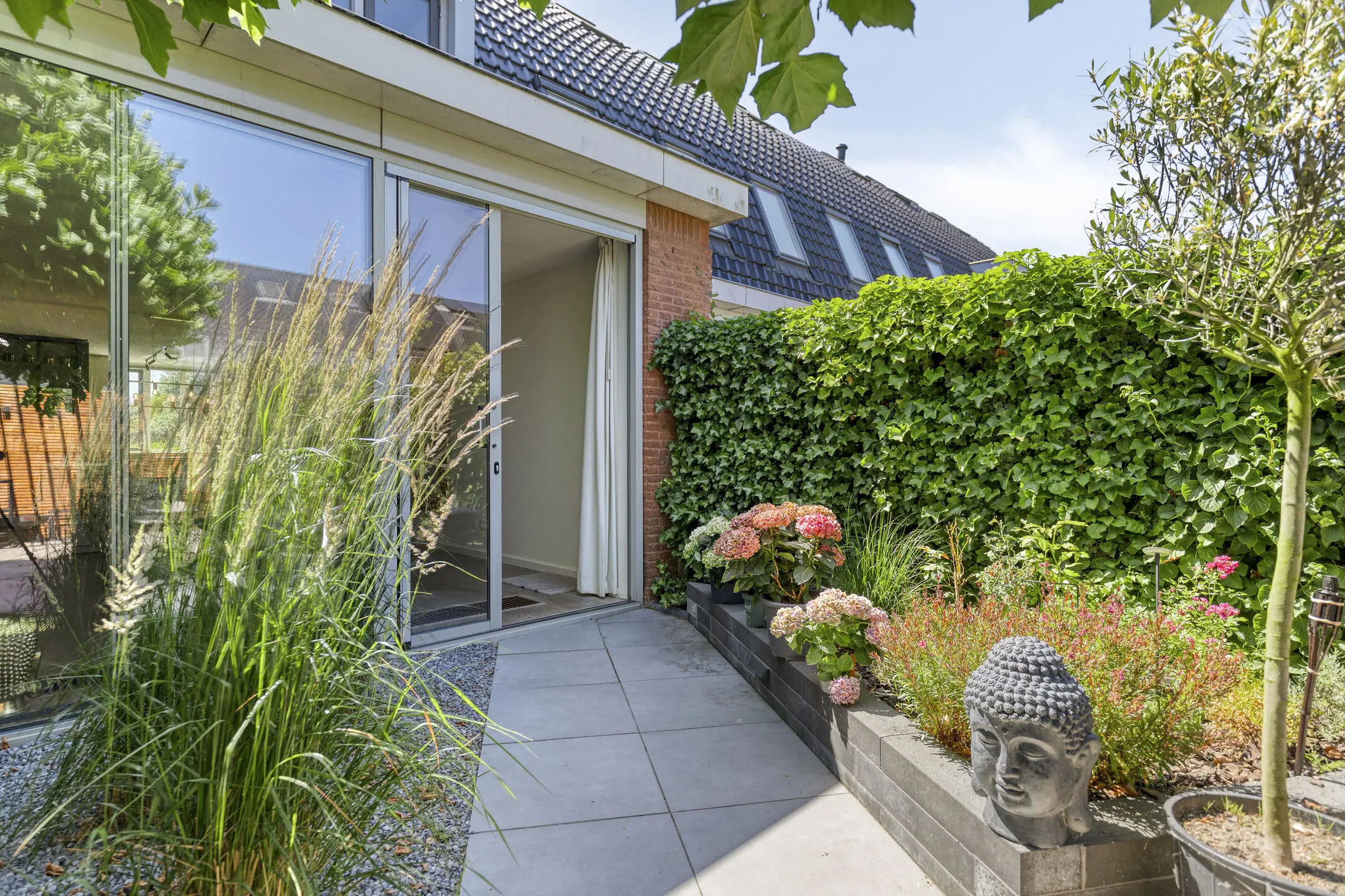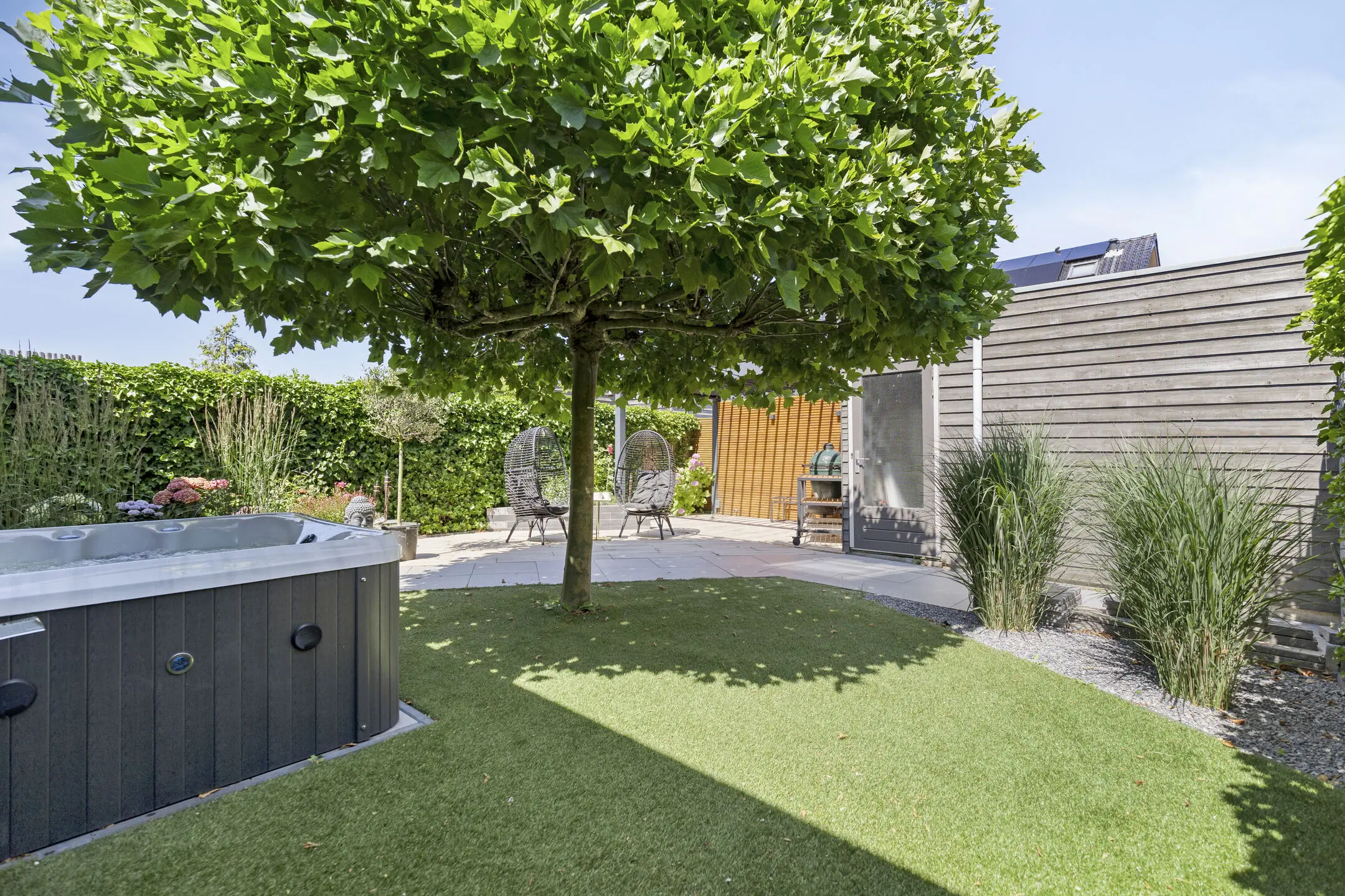 - Architectonisch aangelegde tuin (2020) met berging, achterom, aluminium overkapping, gashaard en strategische