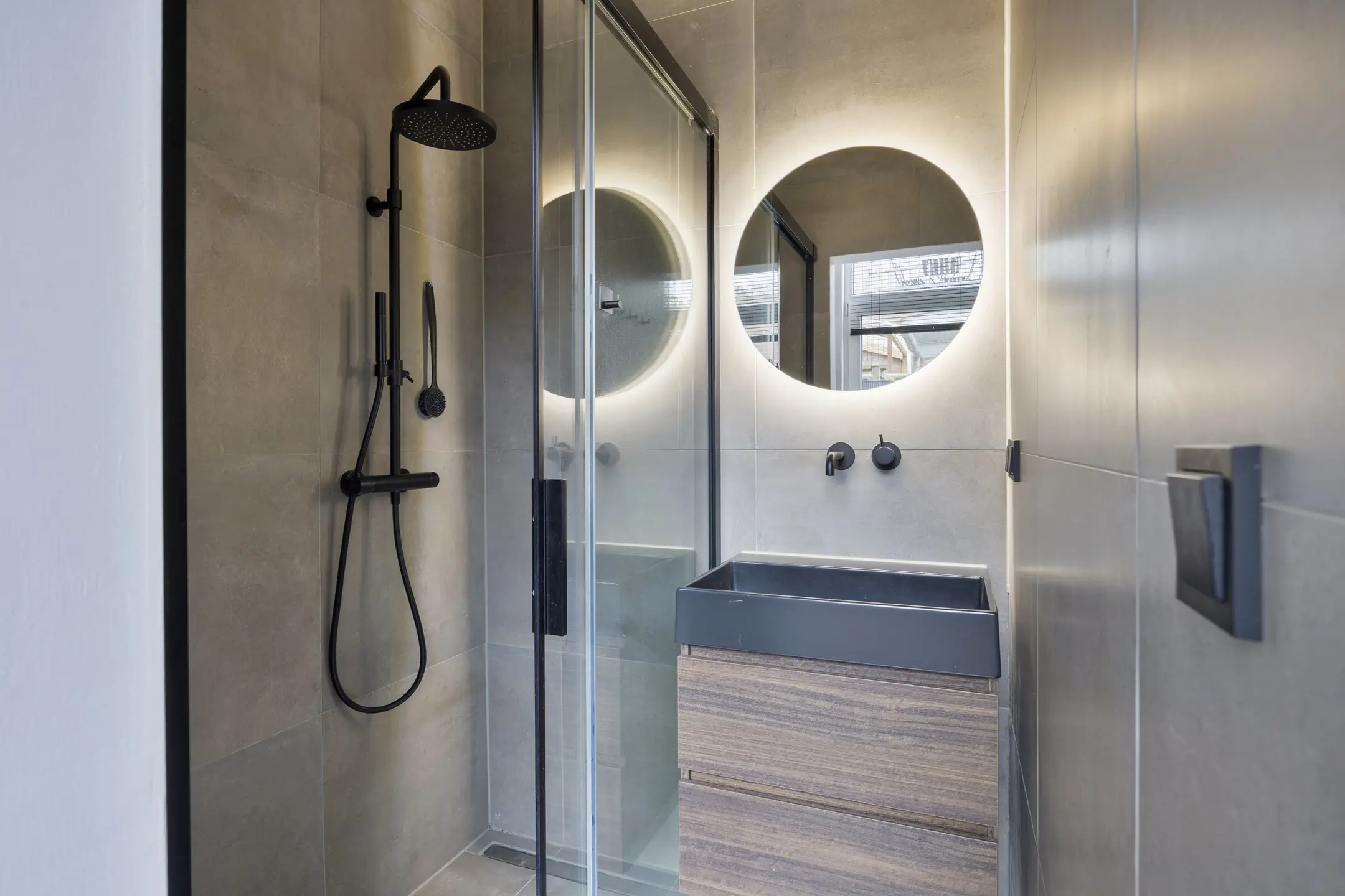 Aansluitend vindt u de uitbouw aan de achterzijde, waar een luxe badkamer is gerealiseerd met:
