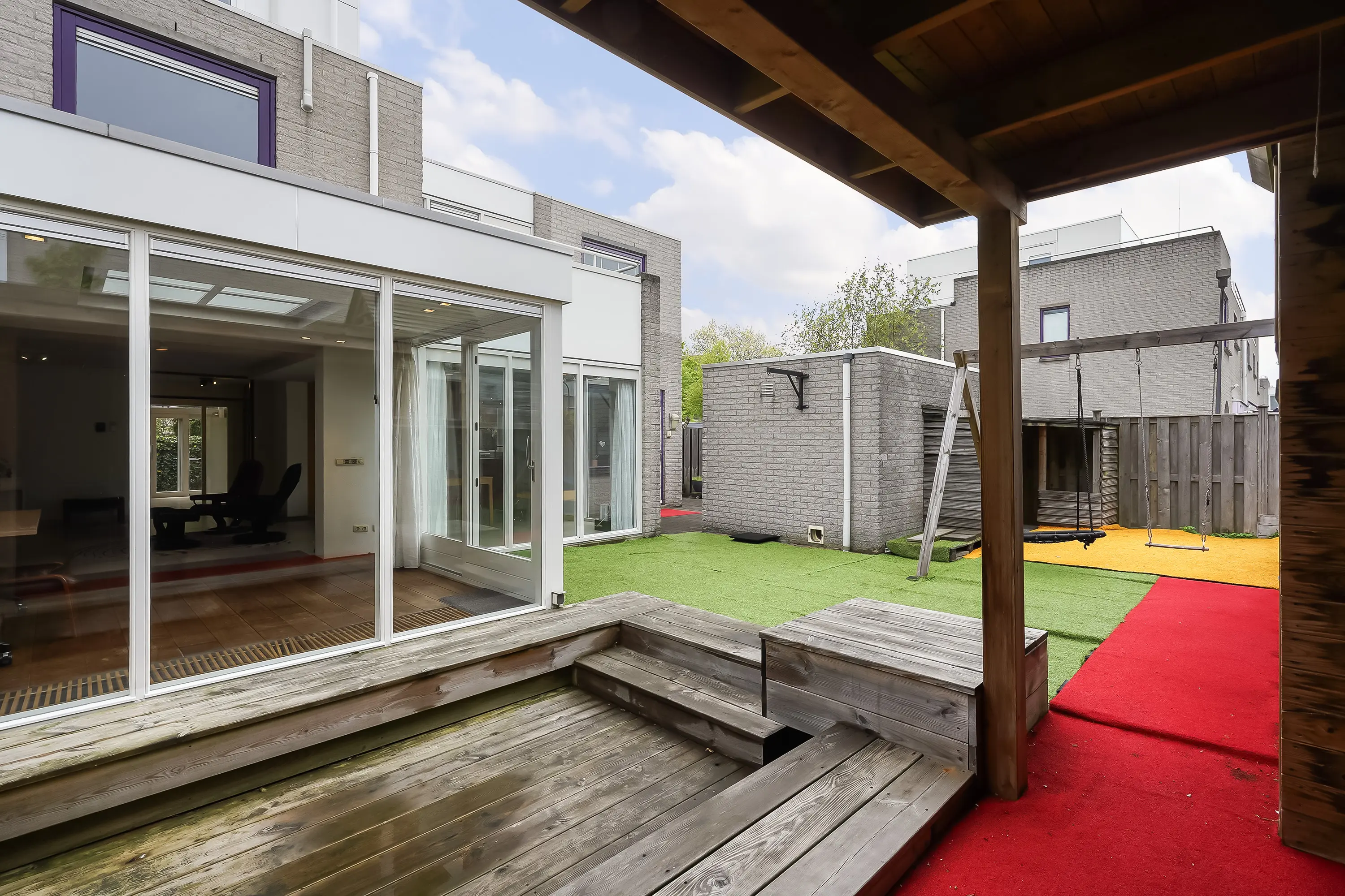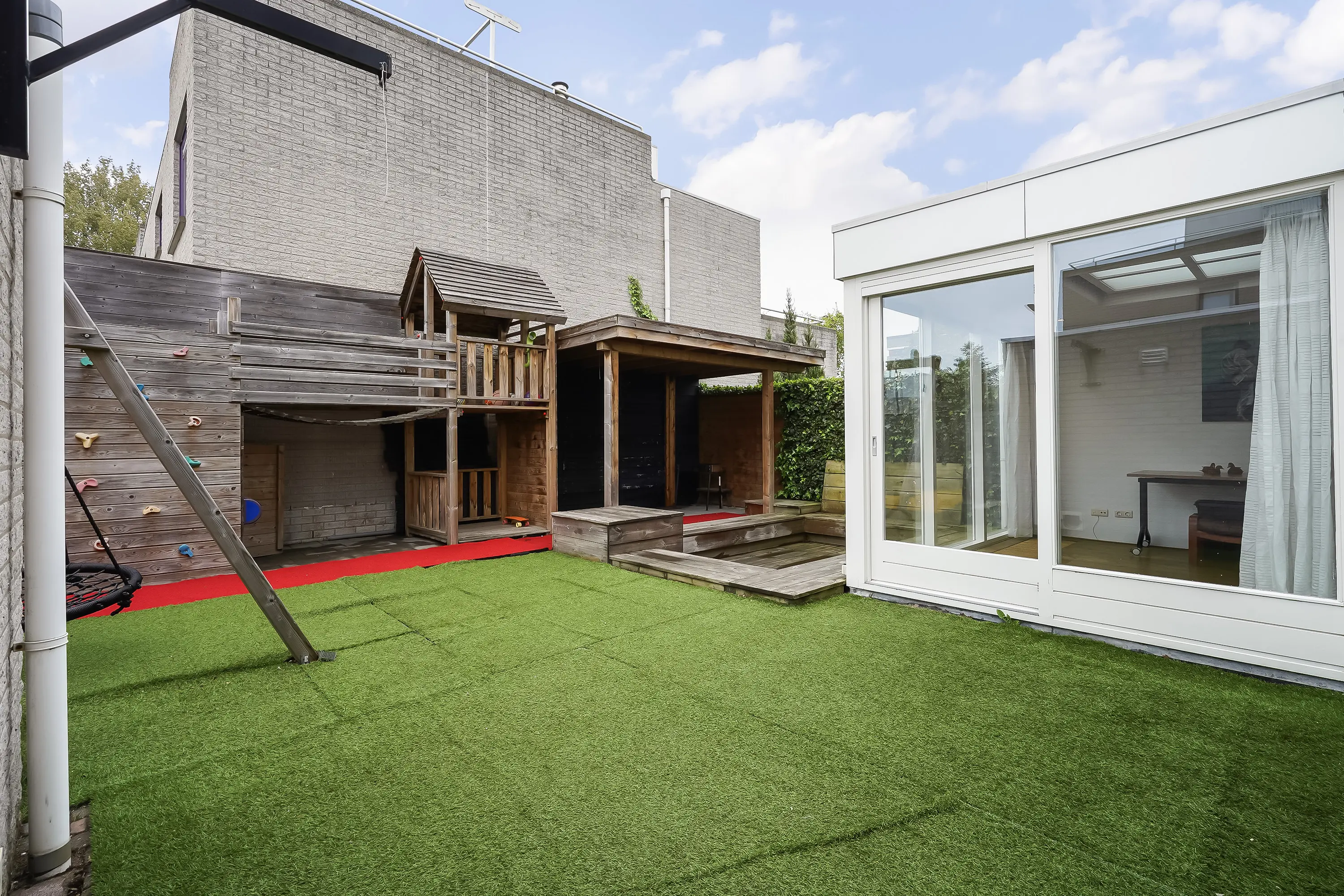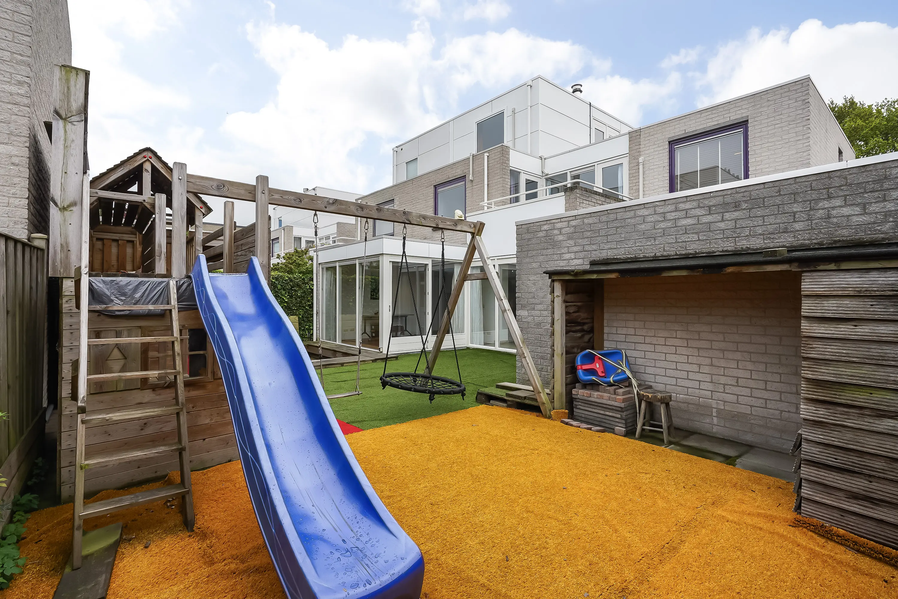 De tuin is rondom de woning gelegen en volledig afgesloten — een veilige speelplek voor kinderen, met volop ruimte op de speeltoestellen. Dankzij de verbinding tussen voor-, zij- en achtertuin is er altijd een plek in de zon of juist in de schaduw te vinden.