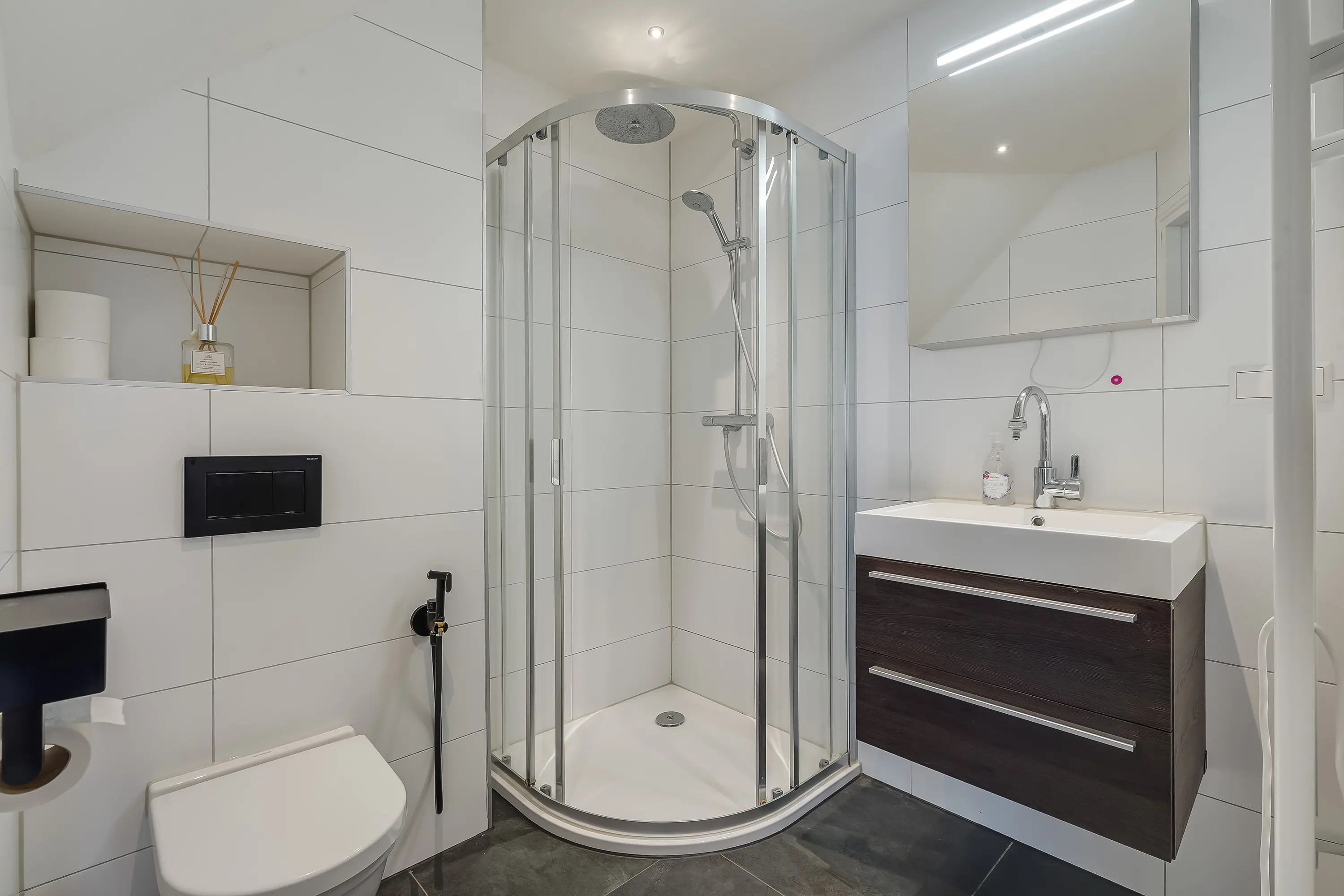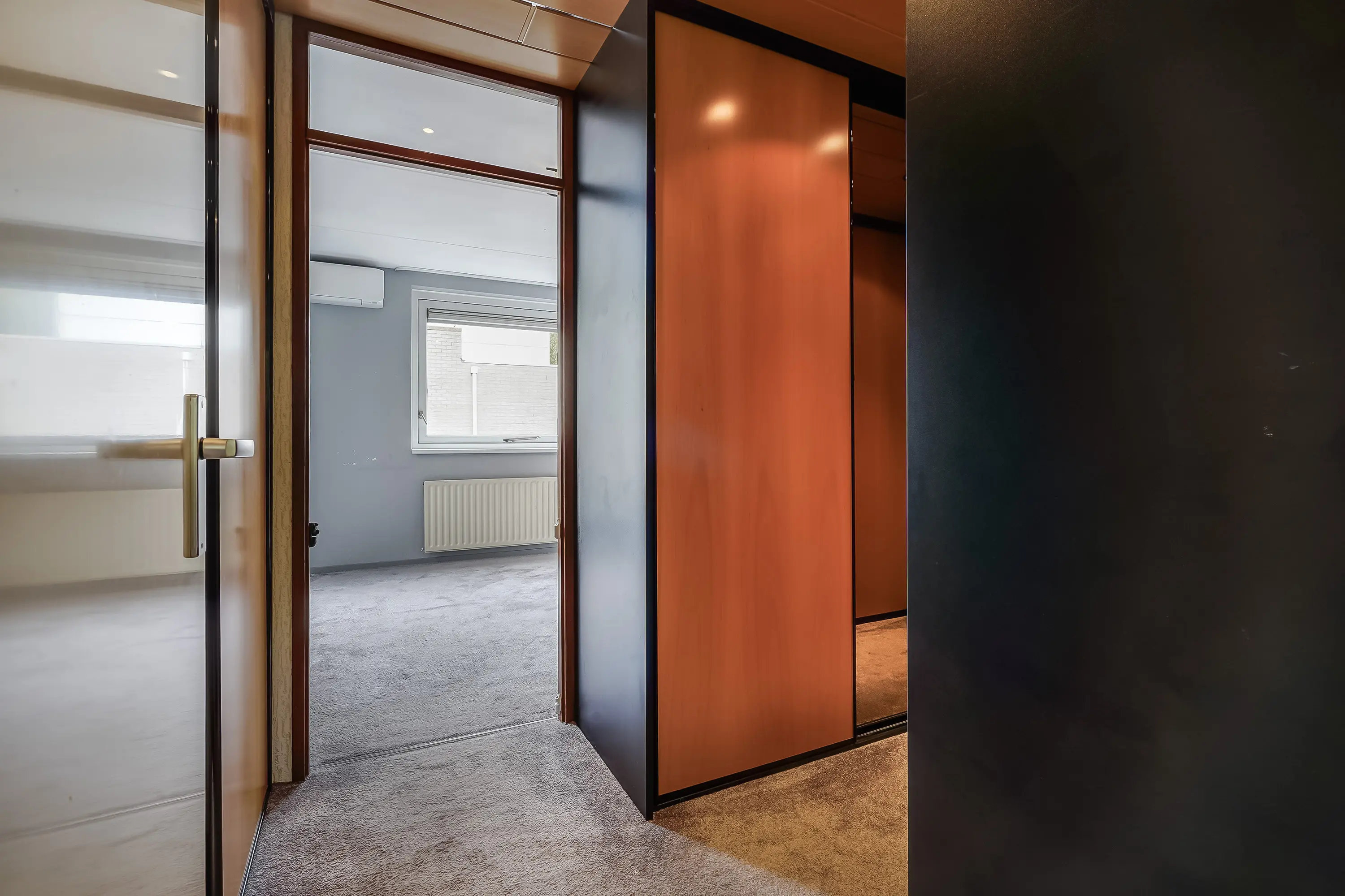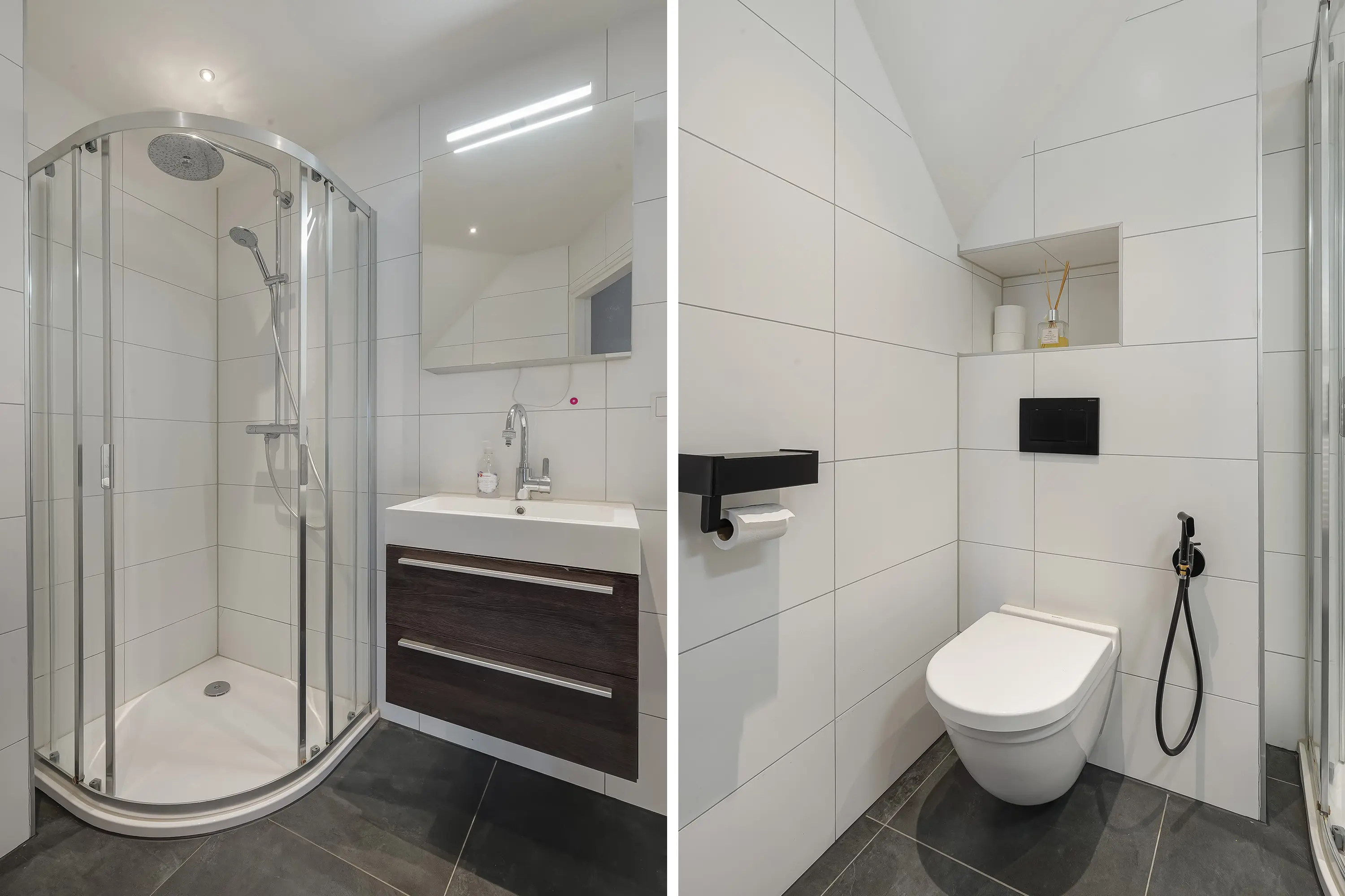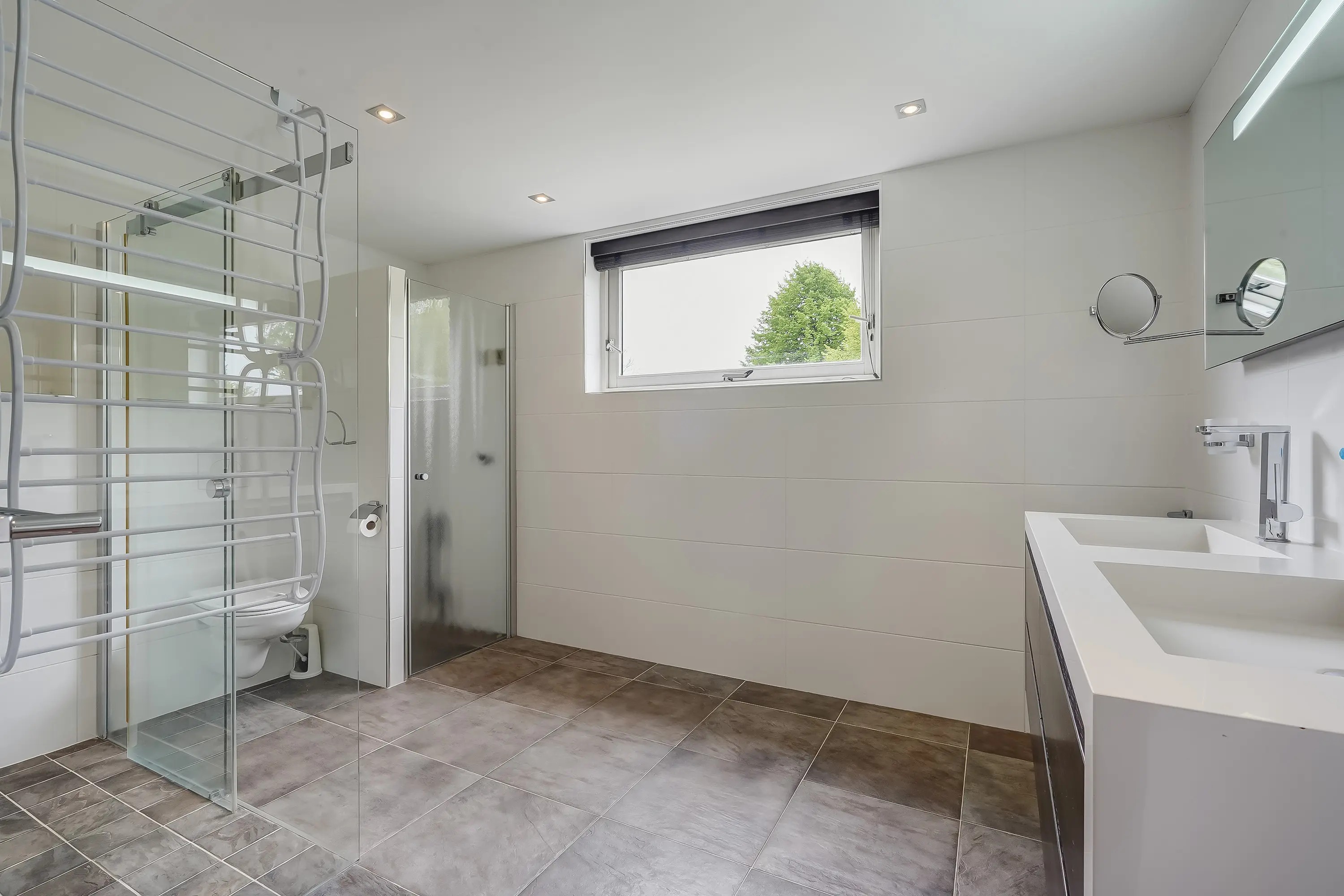 Op de eerste etage vind je vier ruime slaapkamers waarvan er drie zijn voorzien van airco. Eén daarvan heeft een inloopkast, twee slaapkamers hebben toegang tot een dakterras, en één beschikt over een eigen en-suite badkamer met douche, wastafel en toilet. De moderne badkamer op deze verdieping is zeer royaal en beschikt over een ruime inloopdouche, dubbele wastafel, zwevend toilet, daglicht én aansluitingen voor wasapparatuur.
