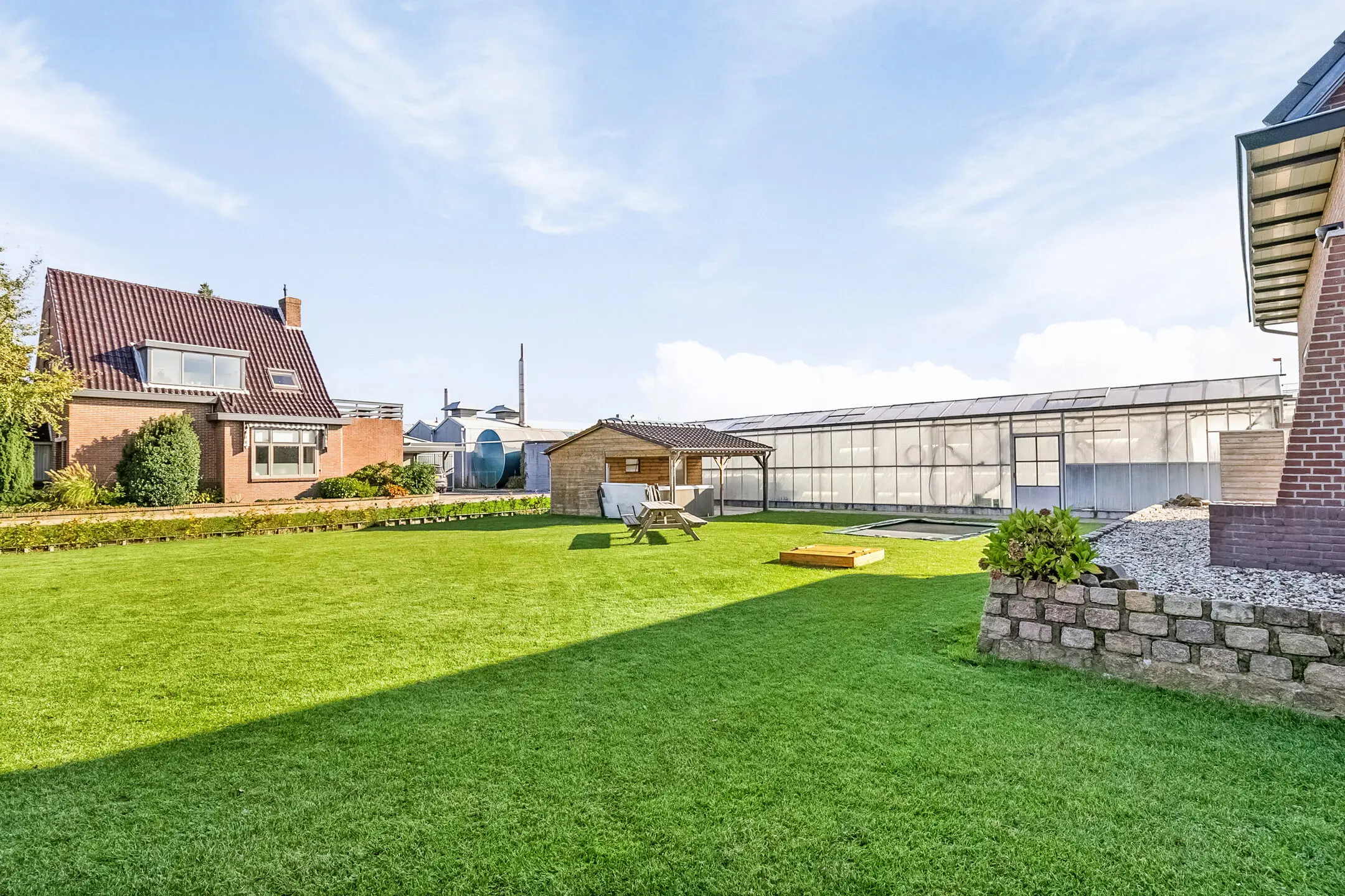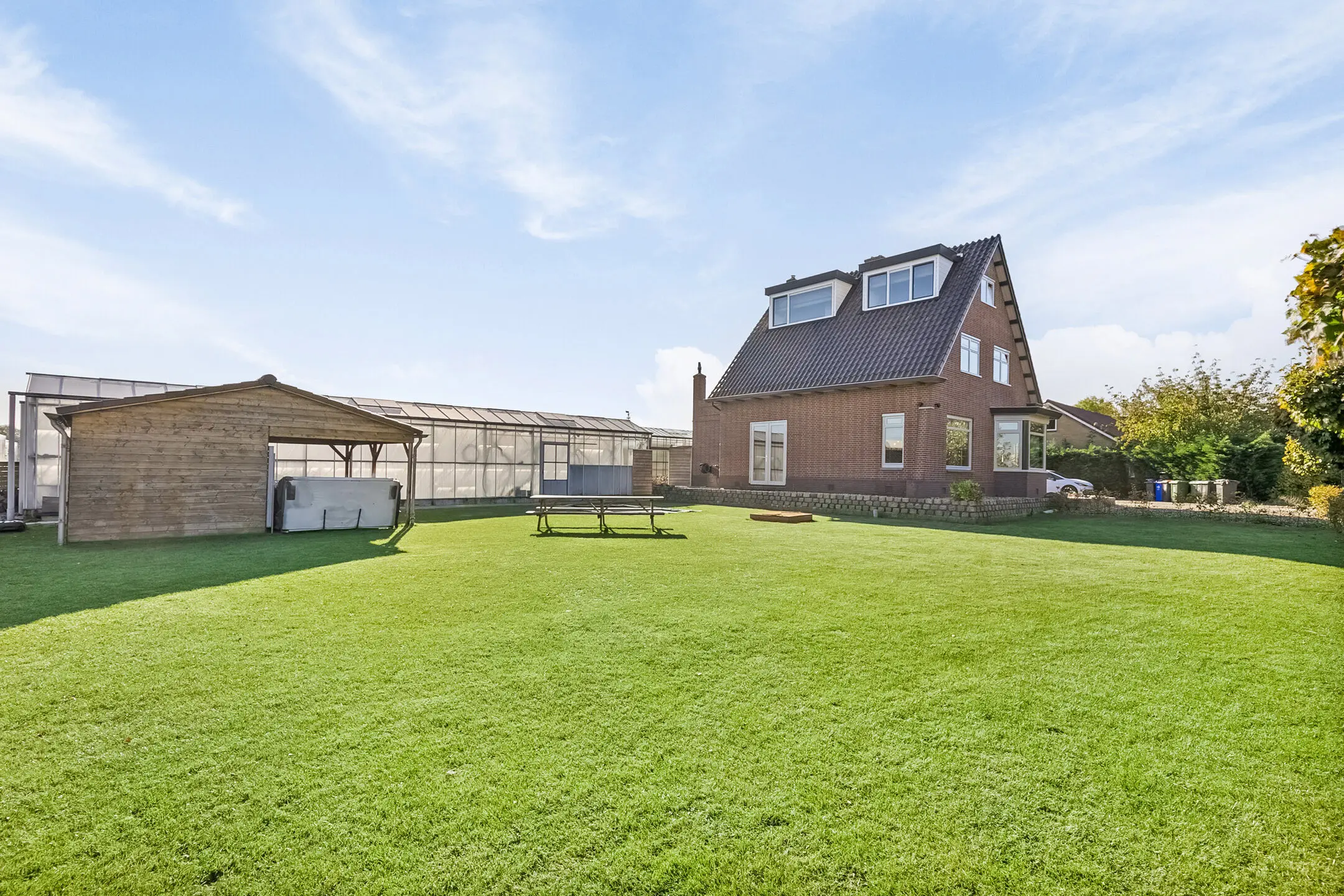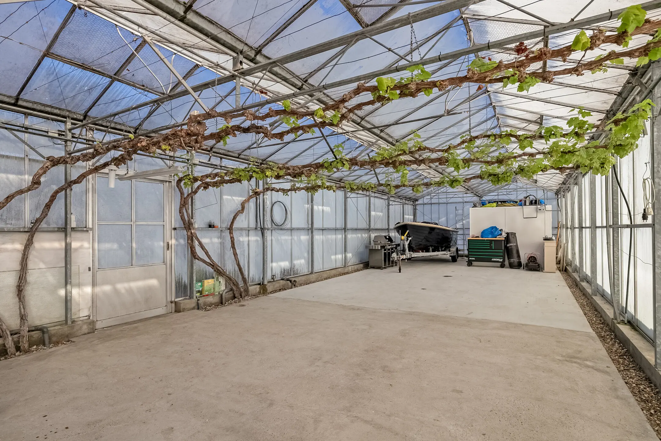 De riante tuin is deels bestraat en biedt veel zon en ruimte voor meerdere zitplekken of parkeergelegenheid. Een echte eyecatcher is de indrukwekkende druivenkas/garage van ca. 132 m², gelegen op agrarische grond – ideaal voor hobbyisten of extra opslag.