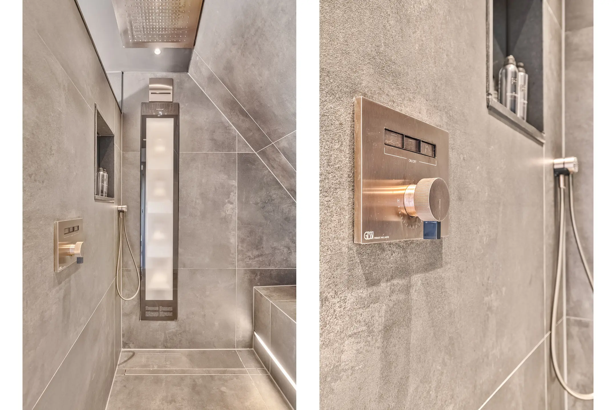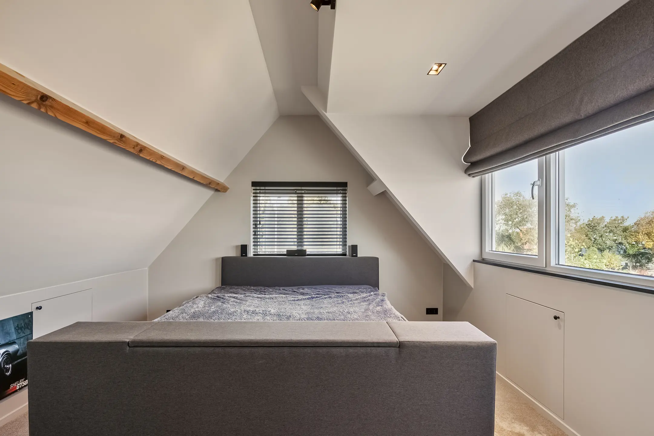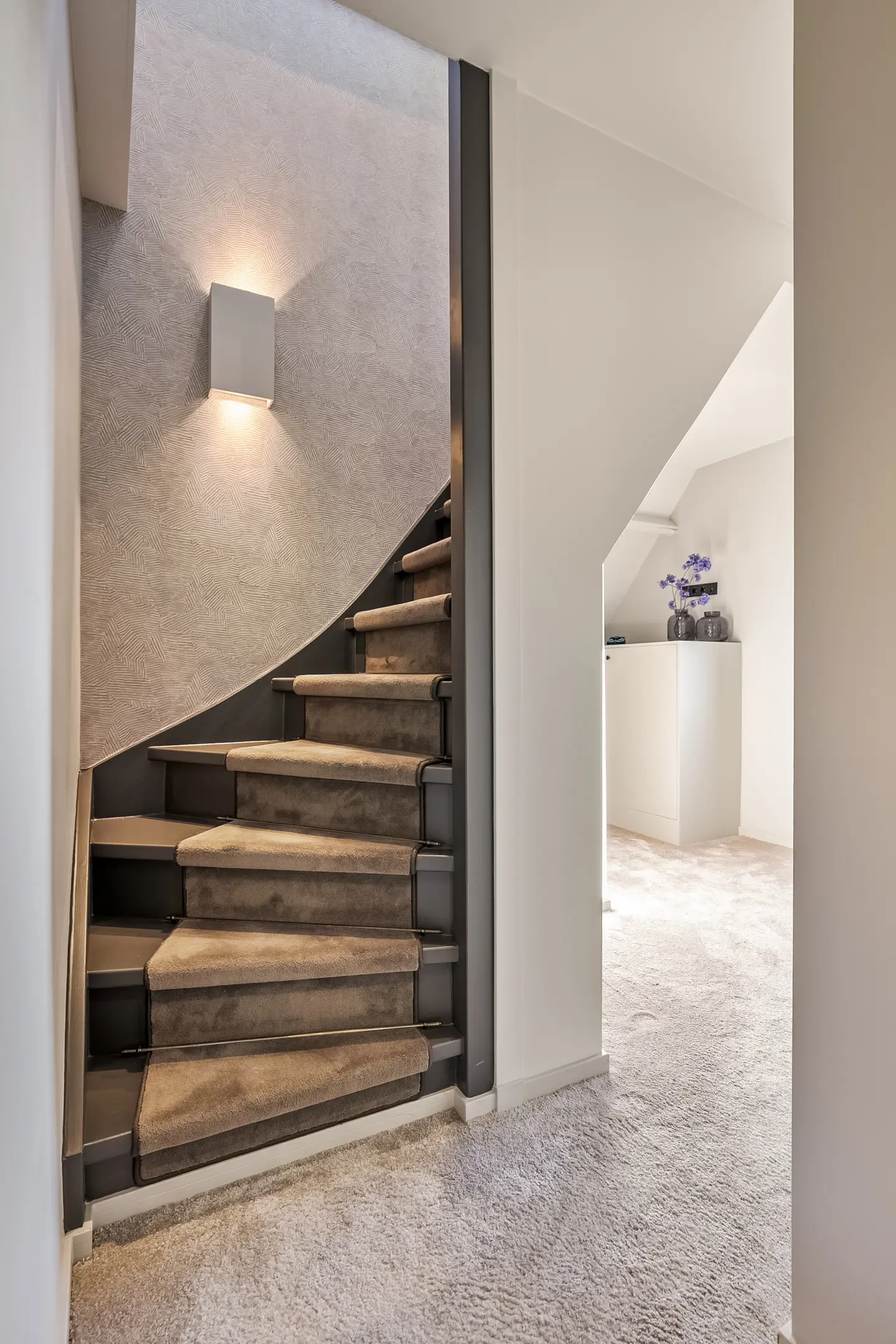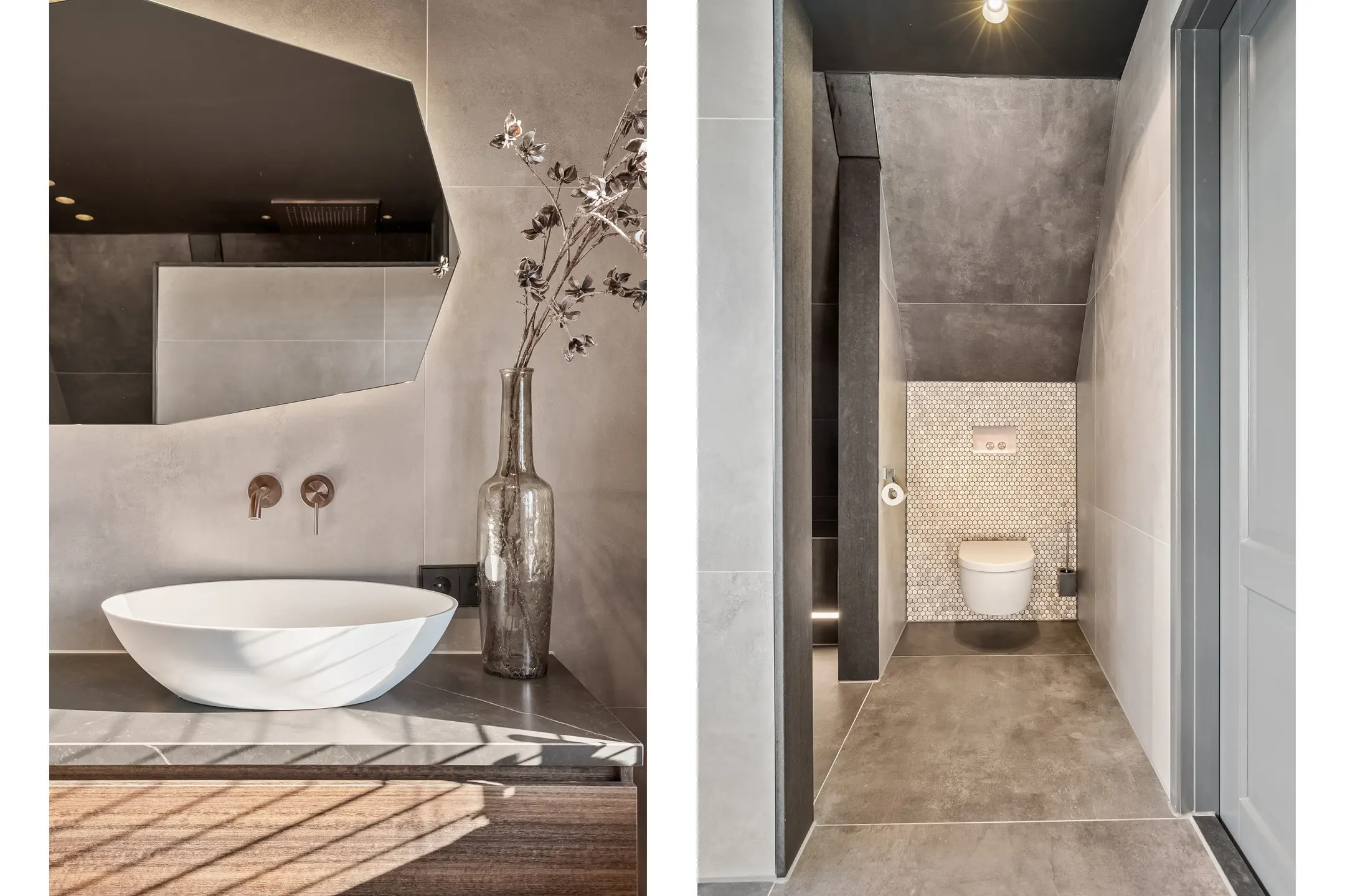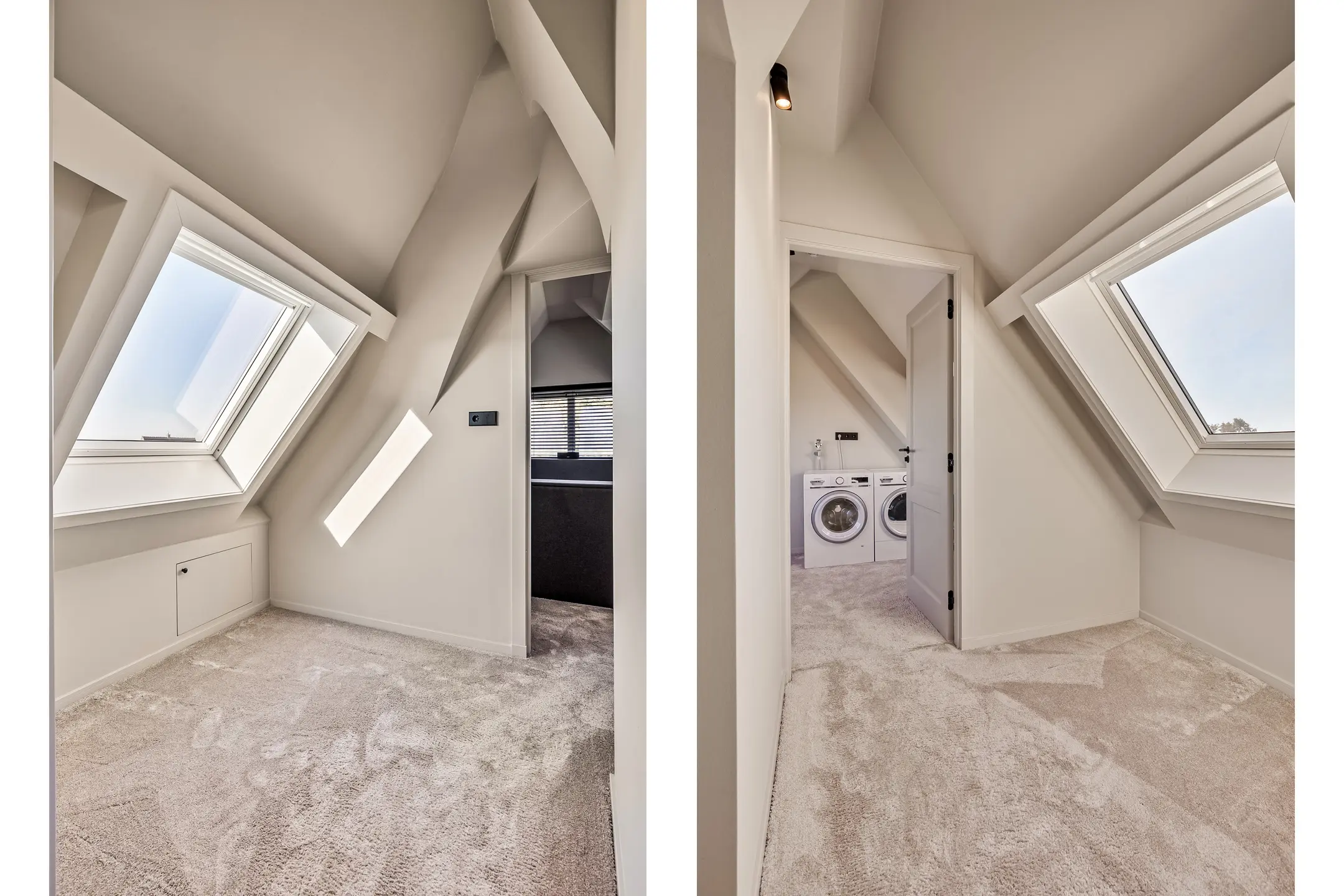 Op de 1e verdieping vindt u drie stijlvol afgewerkte slaapkamers en een moderne badkamer met luxe afwerking, waaronder een regendouche en Gessi kranen. Het ruime dakterras van ca. 16 m² ligt op het zuidoosten en biedt prachtig uitzicht – ideaal voor een borrel in de zon.