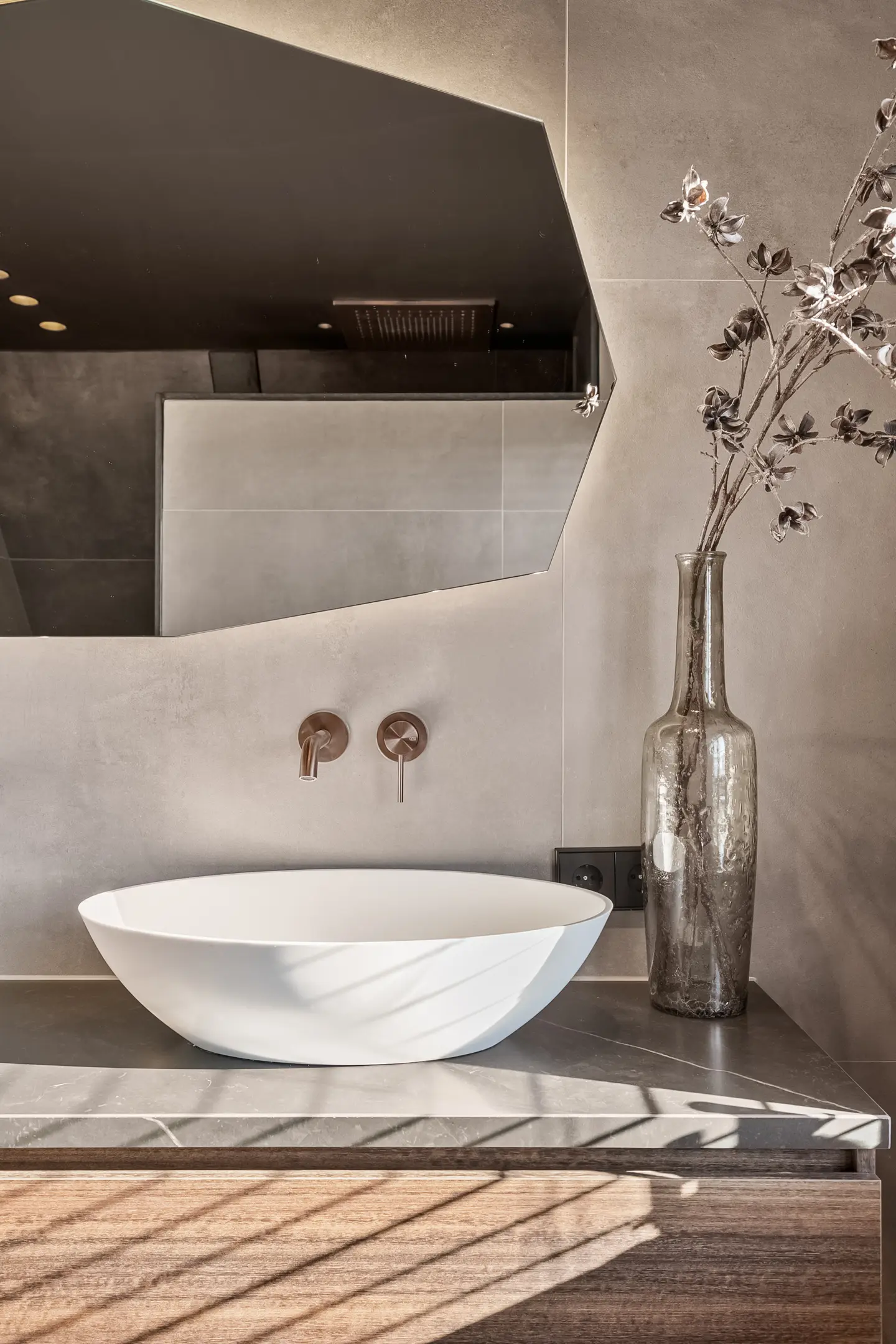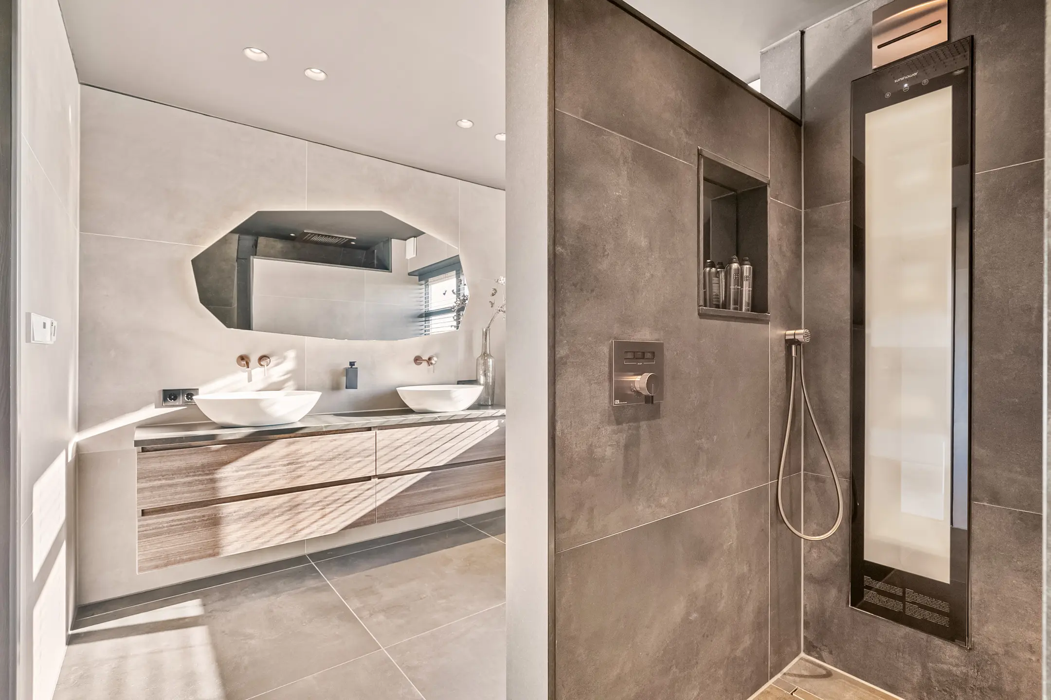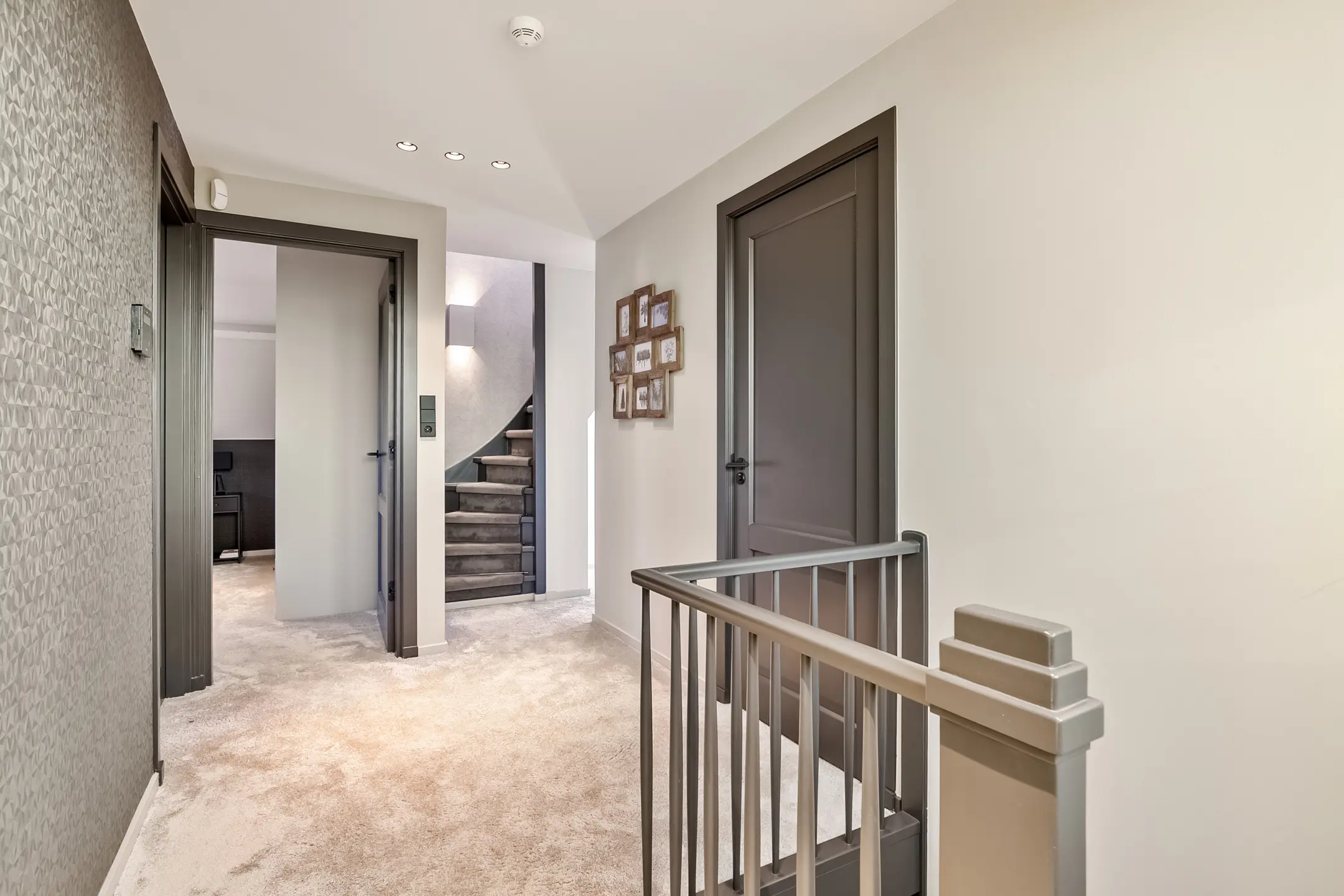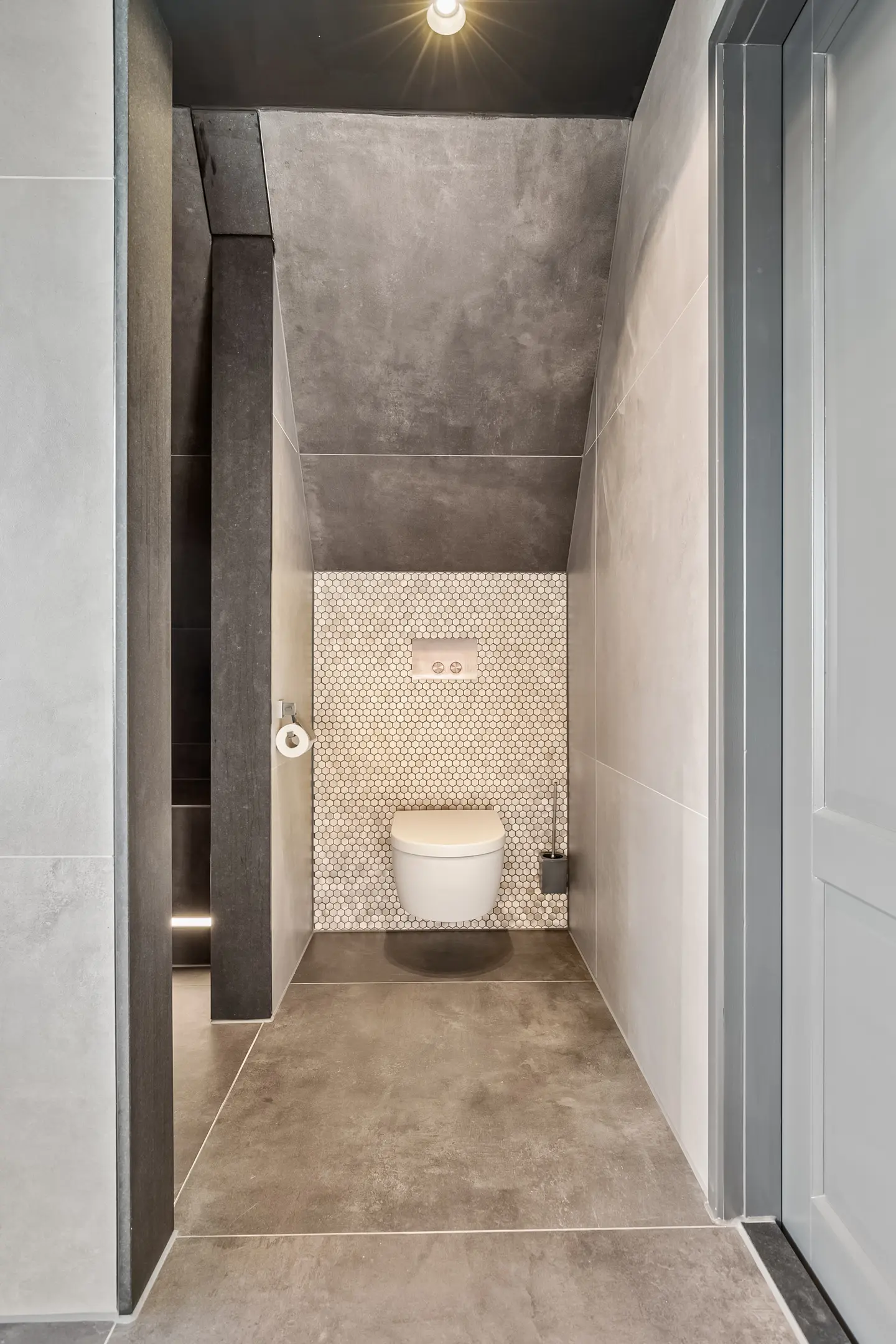 Op de 1e verdieping vindt u drie stijlvol afgewerkte slaapkamers en een moderne badkamer met luxe afwerking, waaronder een regendouche en Gessi kranen. Het ruime dakterras van ca. 16 m² ligt op het zuidoosten en biedt prachtig uitzicht – ideaal voor een borrel in de zon.