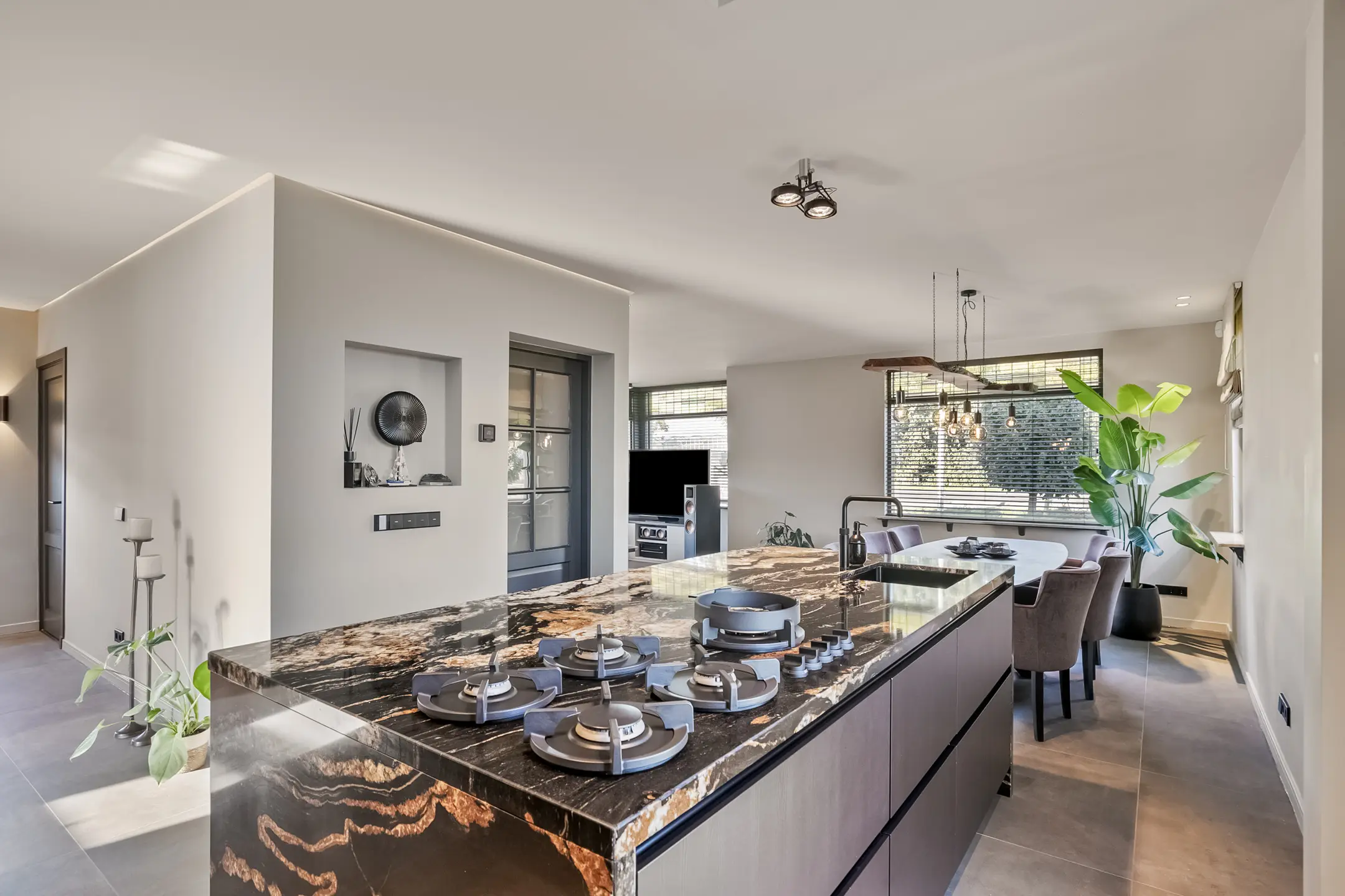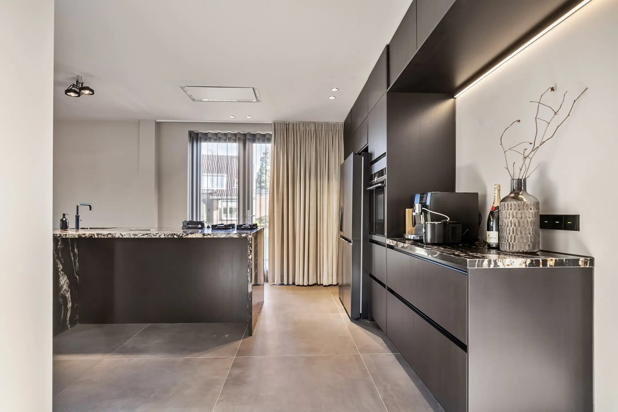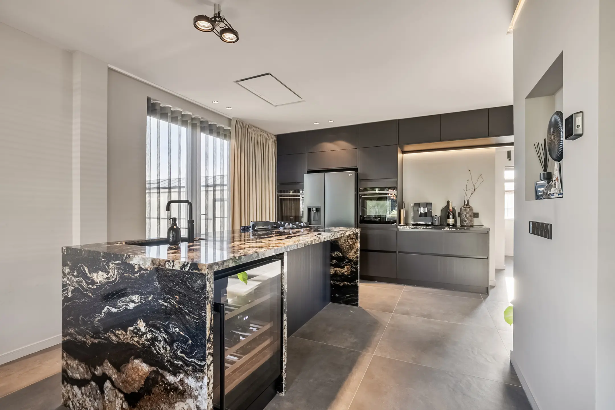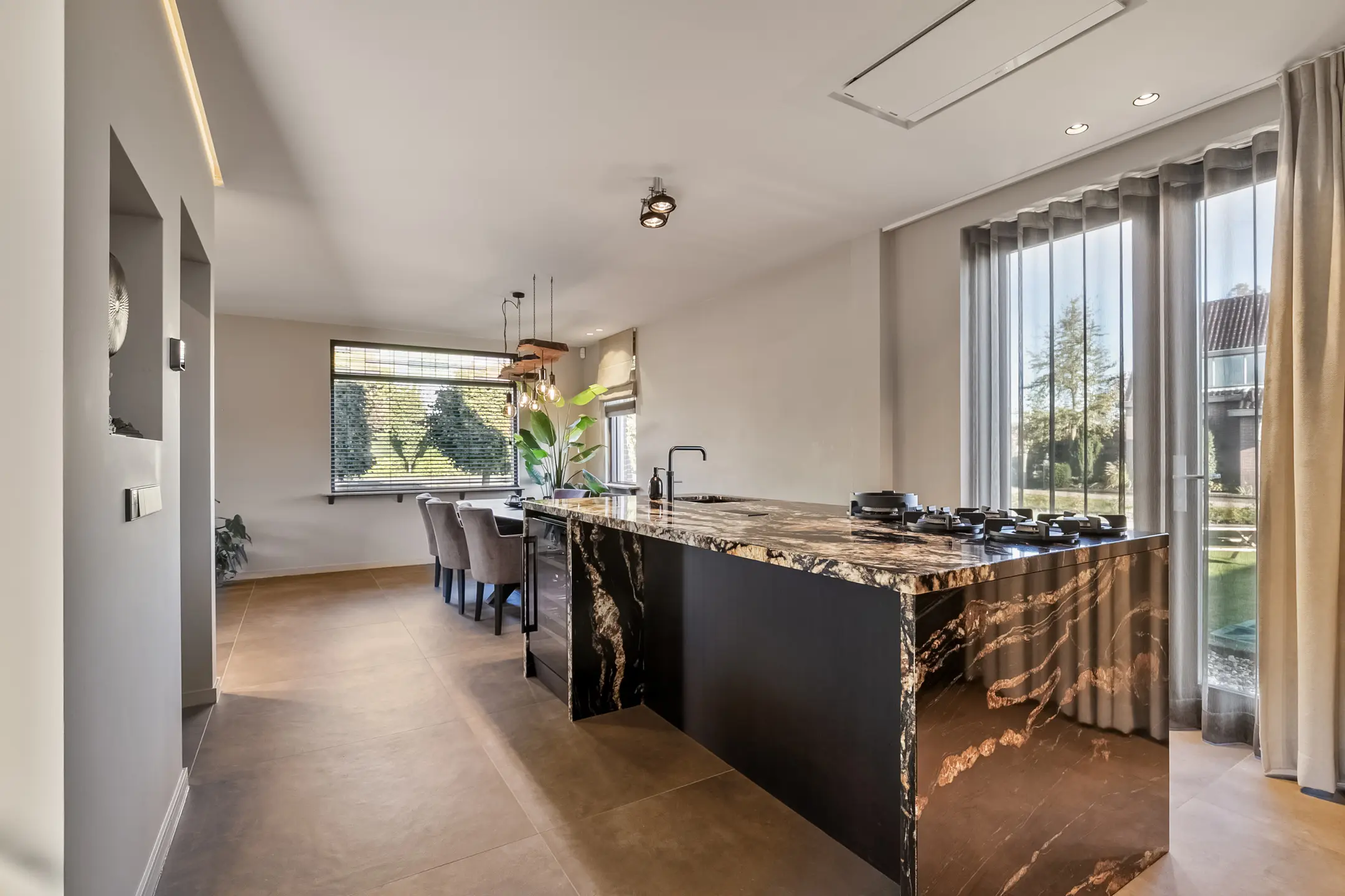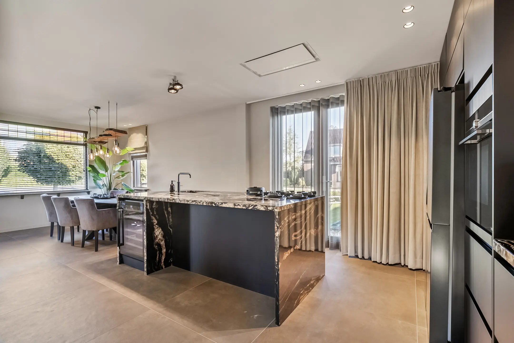 De luxe keuken is een waar paradijs voor de kookliefhebber. Voorzien van een royaal kookeiland met natuurstenen blad, hoogwaardige inbouwapparatuur én een wijnklimaatkast, ontbreekt het hier aan niets. Via de bijkeuken bereikt u de gezellige serre, een heerlijke plek om te ontspannen met uitzicht op de fraai aangelegde achtertuin.
