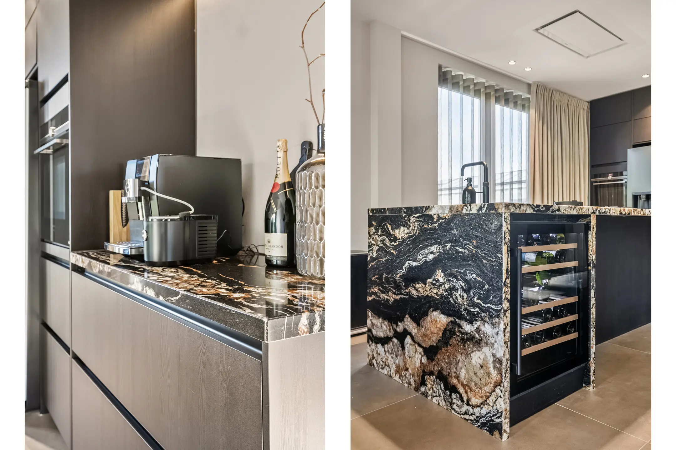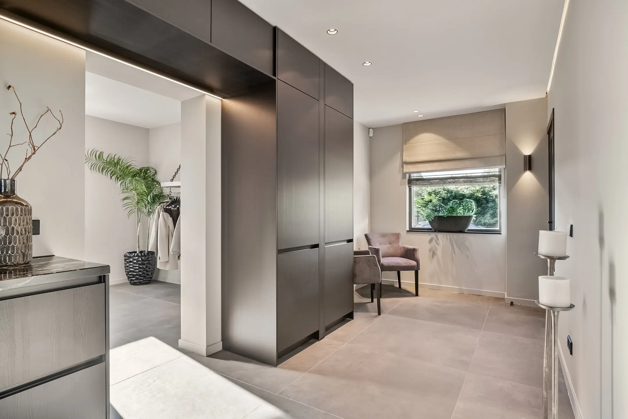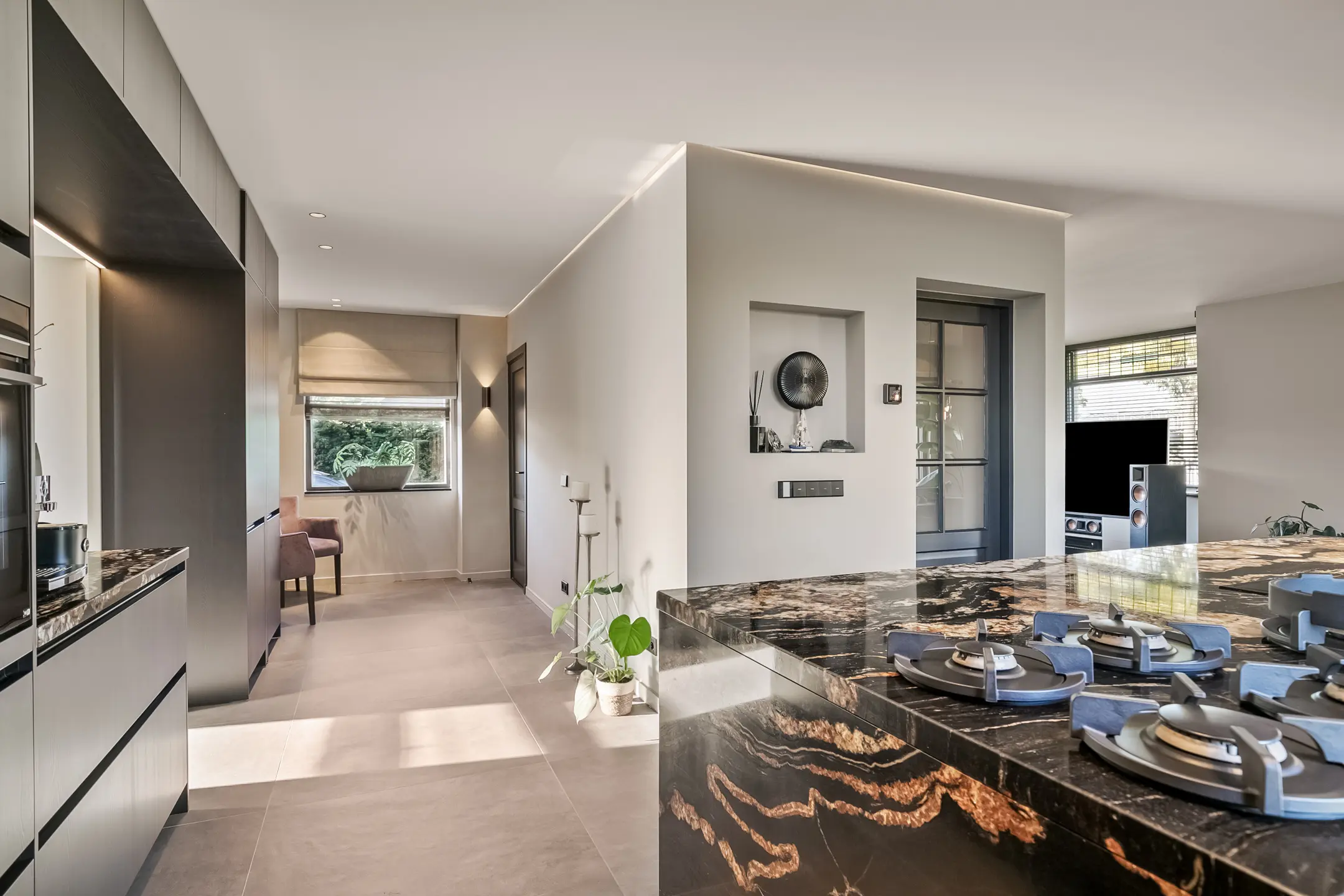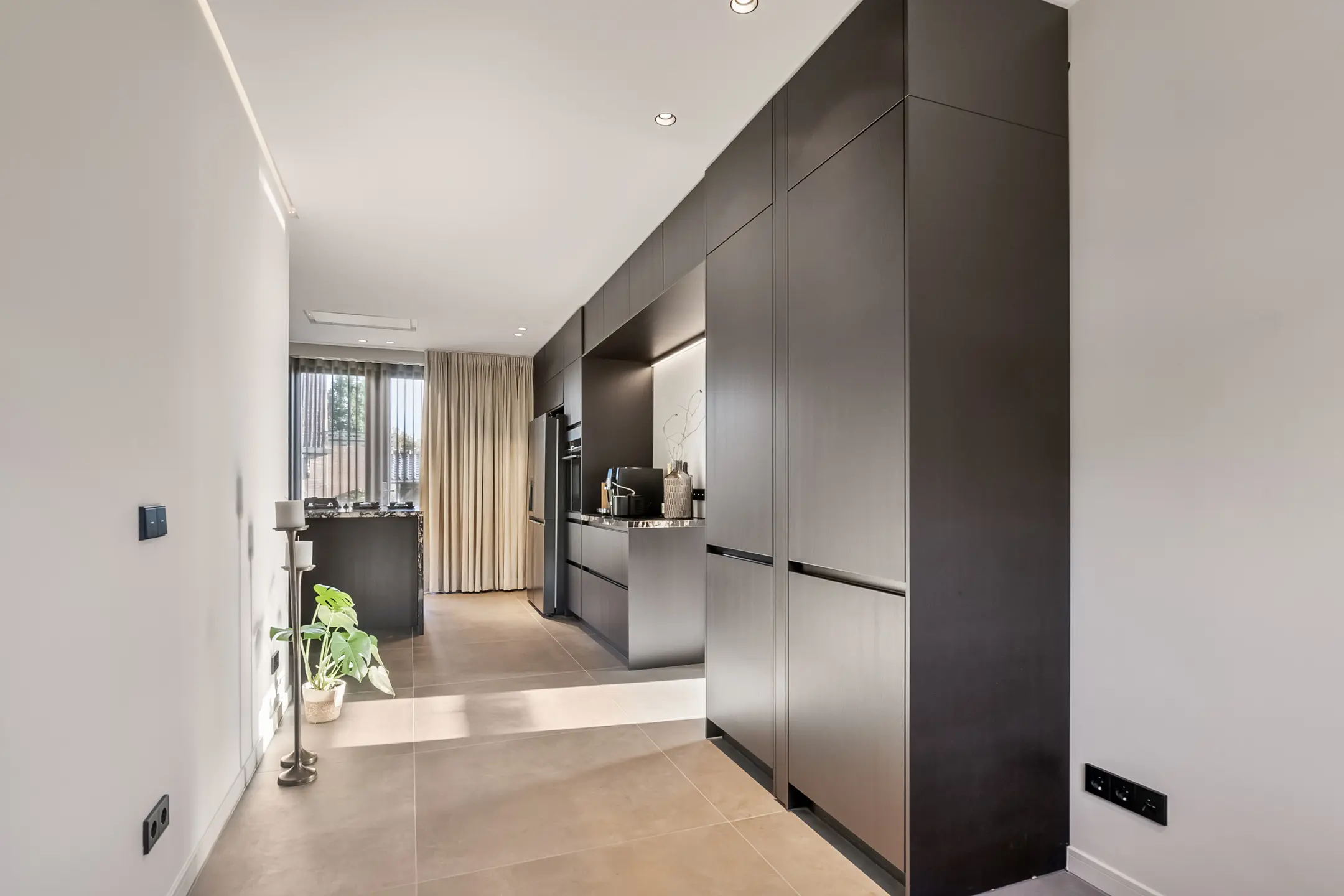 De luxe keuken is een waar paradijs voor de kookliefhebber. Voorzien van een royaal kookeiland met natuurstenen blad, hoogwaardige inbouwapparatuur én een wijnklimaatkast, ontbreekt het hier aan niets. Via de bijkeuken bereikt u de gezellige serre, een heerlijke plek om te ontspannen met uitzicht op de fraai aangelegde achtertuin.