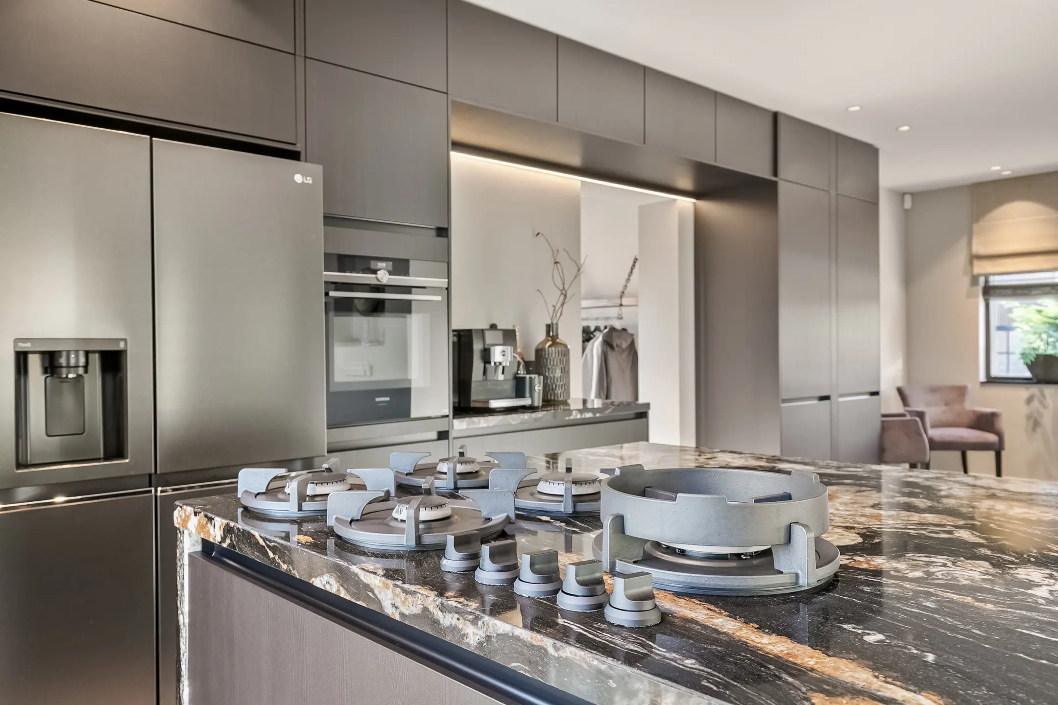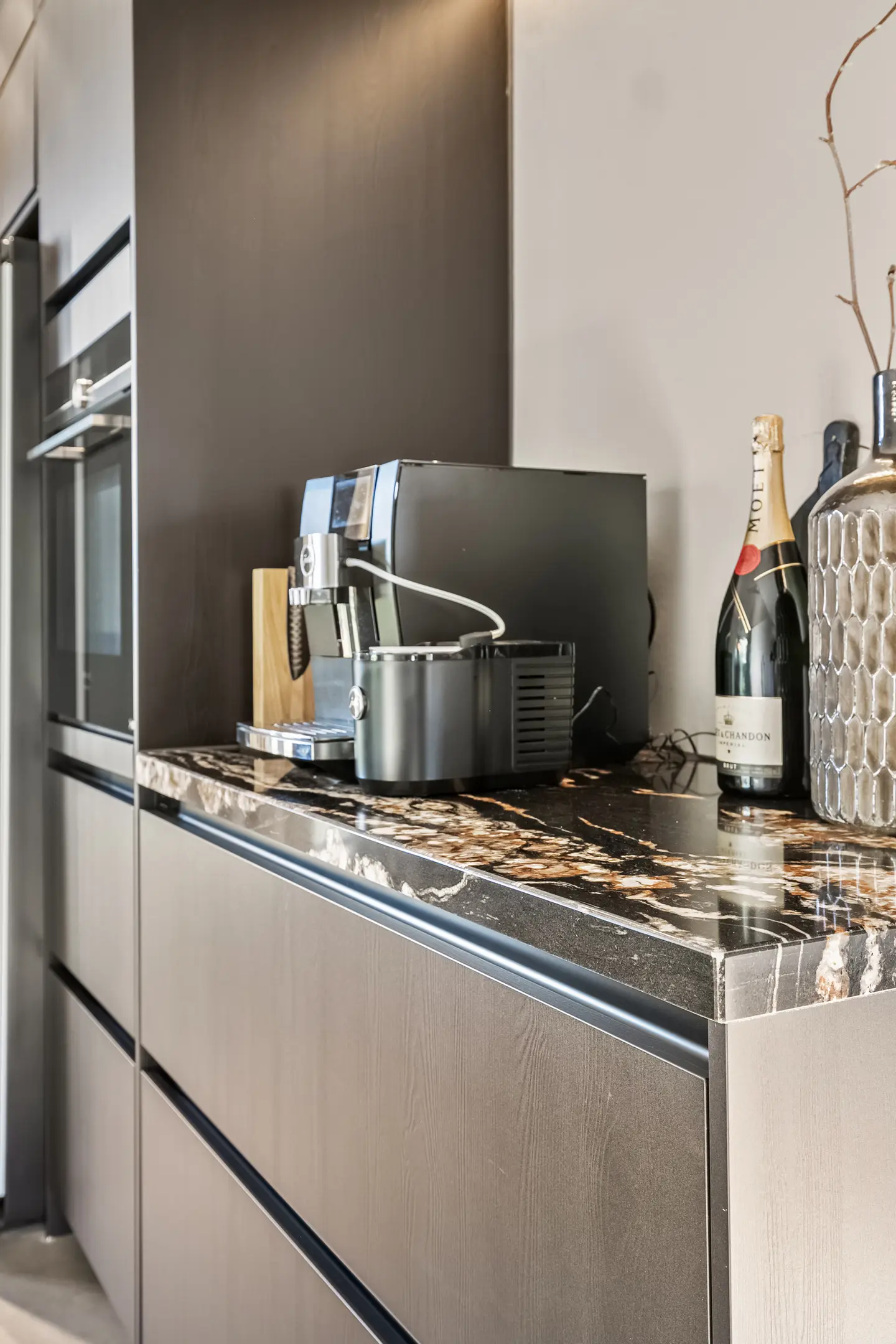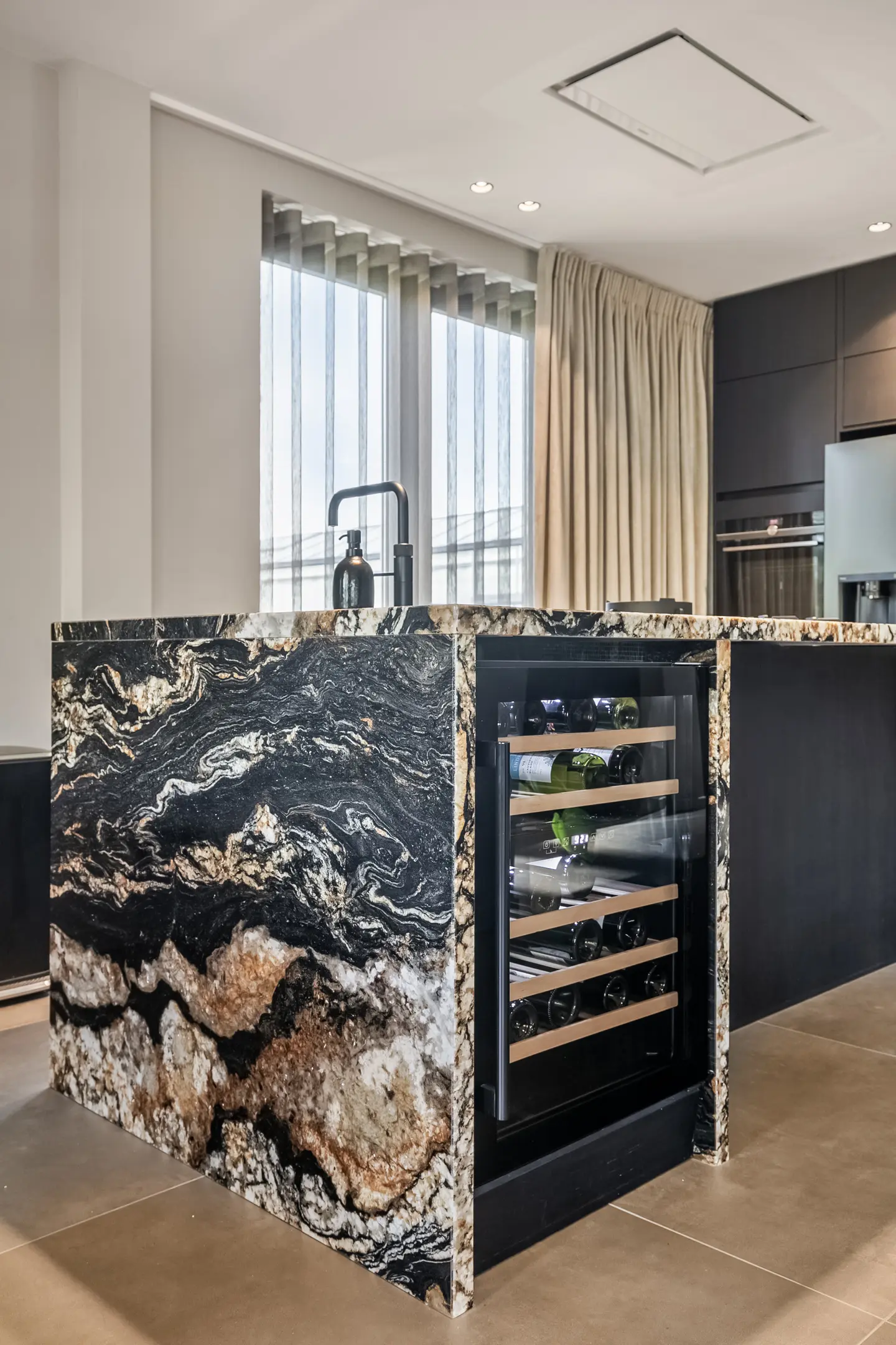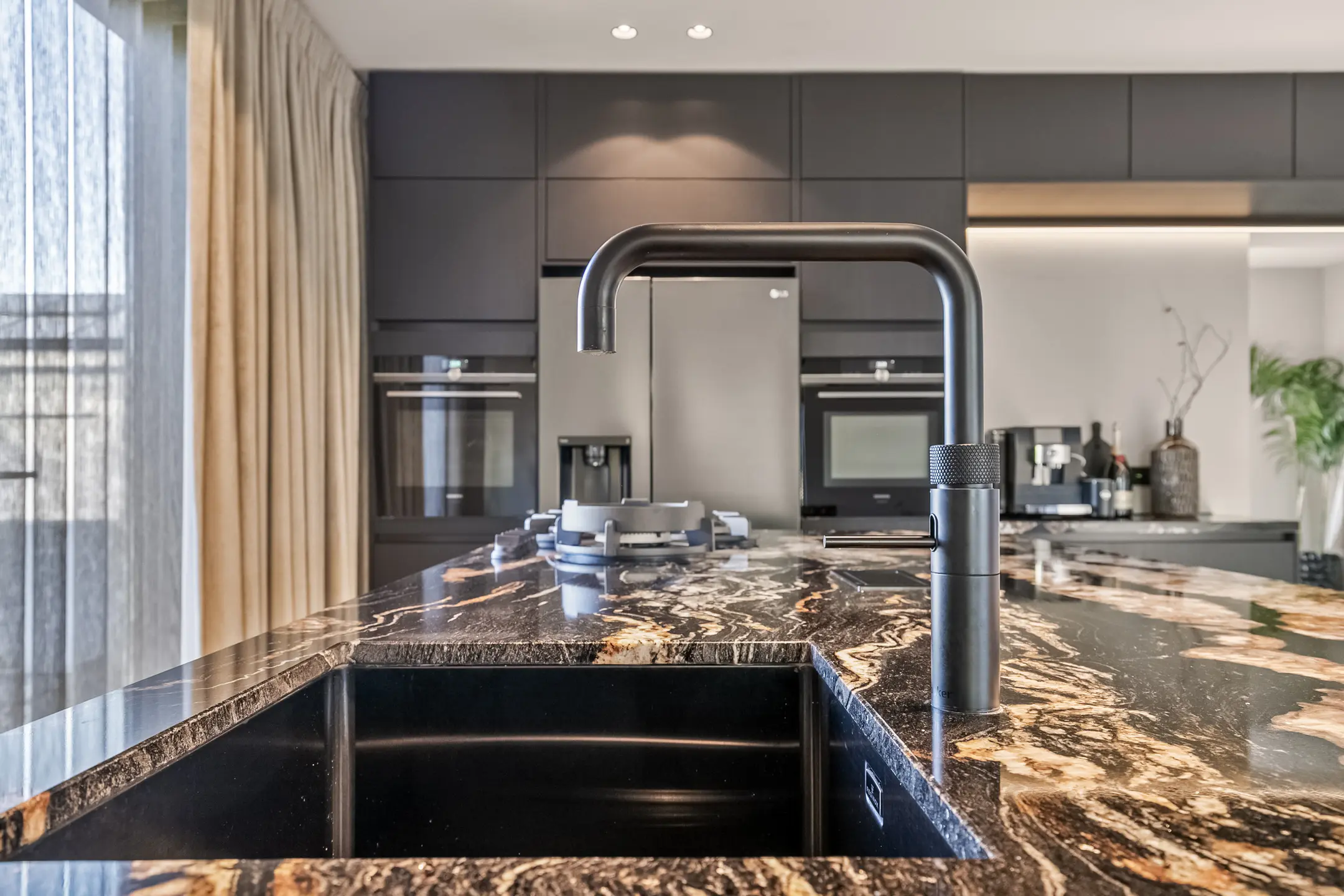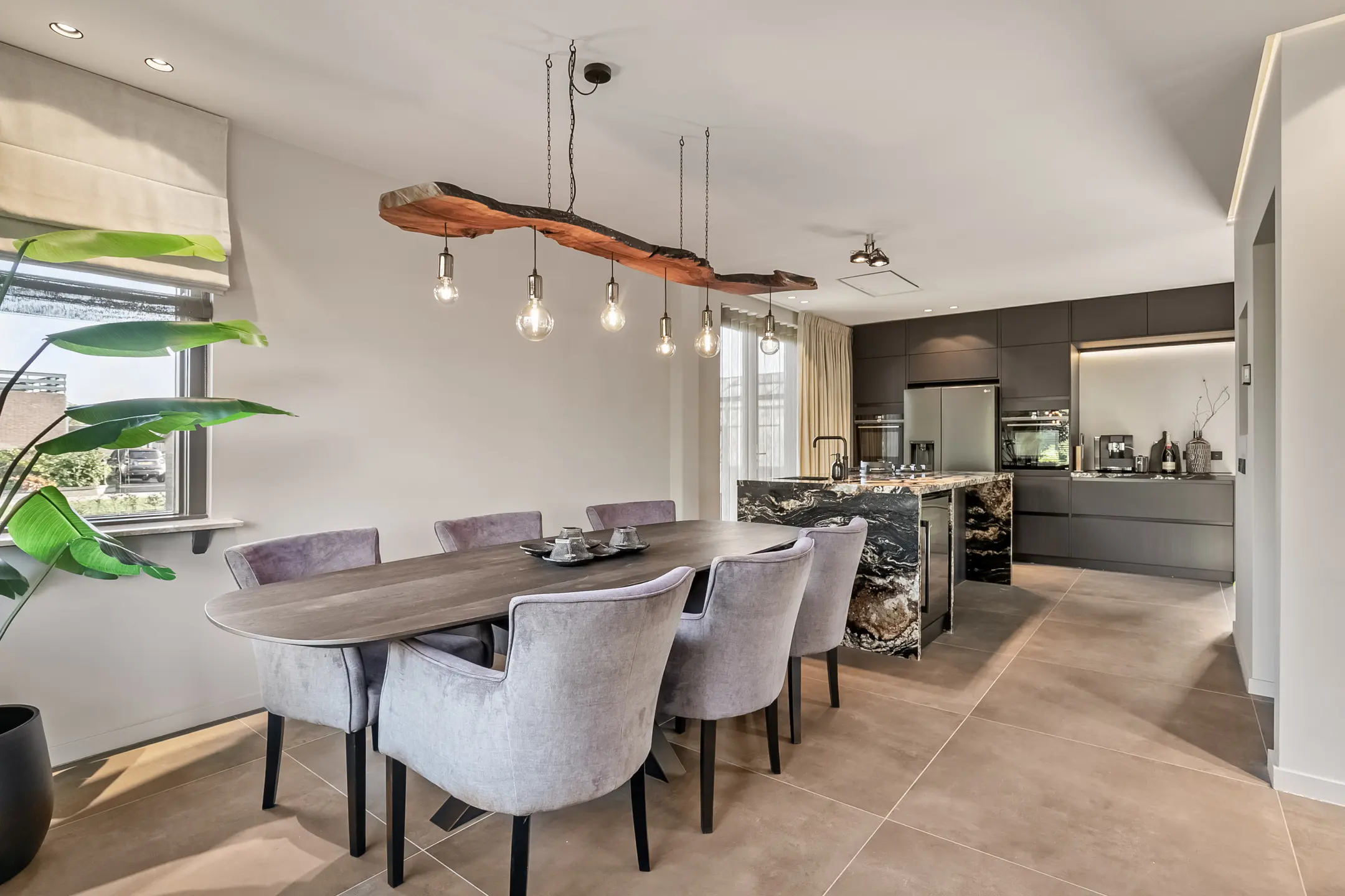 De luxe keuken is een waar paradijs voor de kookliefhebber. Voorzien van een royaal kookeiland met natuurstenen blad, hoogwaardige inbouwapparatuur én een wijnklimaatkast, ontbreekt het hier aan niets. Via de bijkeuken bereikt u de gezellige serre, een heerlijke plek om te ontspannen met uitzicht op de fraai aangelegde achtertuin.