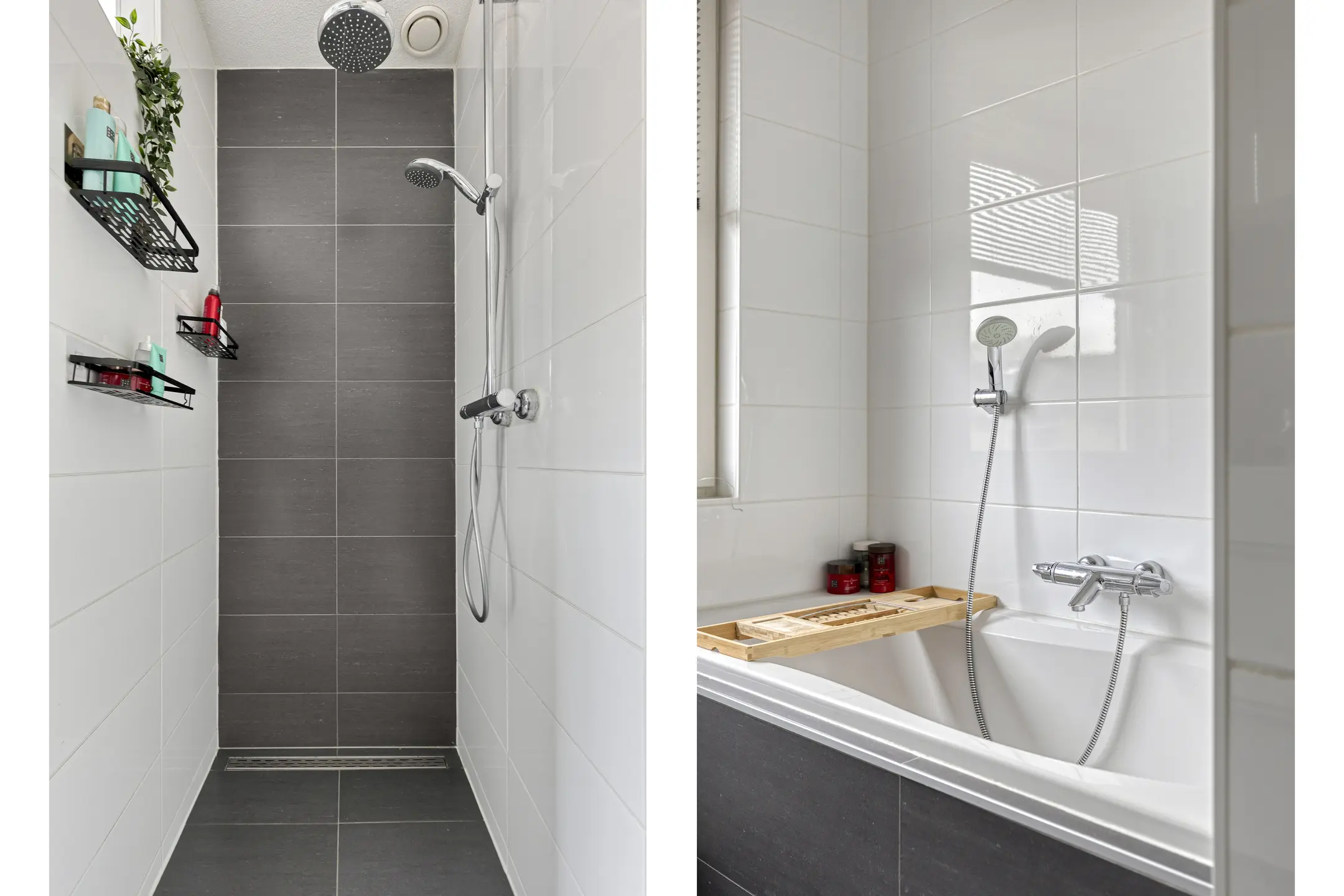 - De modern betegelde badkamer is voorzien van een ligbad, douche, toilet en wastafel.