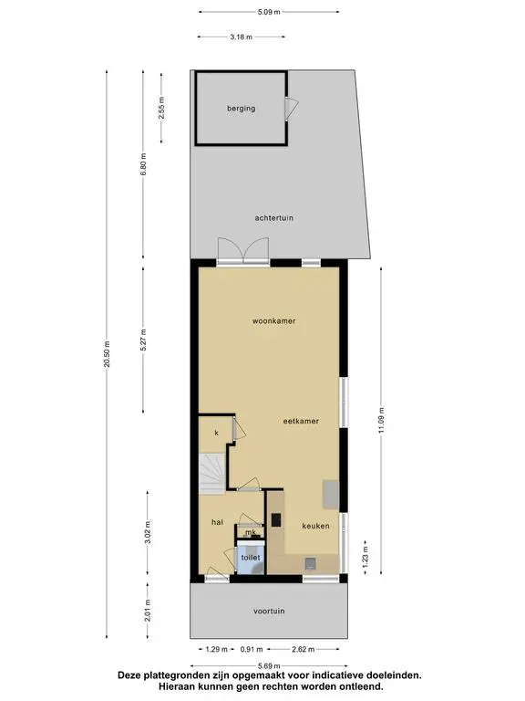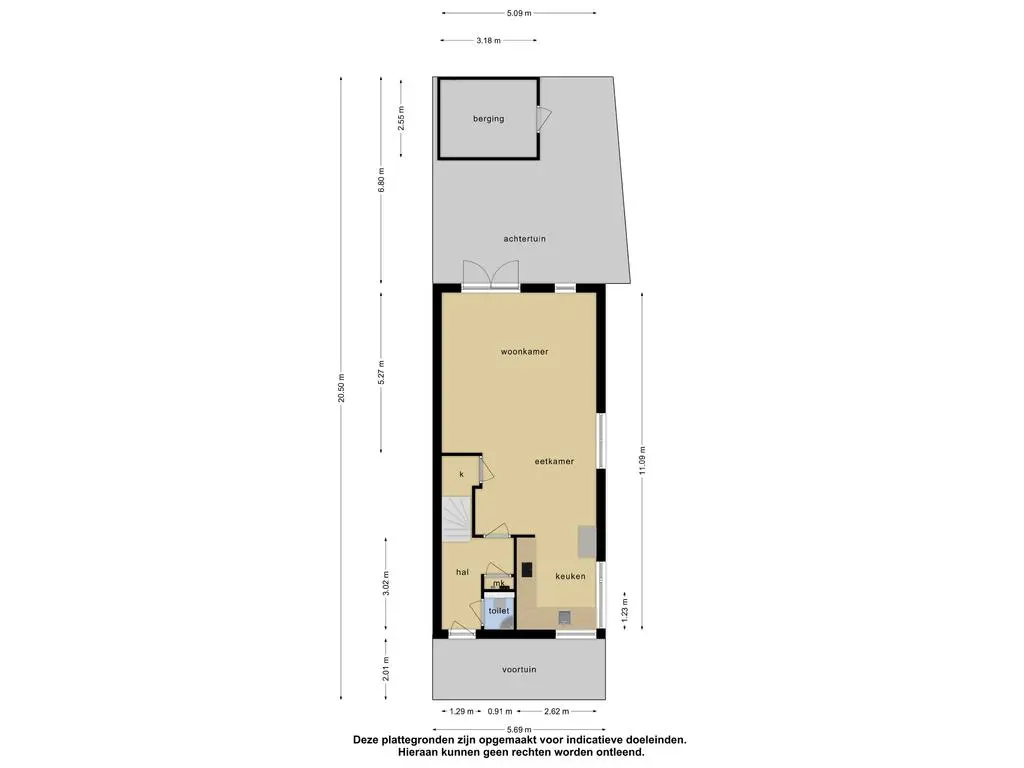 - Hal met trapopgang naar de eerste verdieping, toiletruimte met wandcloset en fonteintje en toegang tot de woonkamer;
