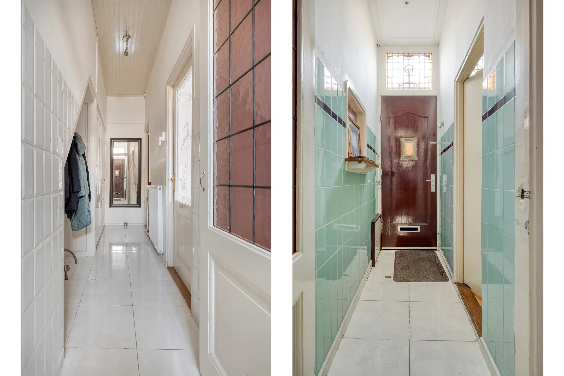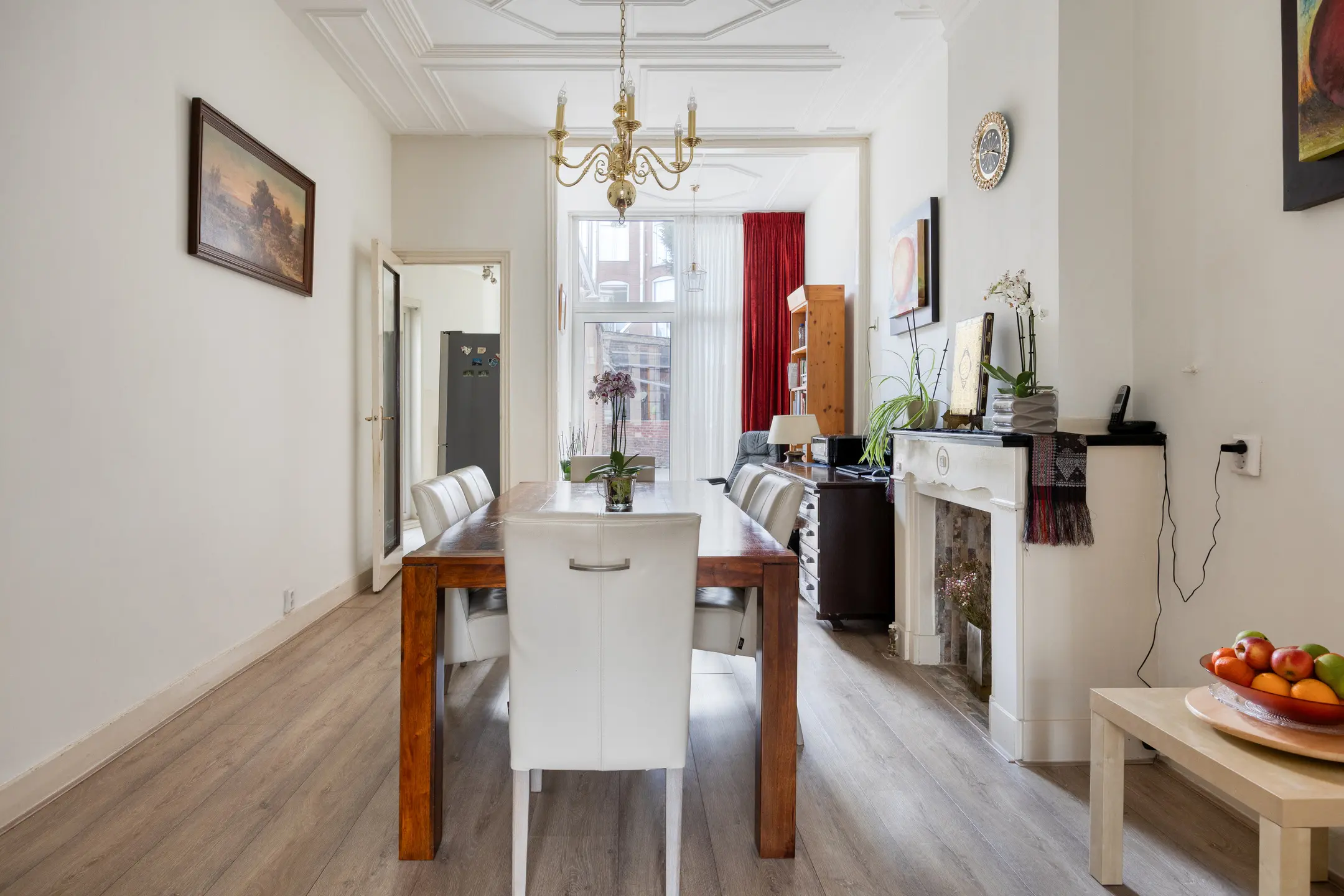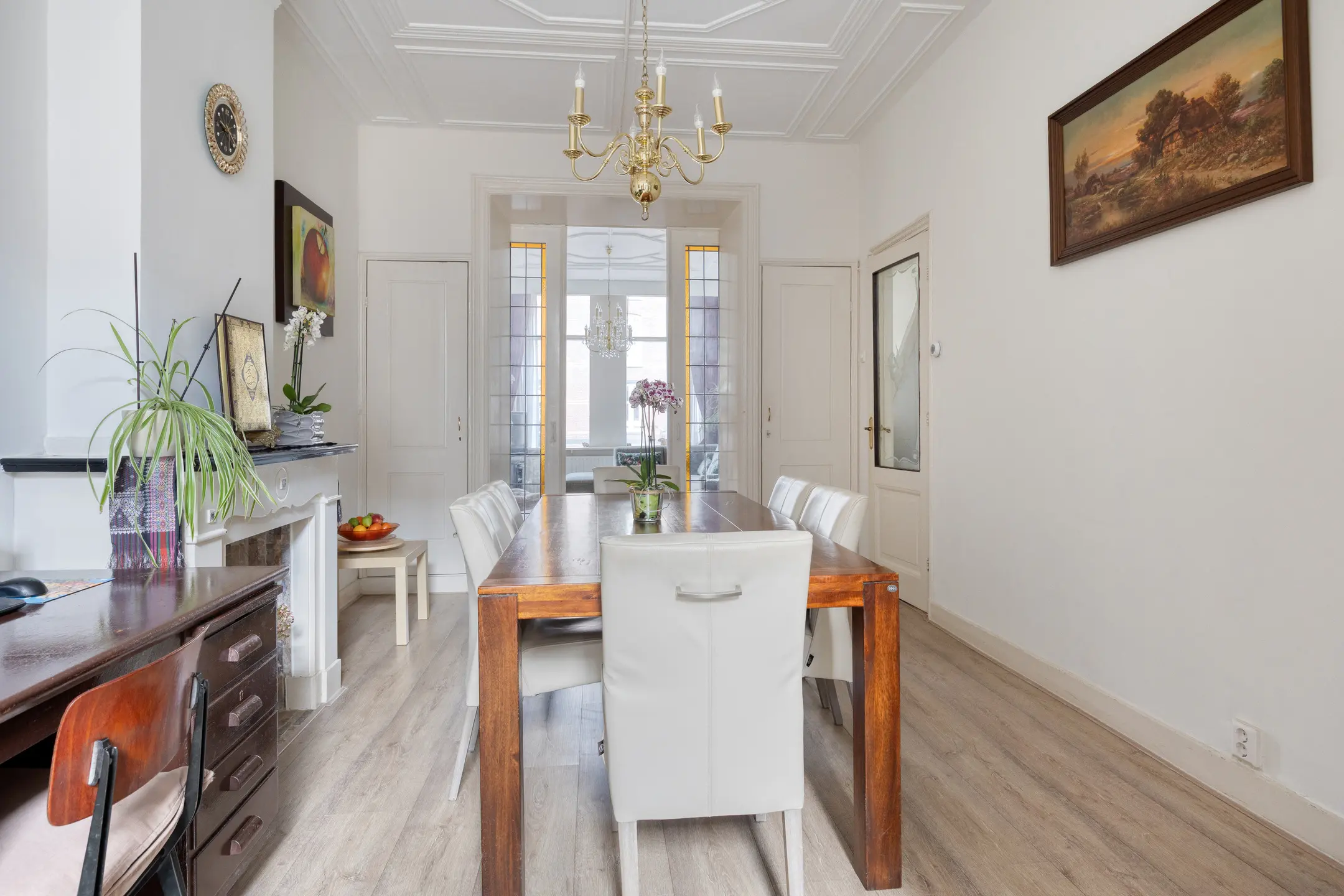 Bij binnenkomst word je verwelkomd door originele geglazuurde wandtegels in de vestibule en gang, een ware lust voor het oog voor liefhebbers van authentieke bouwstijlen. De klassieke kamer-en-suite separatie met schuifdeuren en inbouwkasten verdeelt de woning in een riante woonkamer aan de voorzijde en een gezellige eetkamer aan de tuinzijde, beide met hoge plafonds en een mooie lichtinval.