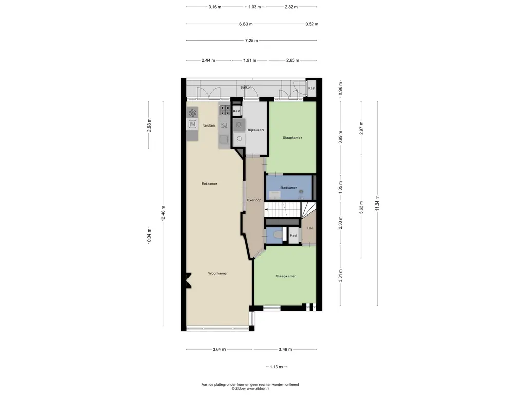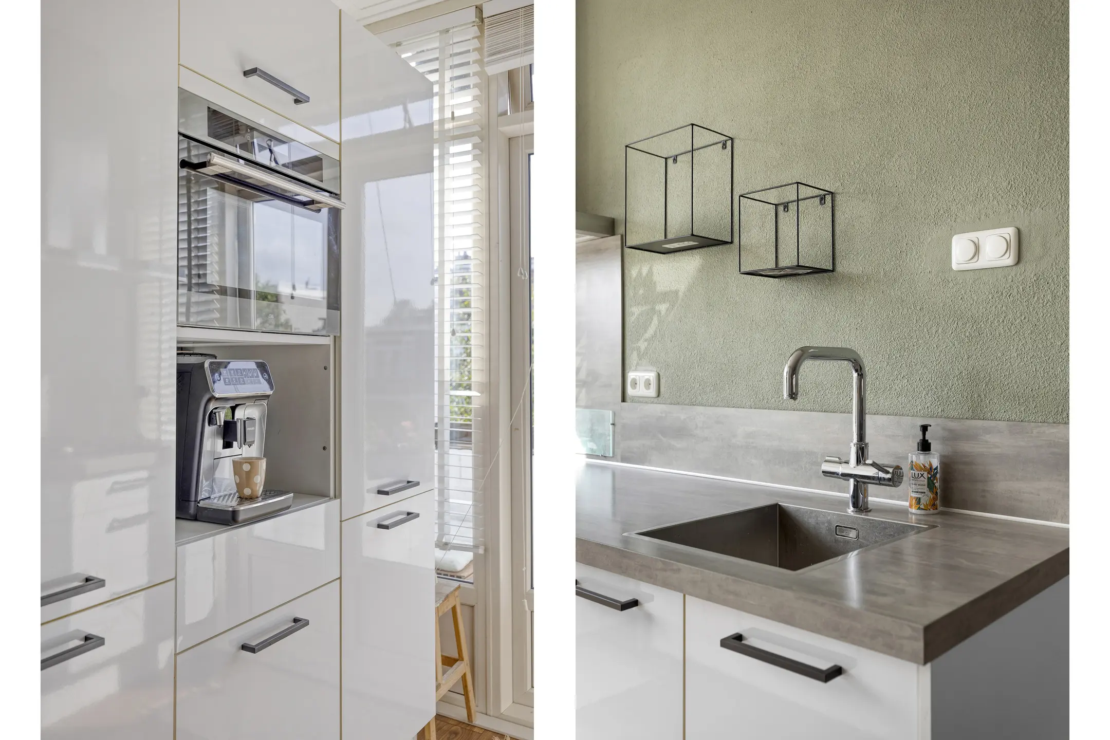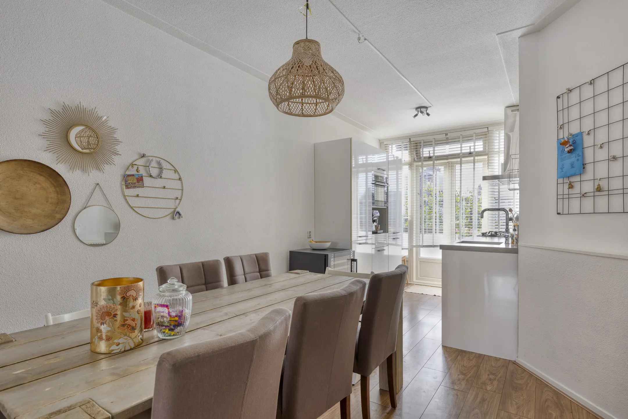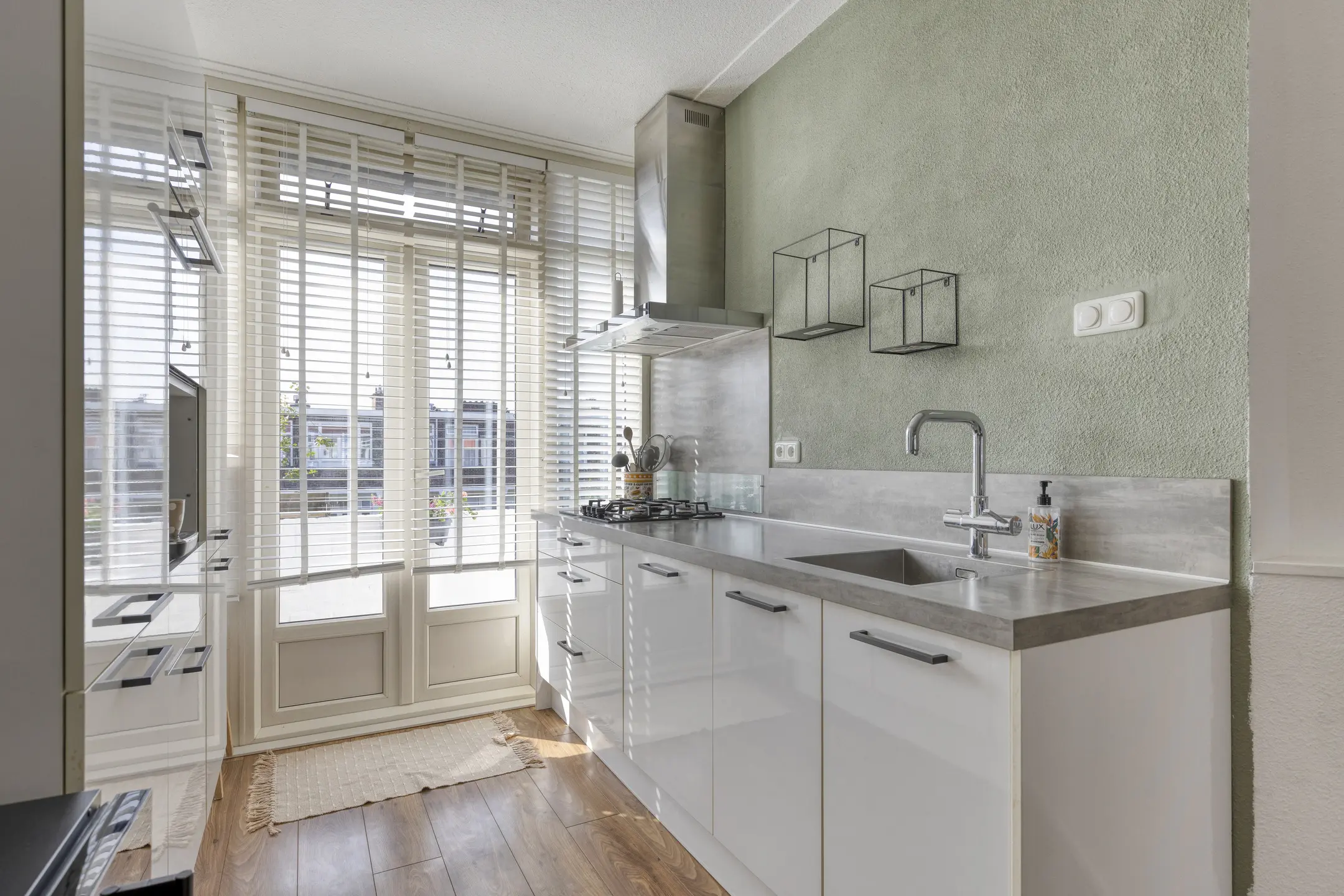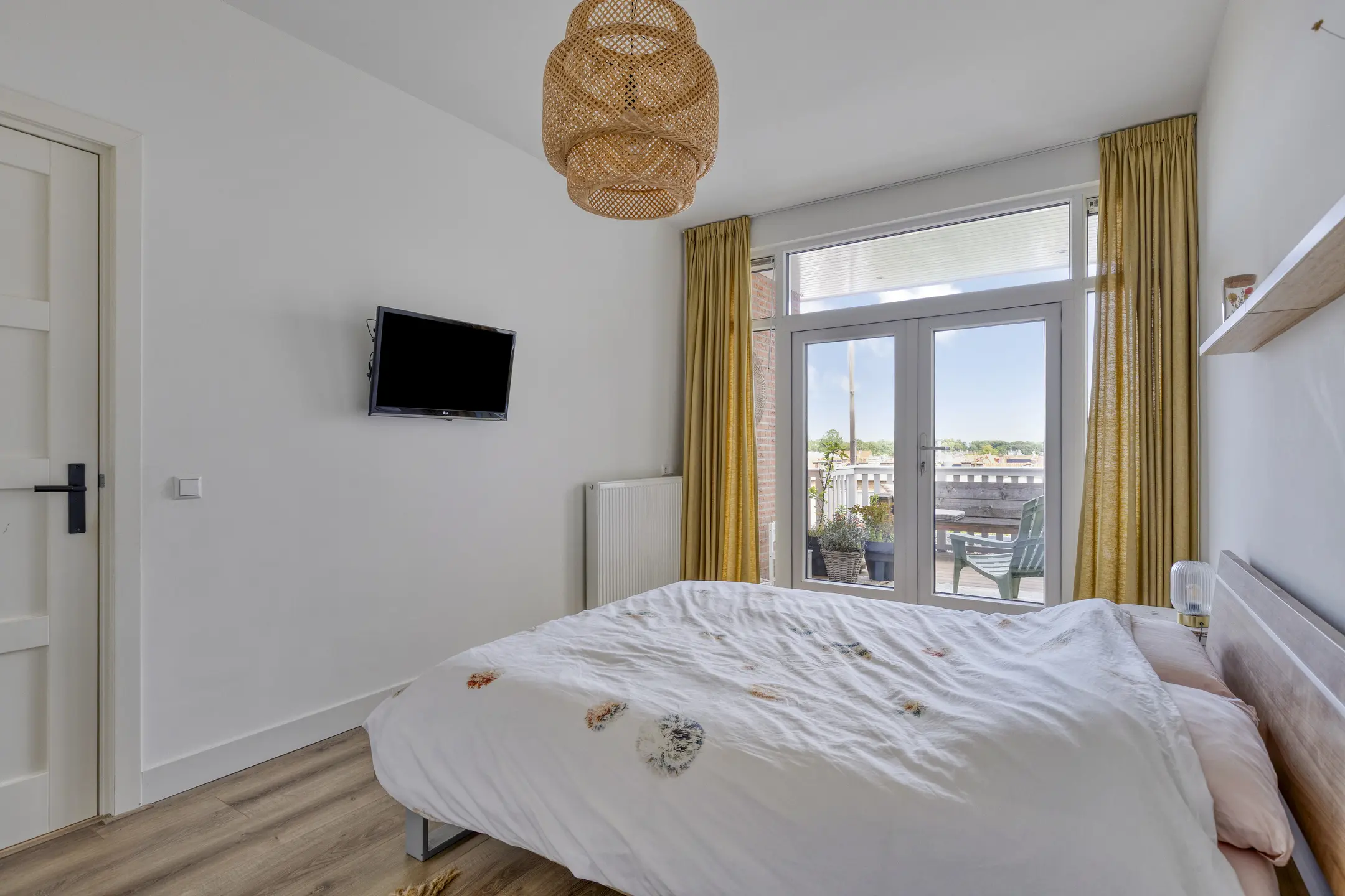 Via de voordeur bereikt u via een trap de eerste verdieping, waar een centrale overloop de diverse vertrekken met elkaar verbindt. Over de gehele lengte van de woning bevindt zich de lichte woonkamer, die doorloopt in de open keuken. Deze keuken, geplaatst in 2014, is voorzien van een koel- vriescombinatie, combimagnetron, vaatwasser, heetwaterkraan, afzuigkap en een vierpits gaskookplaat. De gehele verdieping is keurig afgewerkt met een laminaatvloer. Aan de achterzijde ligt een ruime slaapkamer van circa tien vierkante meter, met ensuite een badkamer voorzien van een inloopdouche en wastafel. Direct naast deze slaapkamer bevindt zich de bijkeuken met opstelplaats voor de wasmachine en droger. Separaat is er op deze verdieping nog een toilet aanwezig. Aan de achterzijde van de woning ligt bovendien een ruim balkon over de volle breedte, waar u heerlijk kunt genieten van de buitenlucht.