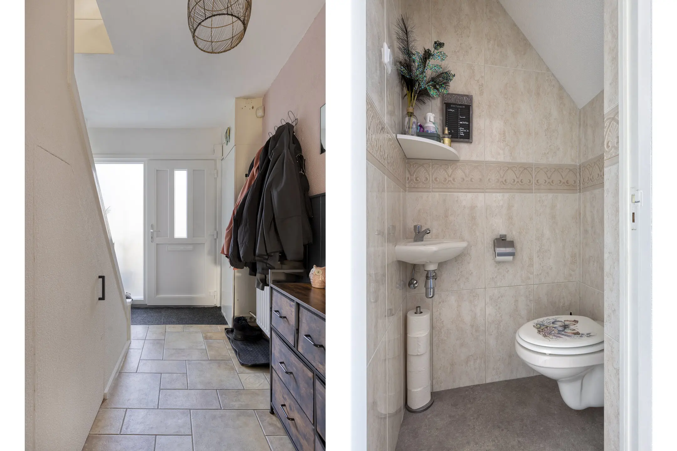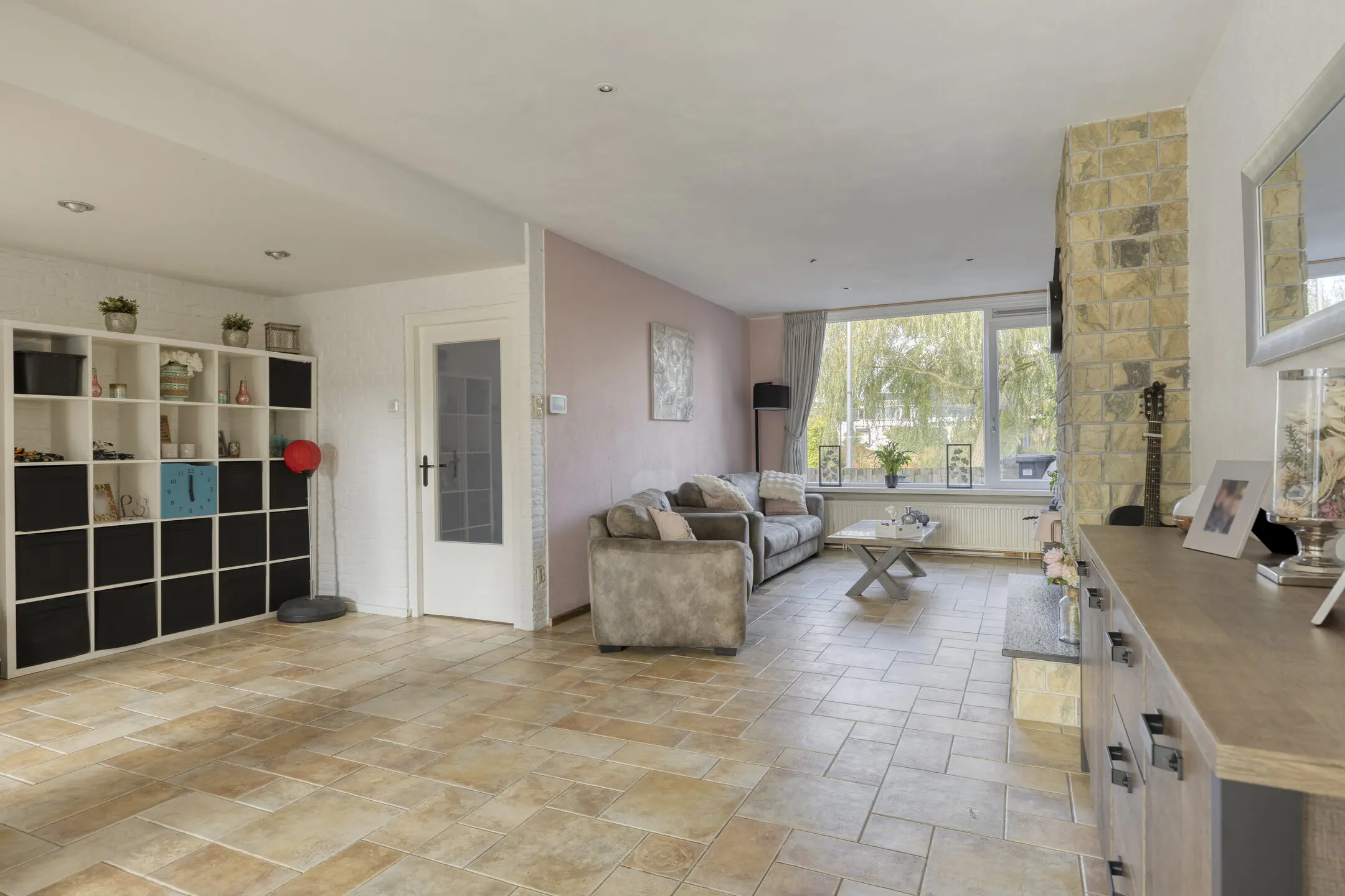 Aan de voorzijde van de woning ligt een verzorgde voortuin waar u in alle rust kunt genieten van het uitzicht op het water. Via de voordeur betreedt u de woning en komt u in de ruime hal met de trapopgang naar de eerste verdieping en een toilet. Vanuit de hal bereikt u de woonkamer, die over de gehele diepte van de woning loopt en dankzij de grote raampartijen aan zowel de voor- als achterzijde heerlijk licht is. De woonkamer is afgewerkt met een fraaie plavuizen vloer met vloerverwarming en beschikt over een sfeervolle open haard.