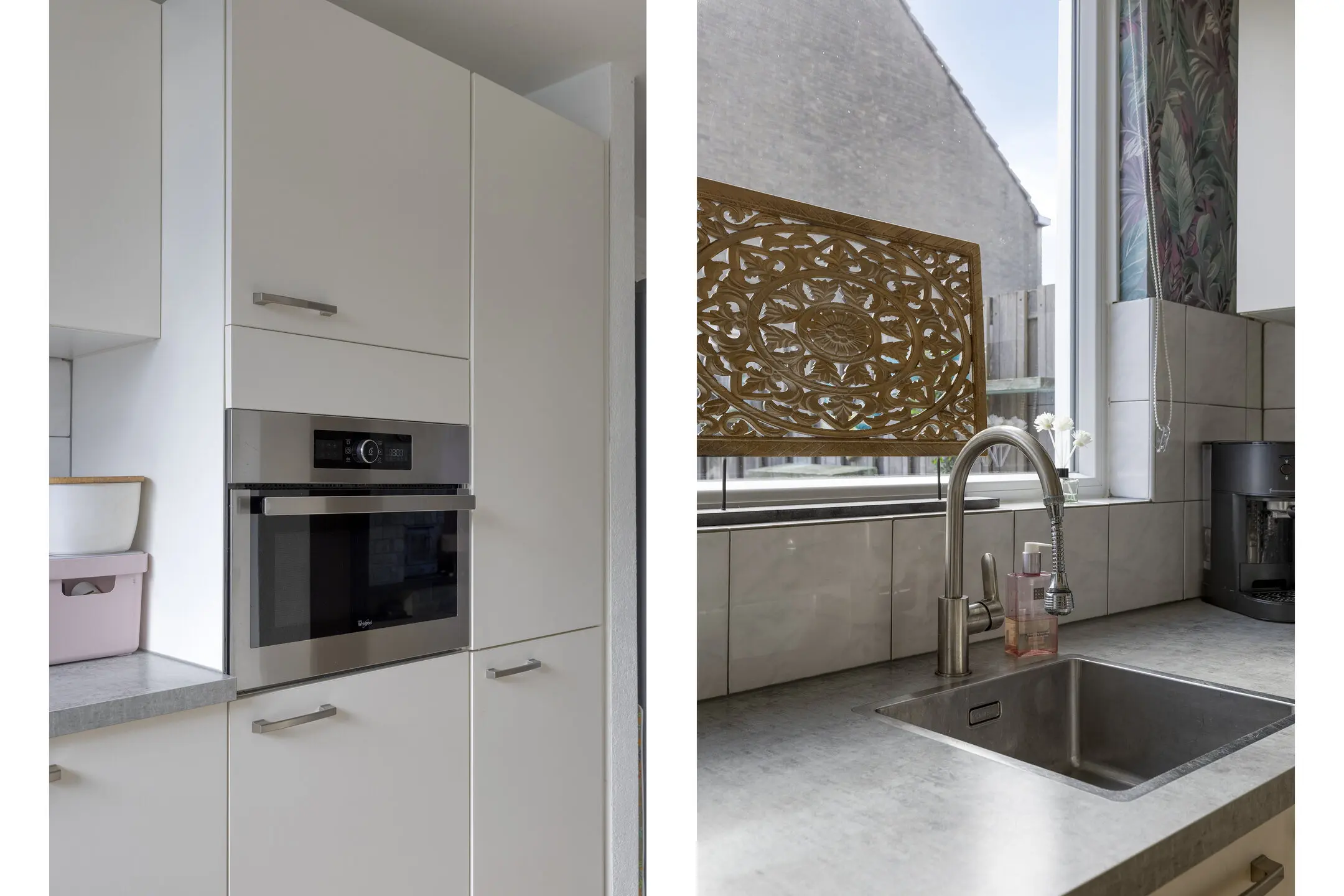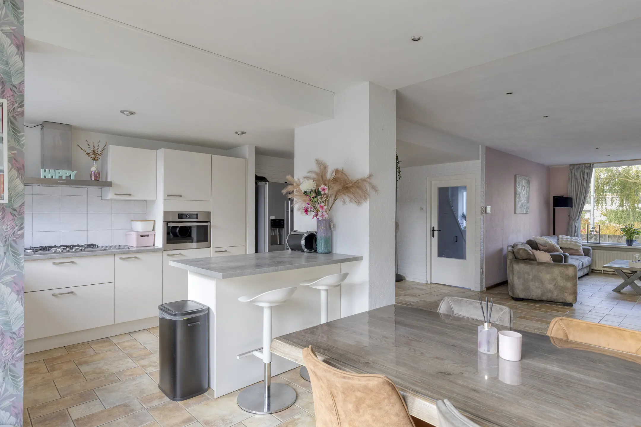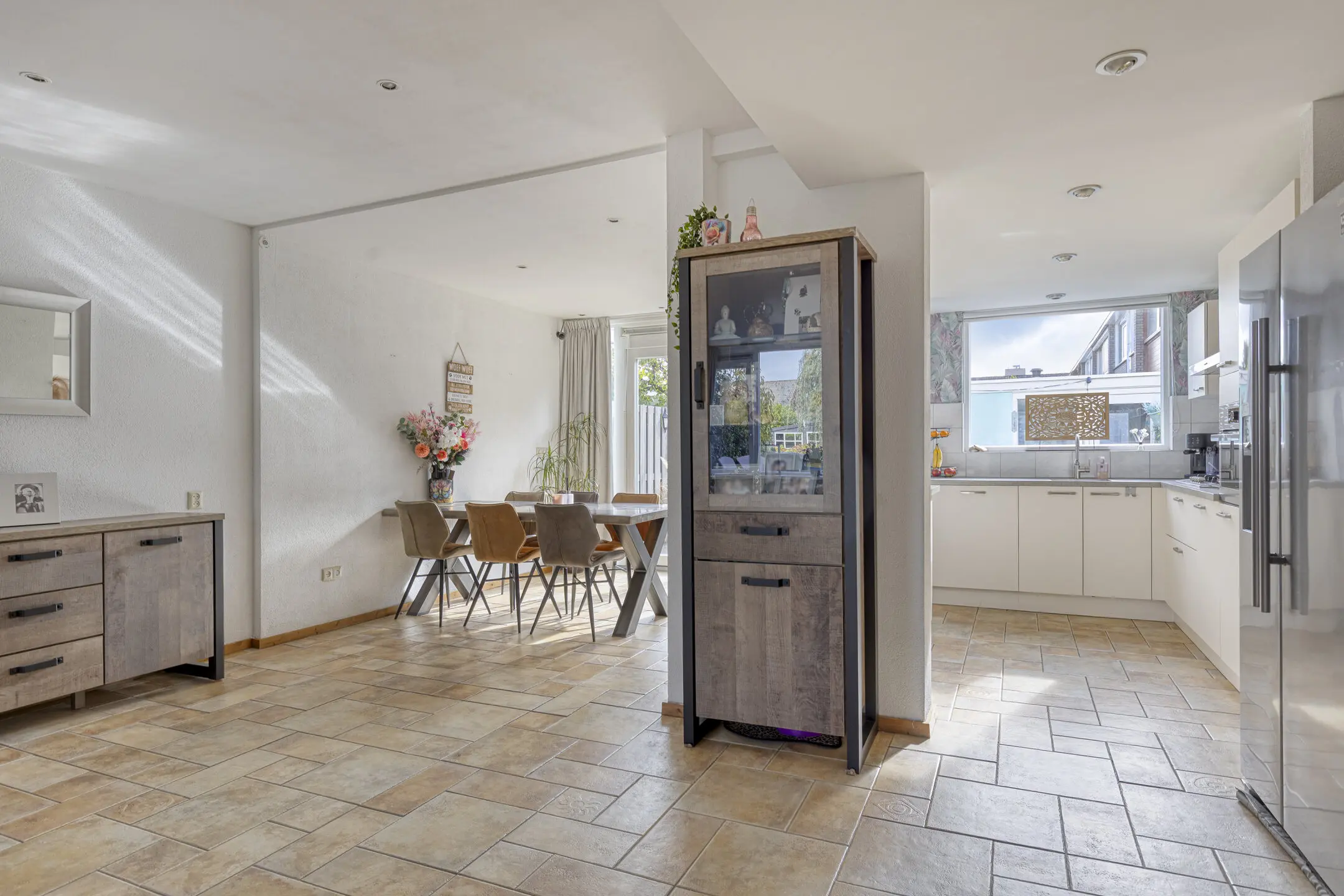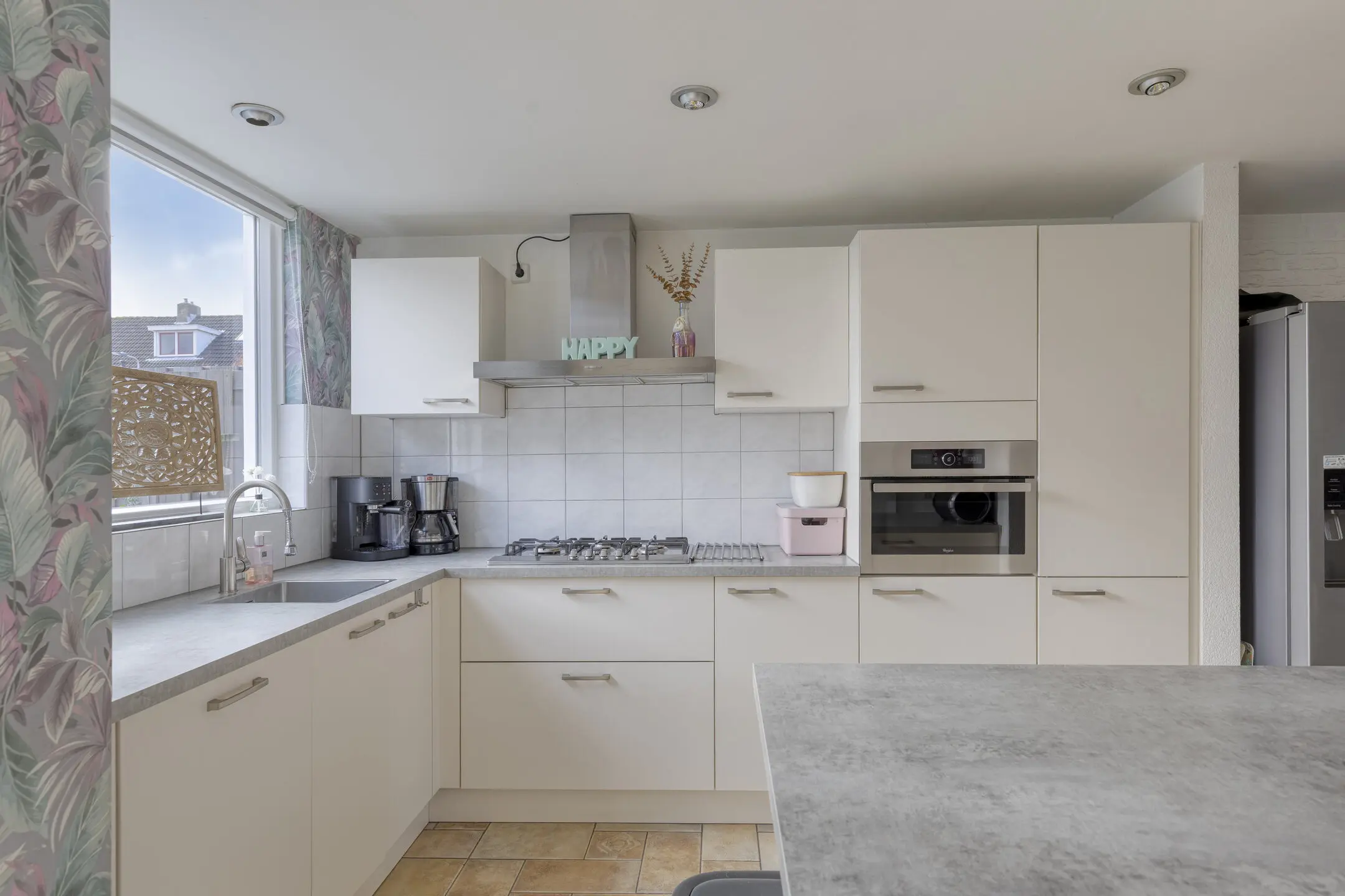 Aan de achterzijde is de woning ruim uitgebouwd, waardoor er maar liefst zeventien vierkante meter extra leefruimte is ontstaan. In deze uitbouw bevindt zich de open keuken, die in 2017 is geplaatst. De keuken is modern uitgevoerd en voorzien van diverse inbouwapparatuur, waaronder een combimagnetron, vaatwasser, vijfpits gaskookplaat, afzuigkap en een boiler. Daarnaast staat er een ruime Amerikaanse koelkast die ter overname wordt aangeboden. De uitbouw biedt bovendien een prettige verbinding met de achtertuin, waardoor binnen en buiten mooi in elkaar overlopen.