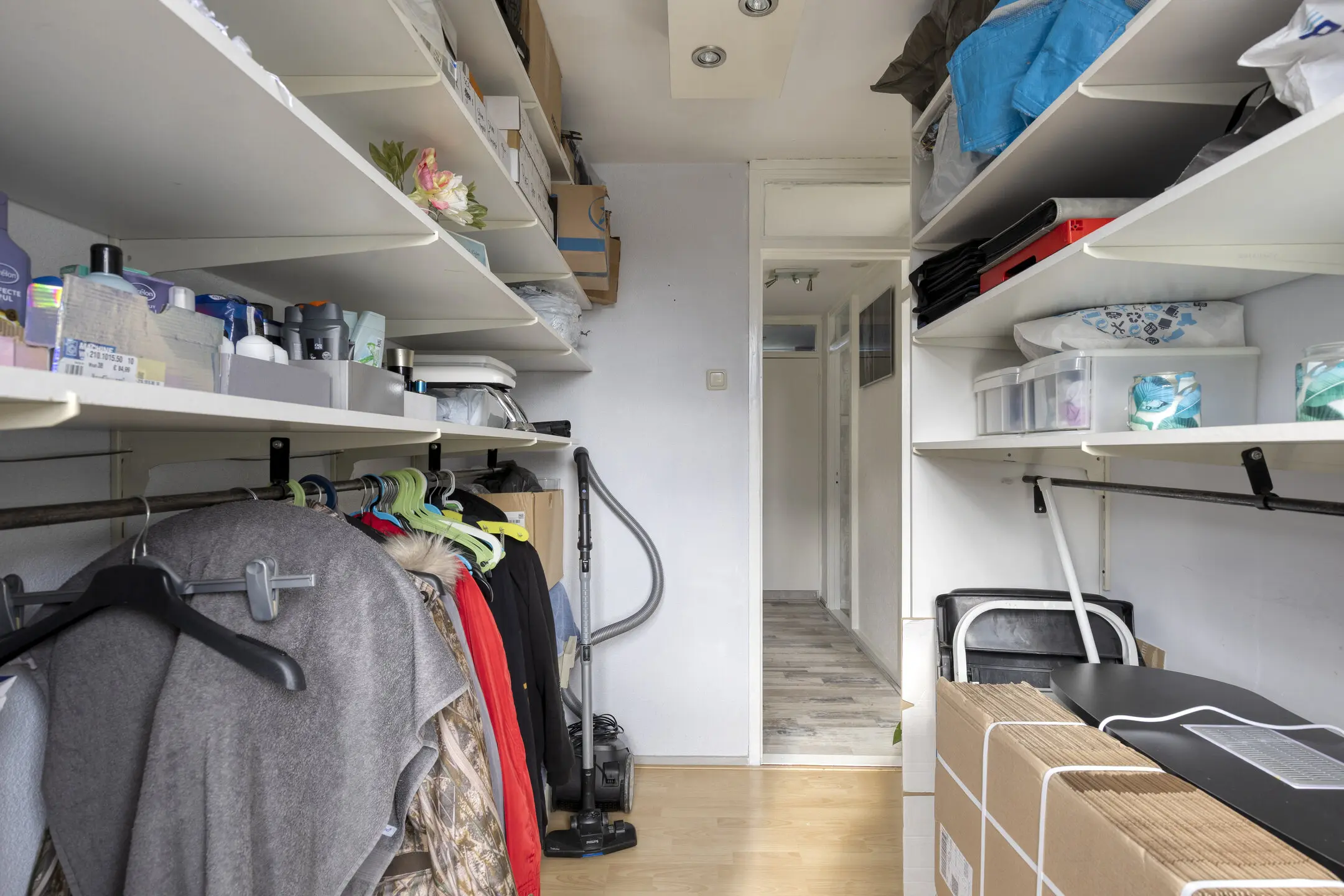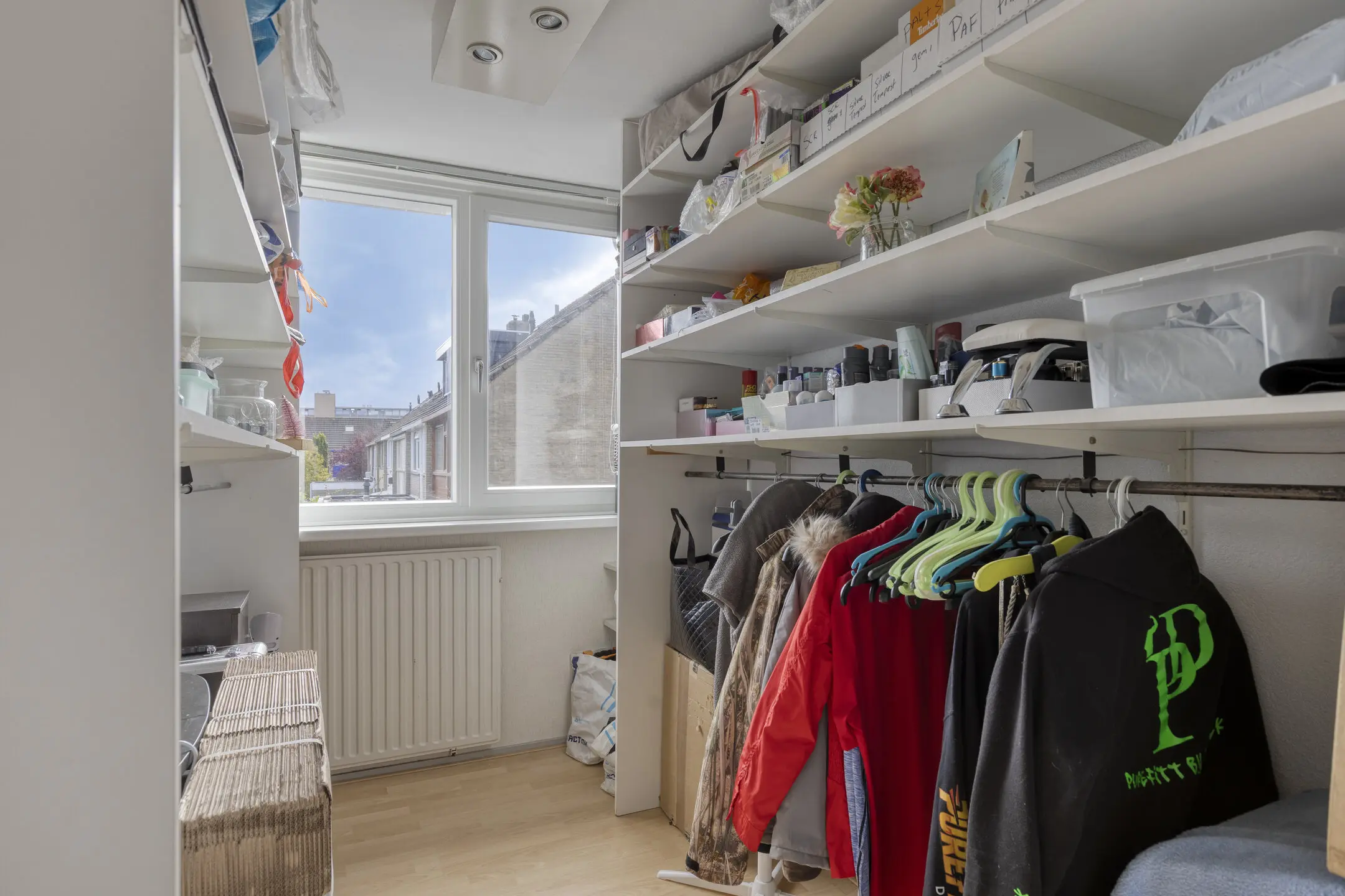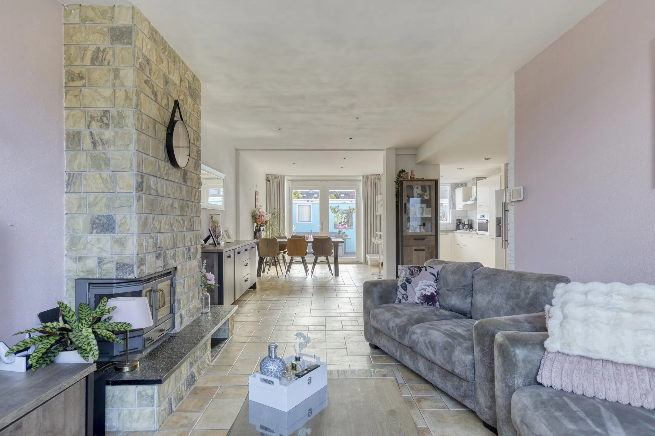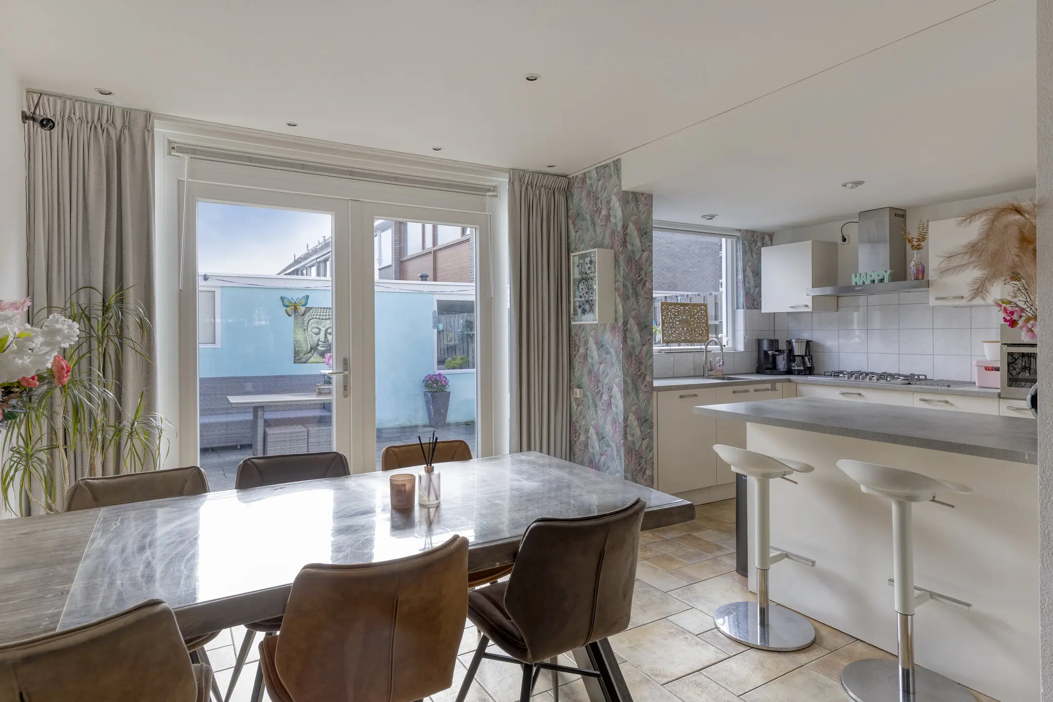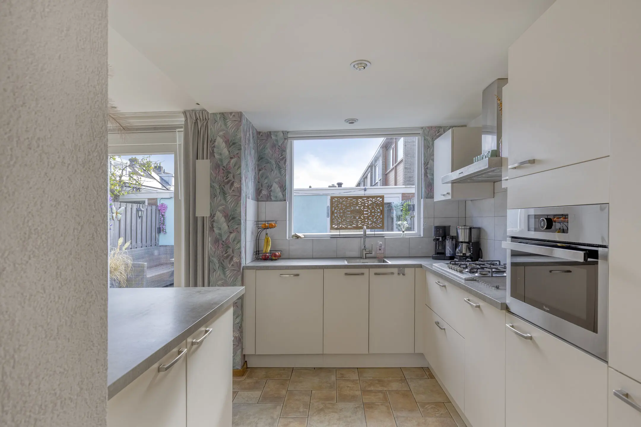 Aan de achterzijde is de woning ruim uitgebouwd, waardoor er maar liefst zeventien vierkante meter extra leefruimte is ontstaan. In deze uitbouw bevindt zich de open keuken, die in 2017 is geplaatst. De keuken is modern uitgevoerd en voorzien van diverse inbouwapparatuur, waaronder een combimagnetron, vaatwasser, vijfpits gaskookplaat, afzuigkap en een boiler. Daarnaast staat er een ruime Amerikaanse koelkast die ter overname wordt aangeboden. De uitbouw biedt bovendien een prettige verbinding met de achtertuin, waardoor binnen en buiten mooi in elkaar overlopen.