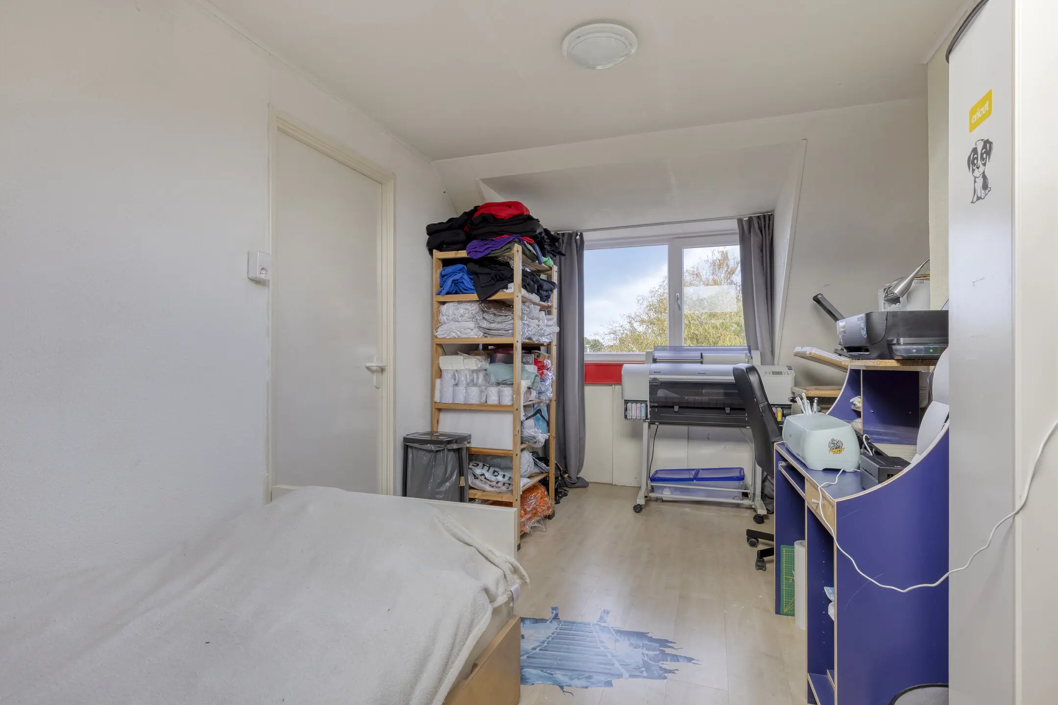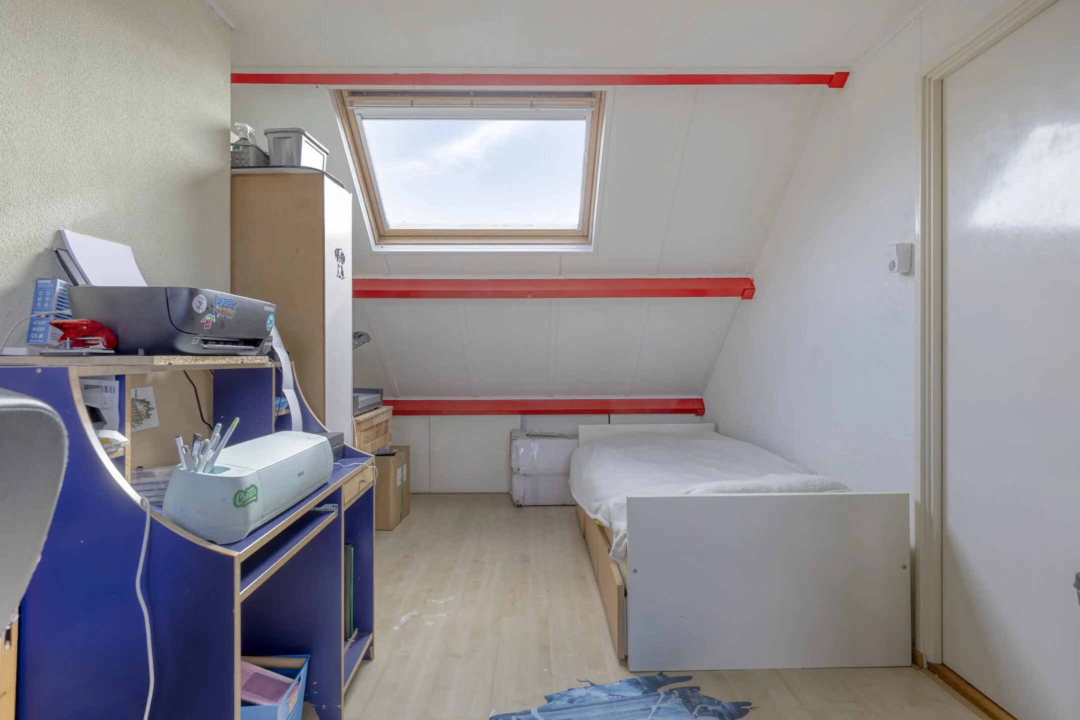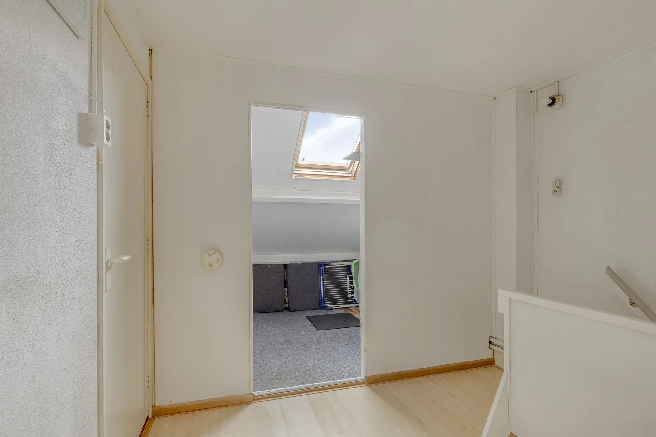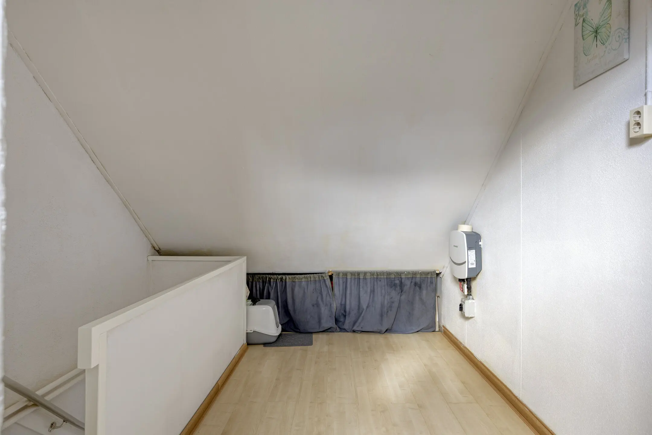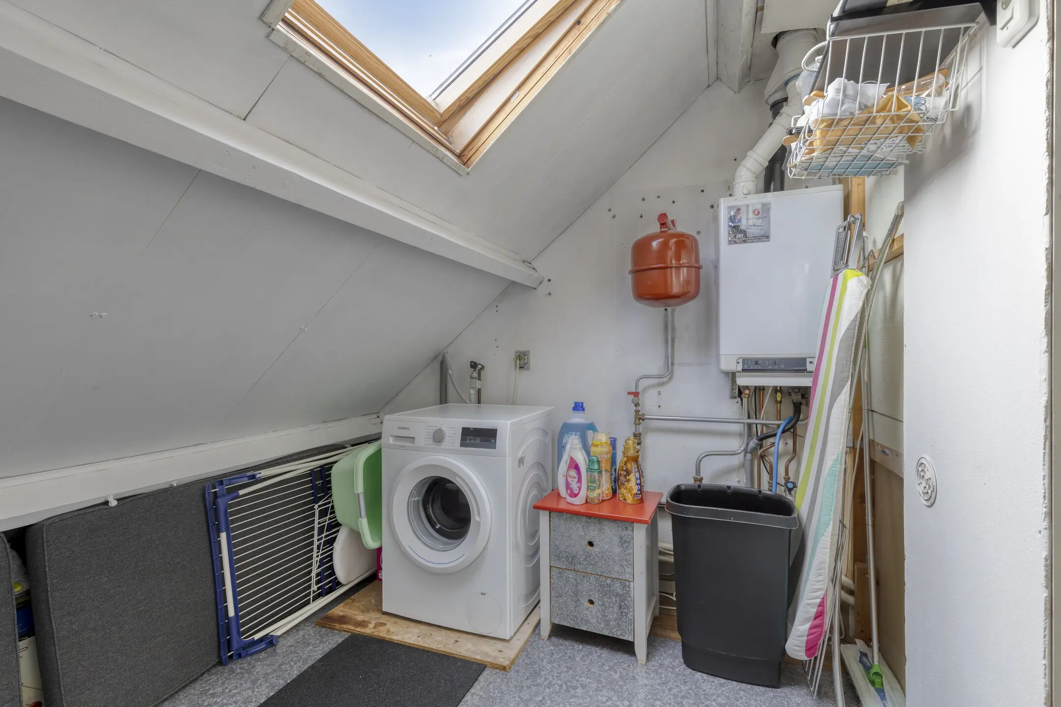 De trapopgang loopt door naar de tweede verdieping. Hier bevindt zich een praktische wasruimte met de opstelplaats van de cv-ketel (uit 2018) en daarnaast een ruime kamer van ongeveer vijftien vierkante meter. Deze ruimte kan uitstekend dienen als extra slaapkamer, hobbykamer of kantoor.
