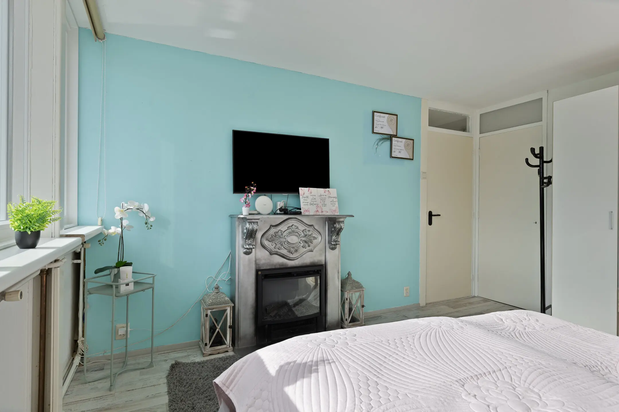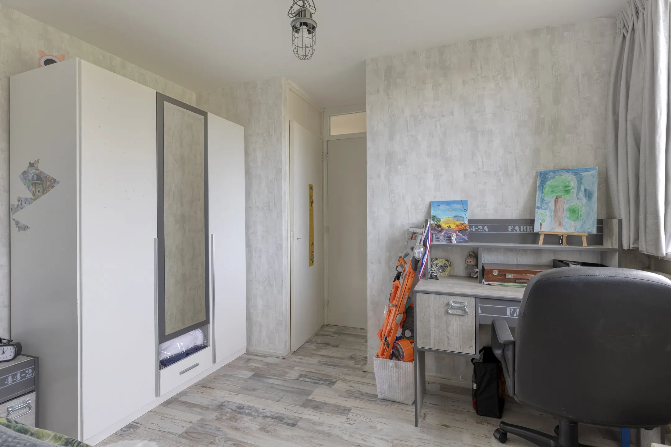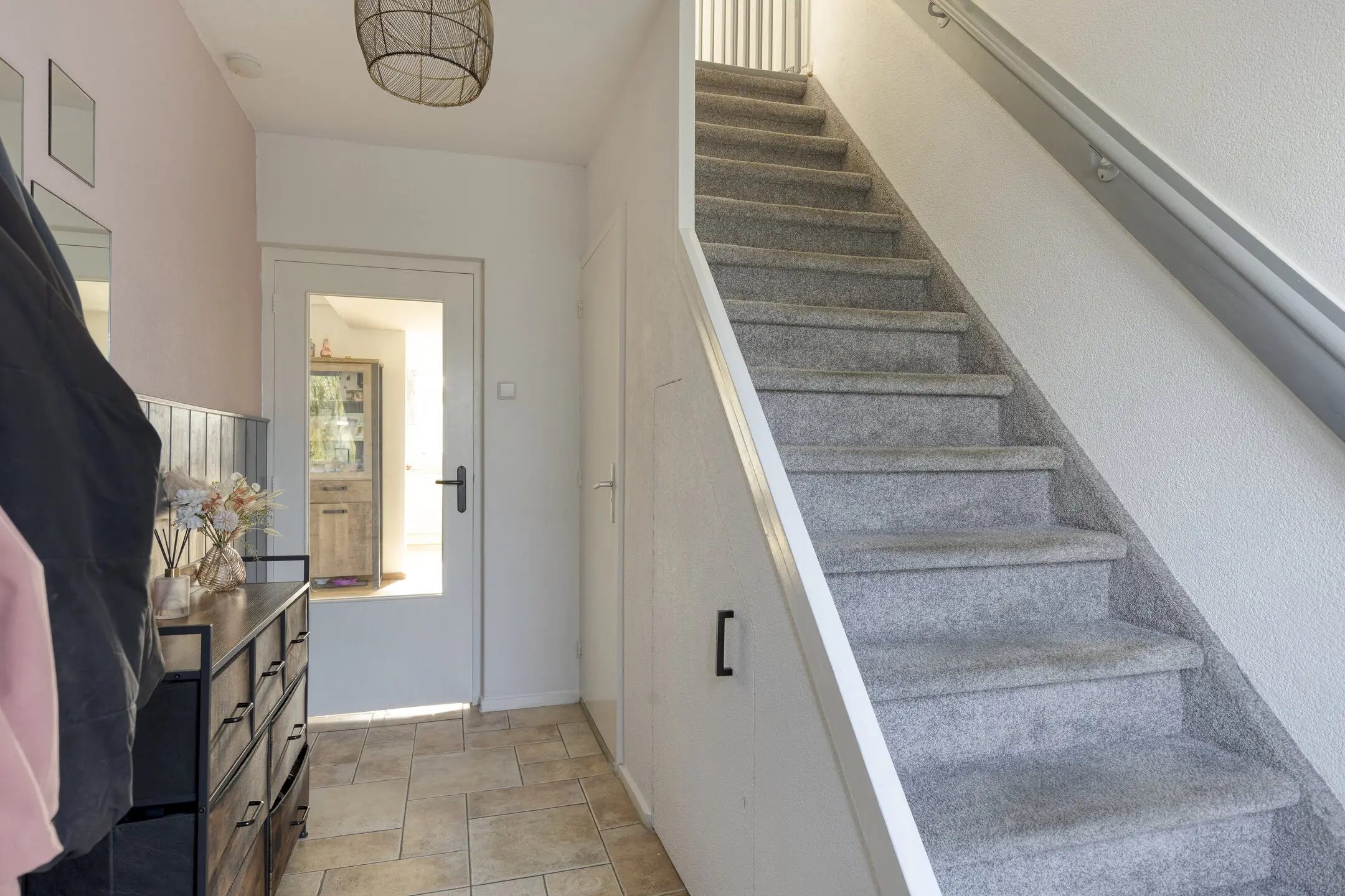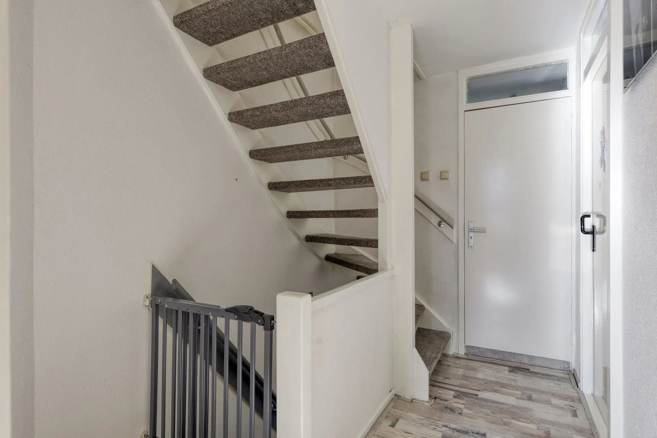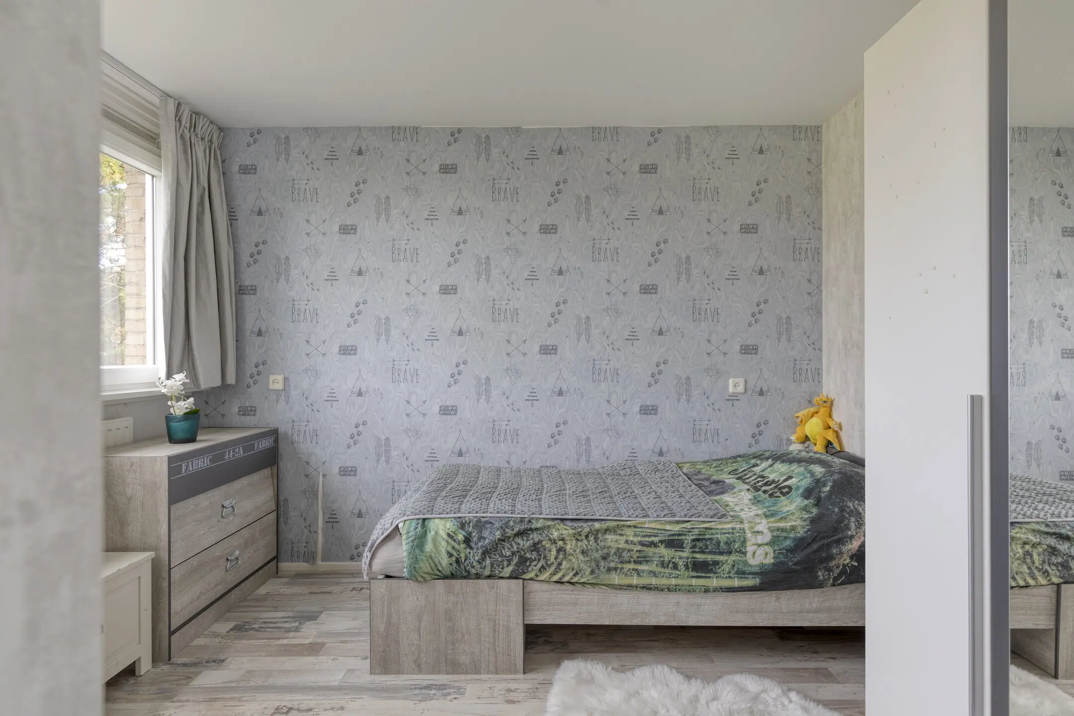 De trapopgang loopt door naar de tweede verdieping. Hier bevindt zich een praktische wasruimte met de opstelplaats van de cv-ketel (uit 2018) en daarnaast een ruime kamer van ongeveer vijftien vierkante meter. Deze ruimte kan uitstekend dienen als extra slaapkamer, hobbykamer of kantoor.