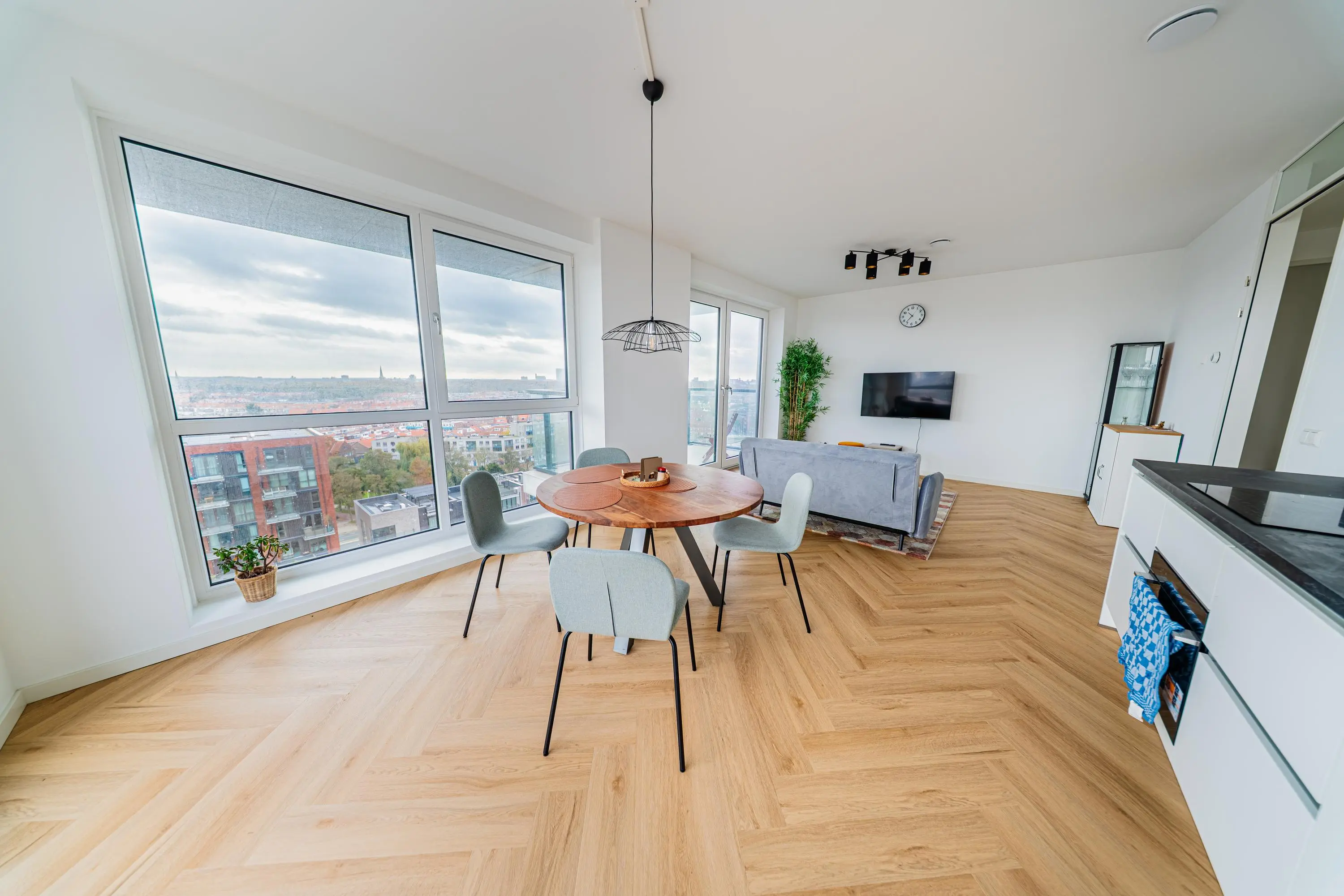 De lichte en royale woonkamer is een heerlijke leefruimte, mede door de grote raampartijen en de prettige open indeling. Hier bevindt zich de moderne open keuken, die volledig in de woonkamer is geïntegreerd. Deze is uitgerust met een inductiekookplaat, moderne apparatuur en volop kastruimte.