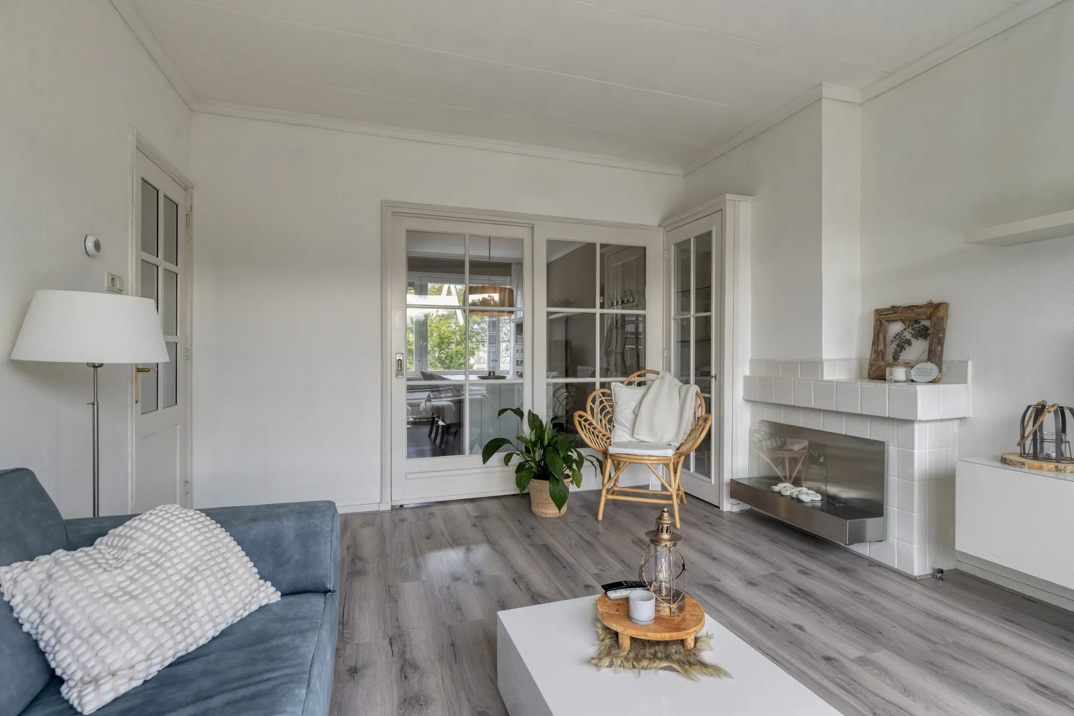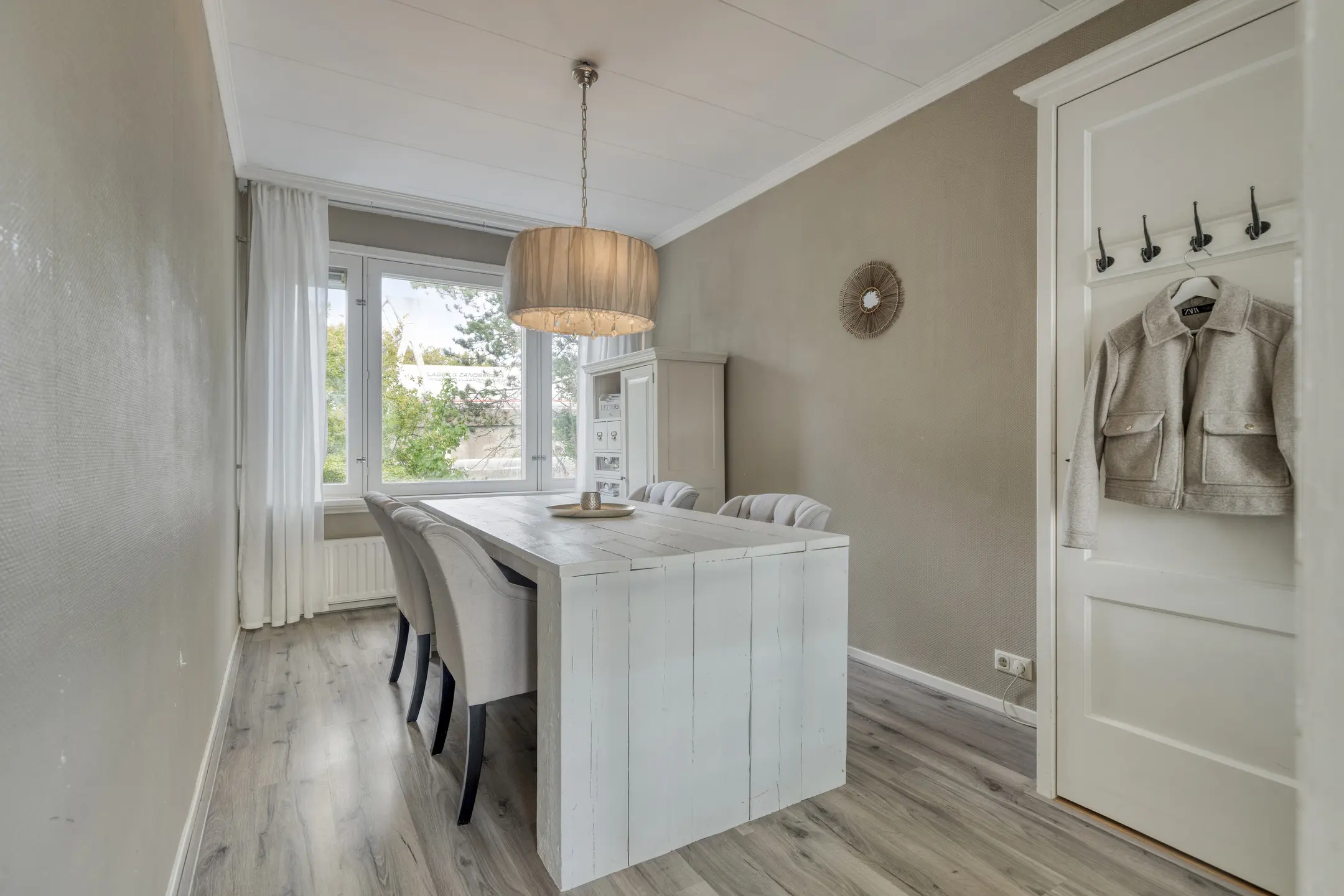 De entree bevindt zich op de begane grond, waarna een trap toegang geeft tot de eerste verdieping. Vanuit de overloop zijn de verschillende vertrekken bereikbaar. Aan de achterzijde ligt de woonkamer van ruim zeventien vierkante meter. Grote raampartijen zorgen hier voor veel licht en geven de ruimte een open en ruimtelijk gevoel. Via ensuite deuren is de eetkamer aan de voorzijde van de woning bereikbaar. Deze kamer meet bijna dertien vierkante meter en biedt volop mogelijkheden voor een grote eettafel of een gezellige zitruimte.