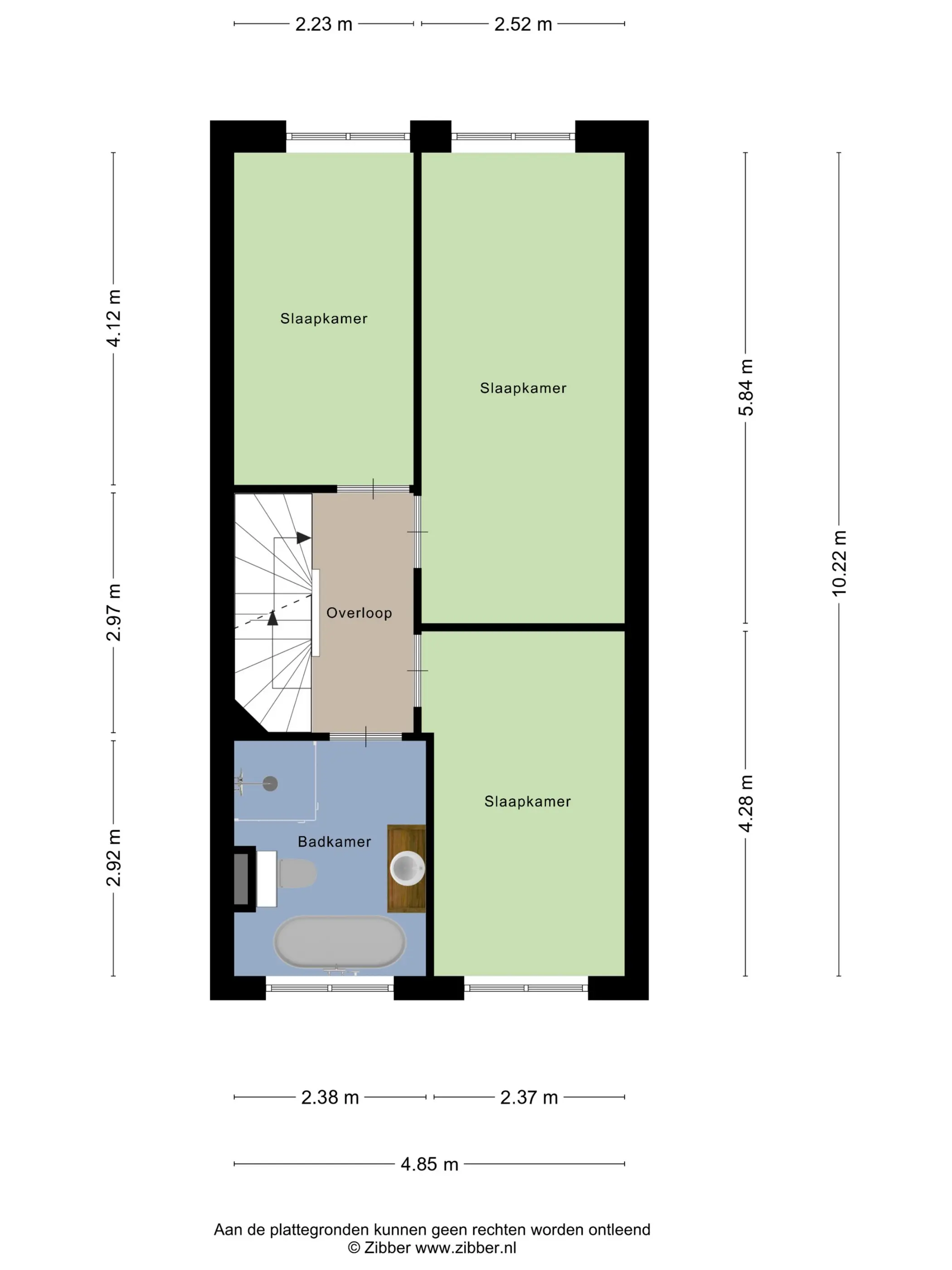 Op de eerste verdieping verbindt de overloop drie ruime slaapkamers van circa 9, 10 en 14 vierkante meter, allen voorzien van een fraaie laminaatvloer. De moderne badkamer is volledig betegeld en uitgerust met een inloopdouche, toilet, wastafel met meubel en een prachtig losstaand ligbad.